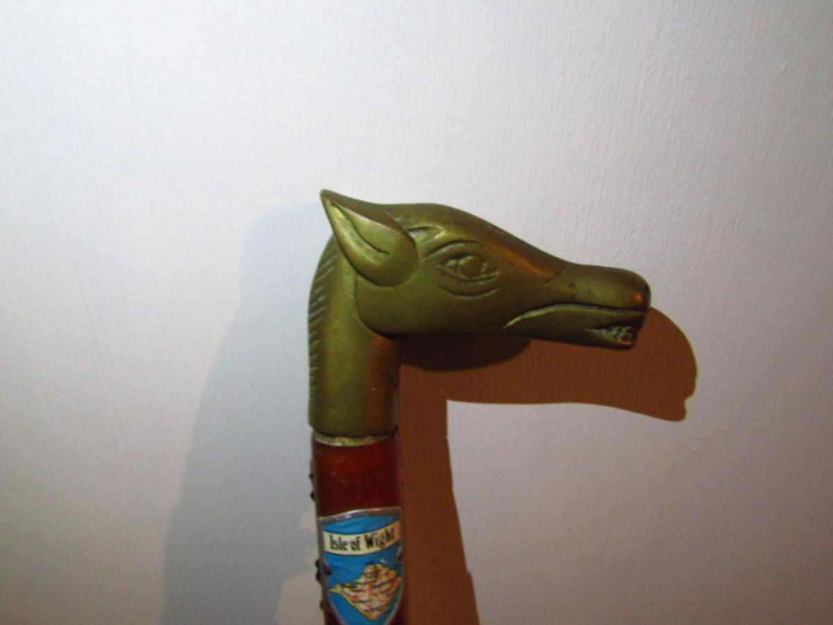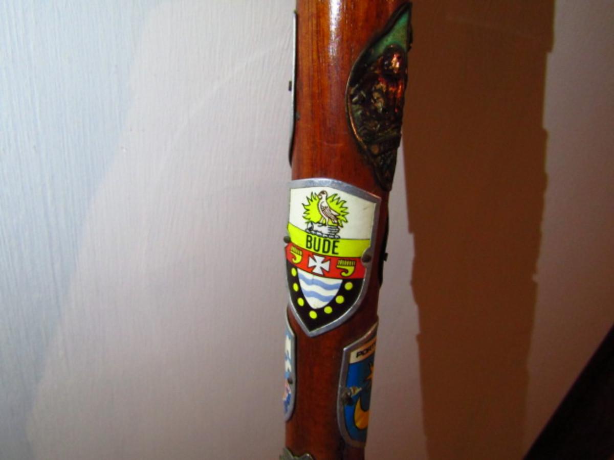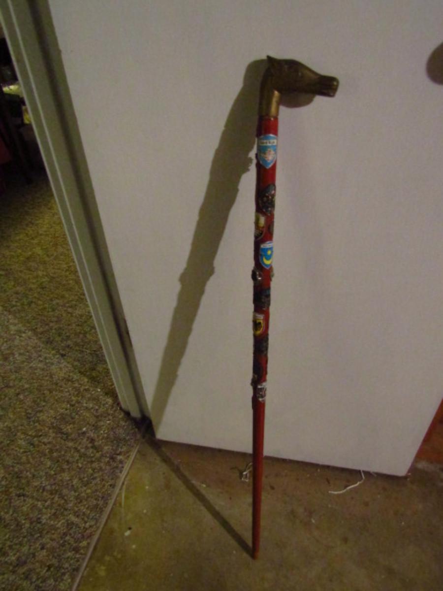 Wooden Walking Stick- Metal Horse Head Grip with Nice Selection of Medallions (#558). Must see in person to appreciate.