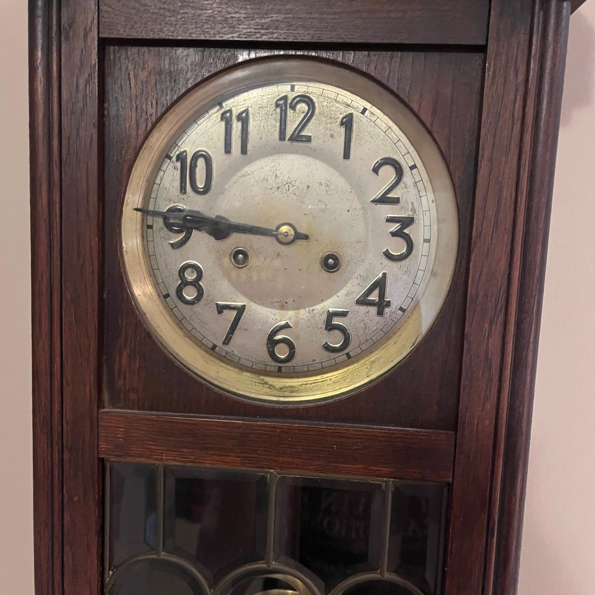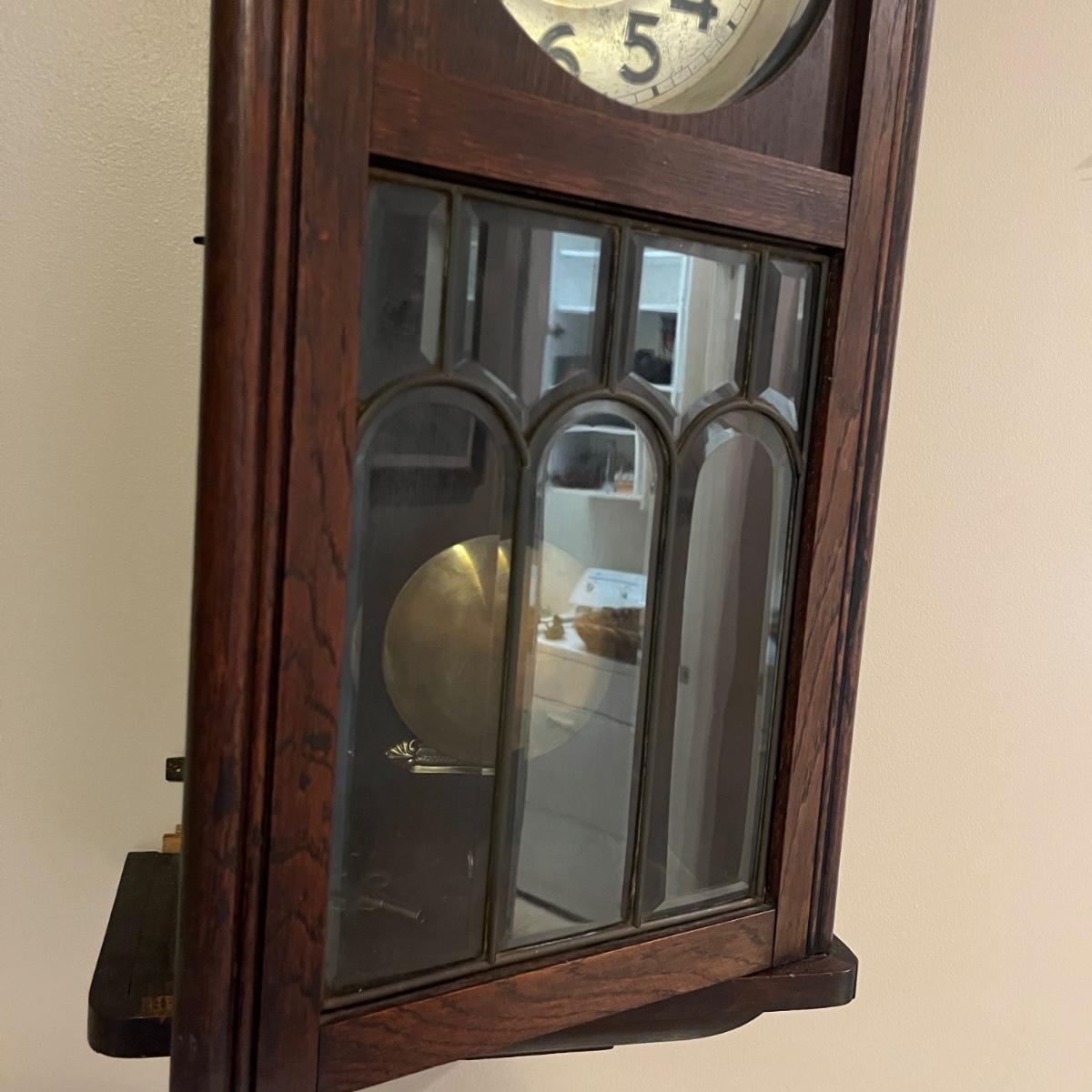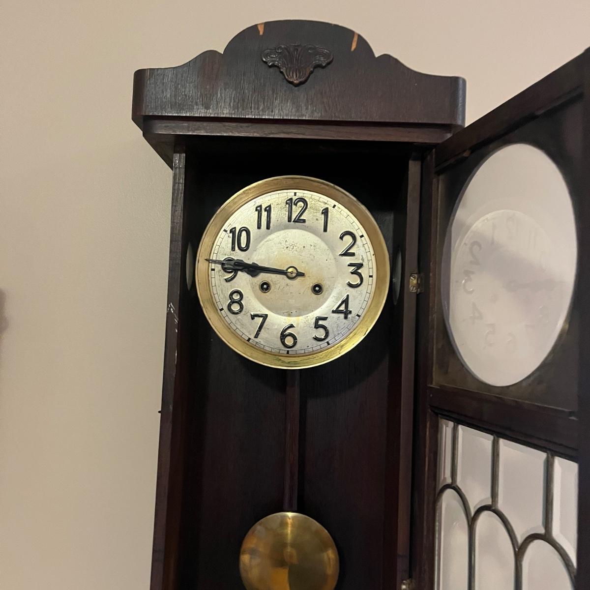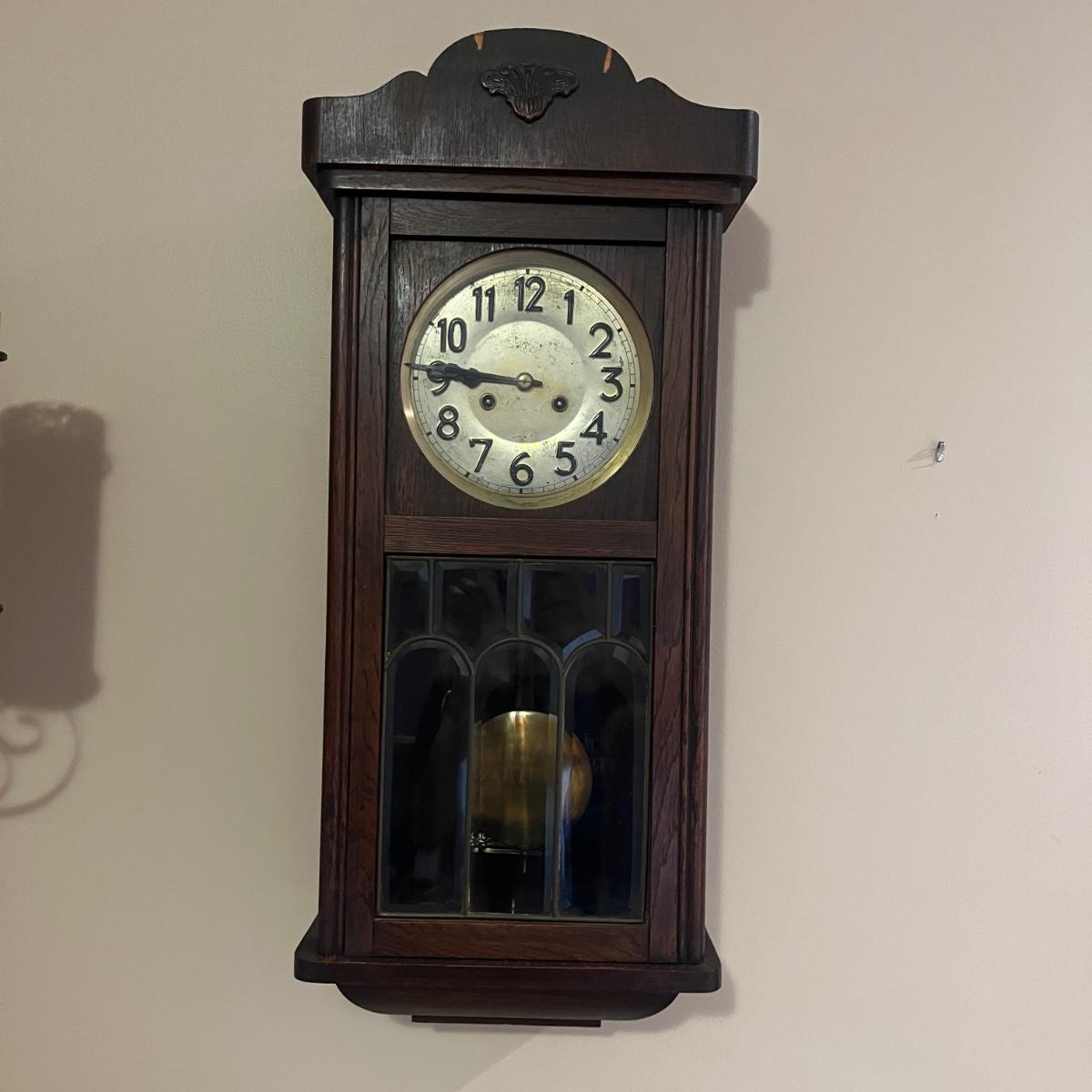 Lot includes a wooden bodied wall clock with pendulum and a leaded glass door. Also includes key. Clock measures 12.5” x 6” x 30”H. Clock was not tested.