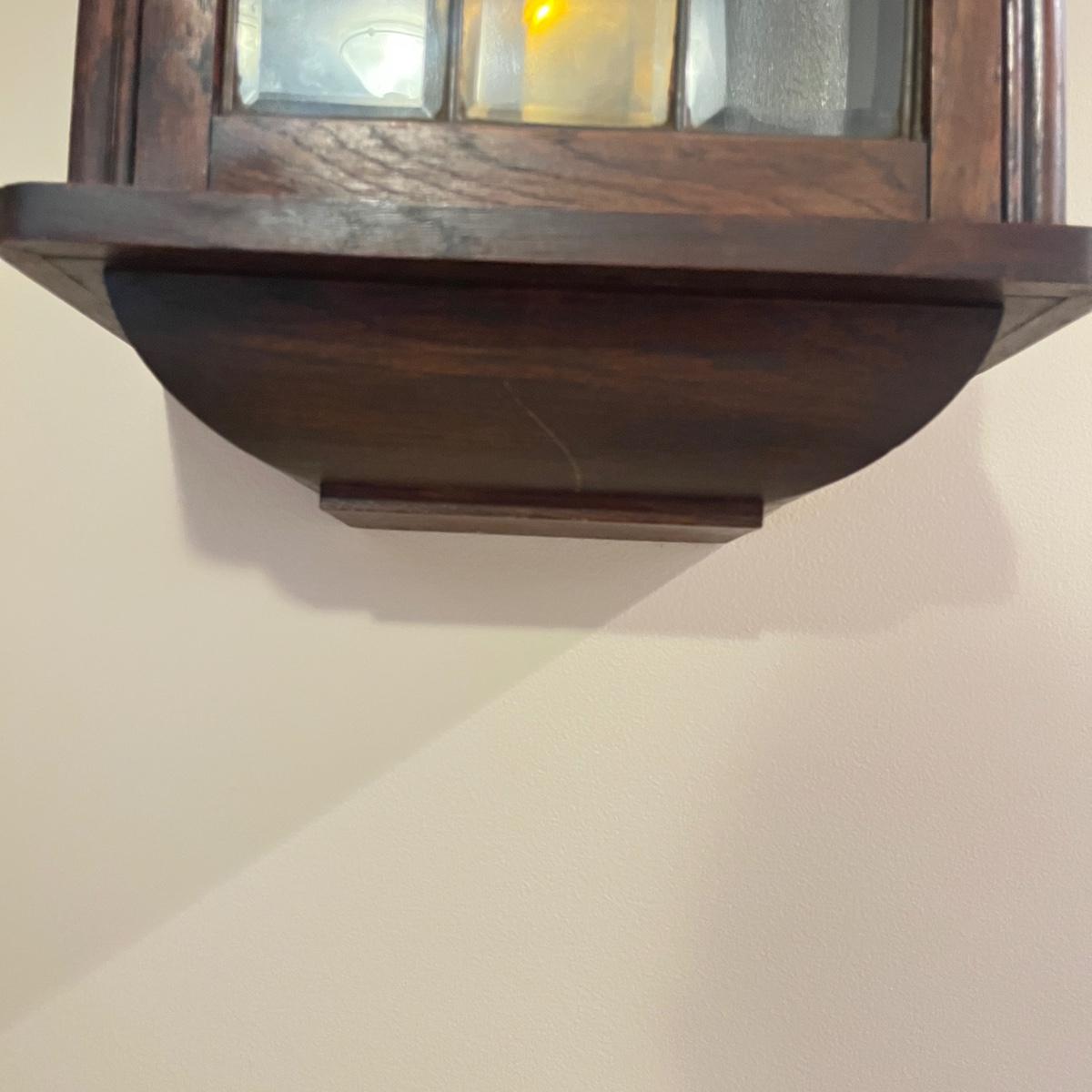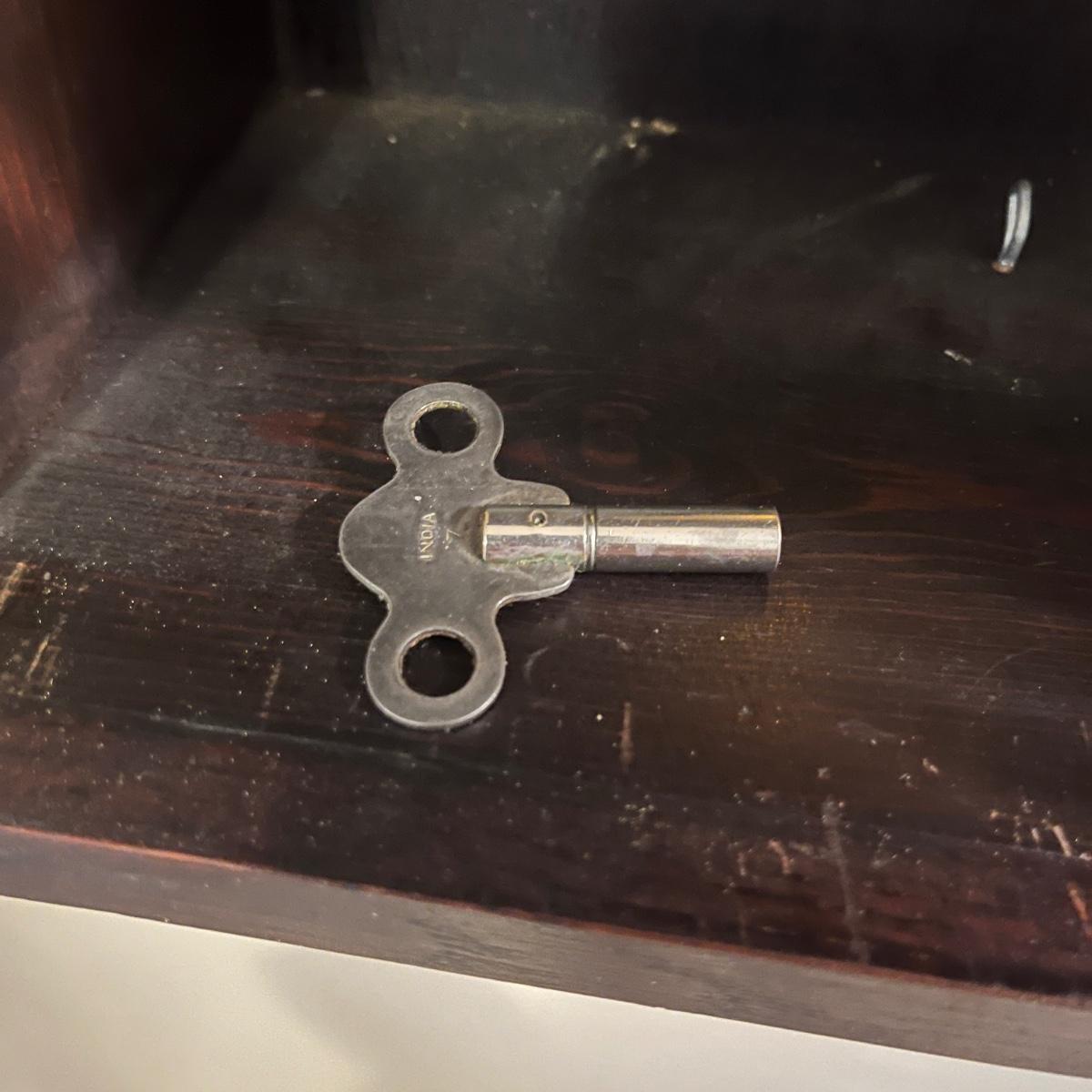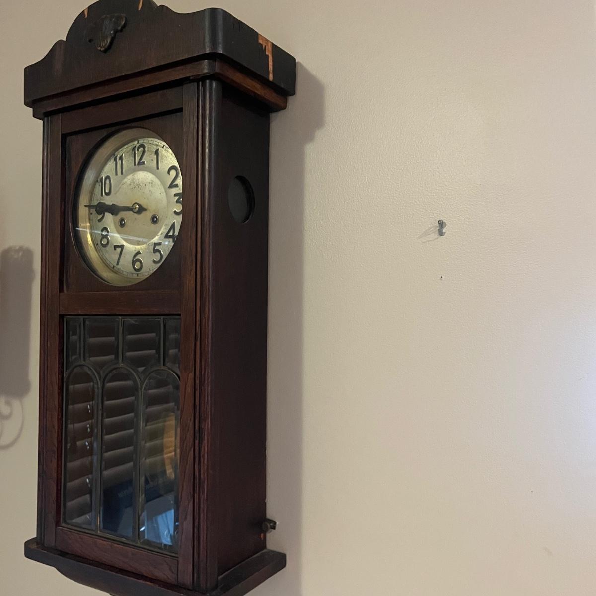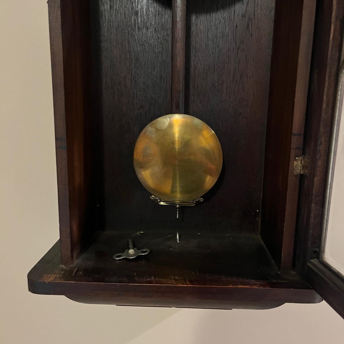 Lot includes a wooden bodied wall clock with pendulum and a leaded glass door. Also includes key. Clock measures 12.5” x 6” x 30”H. Clock was not tested.