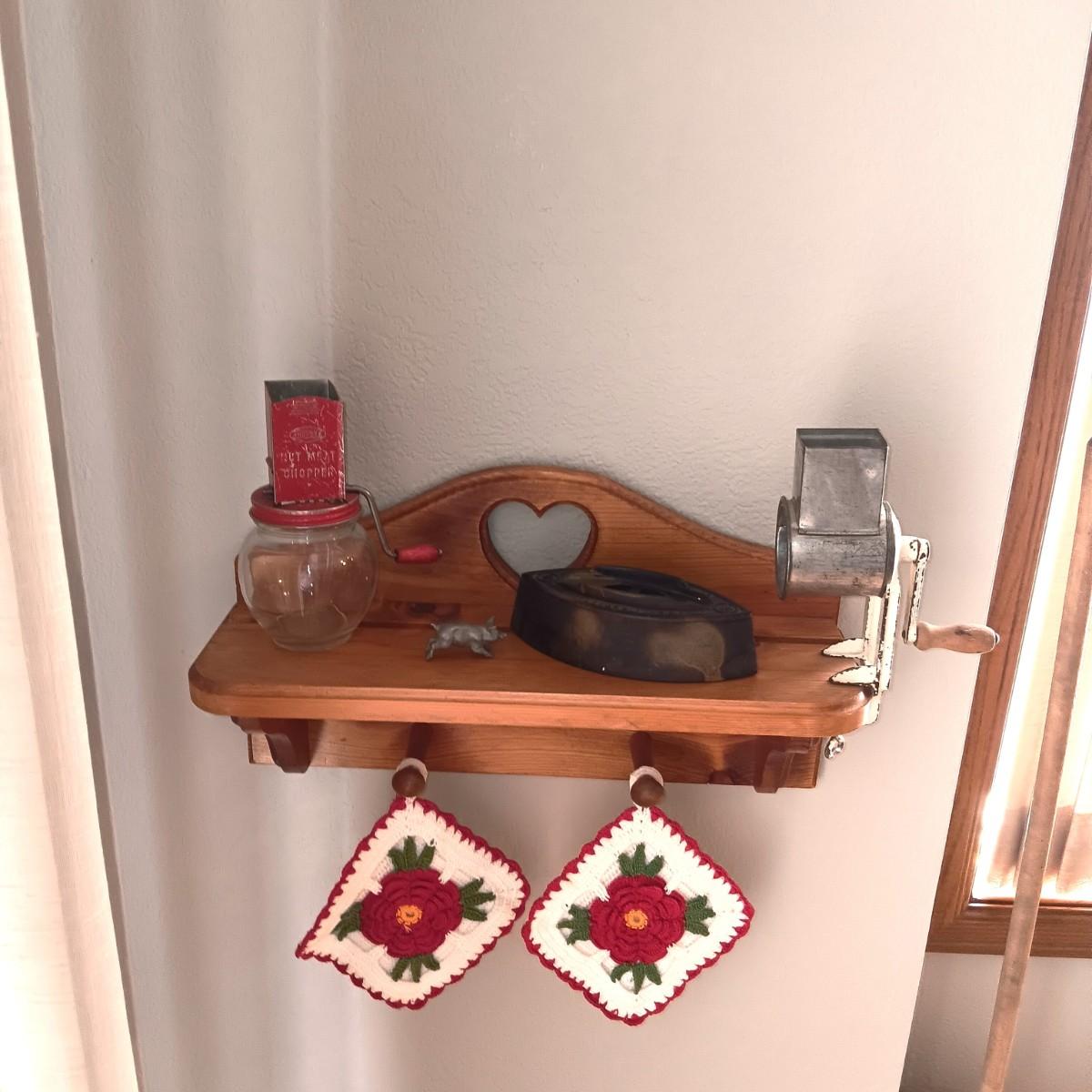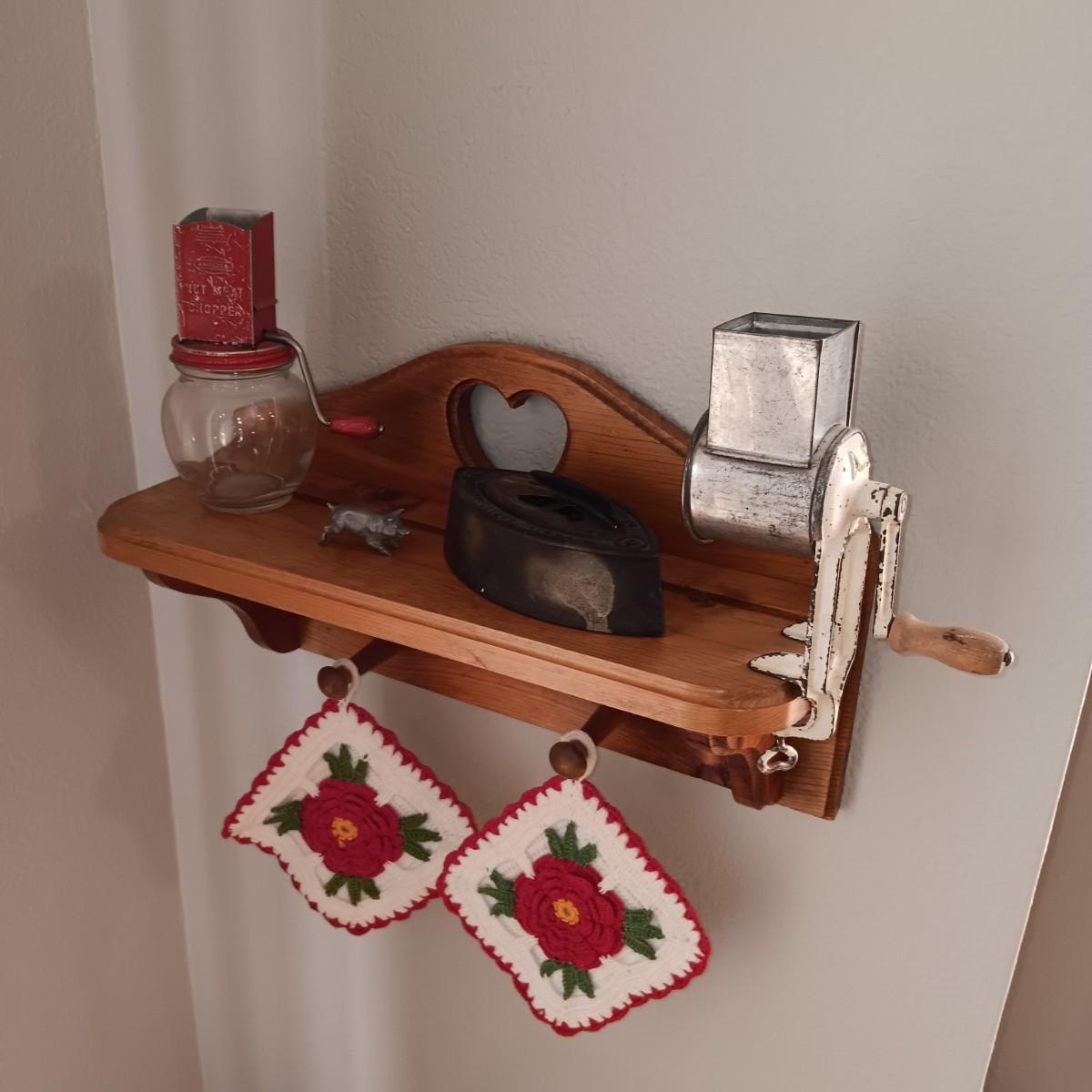 WOODEN WALL SHELF, 2 HAND CRANKED GRINDERS, CAST CLOTHES IRON, PEWTER PIG AND 2 HANDMADE POT HOLDERS