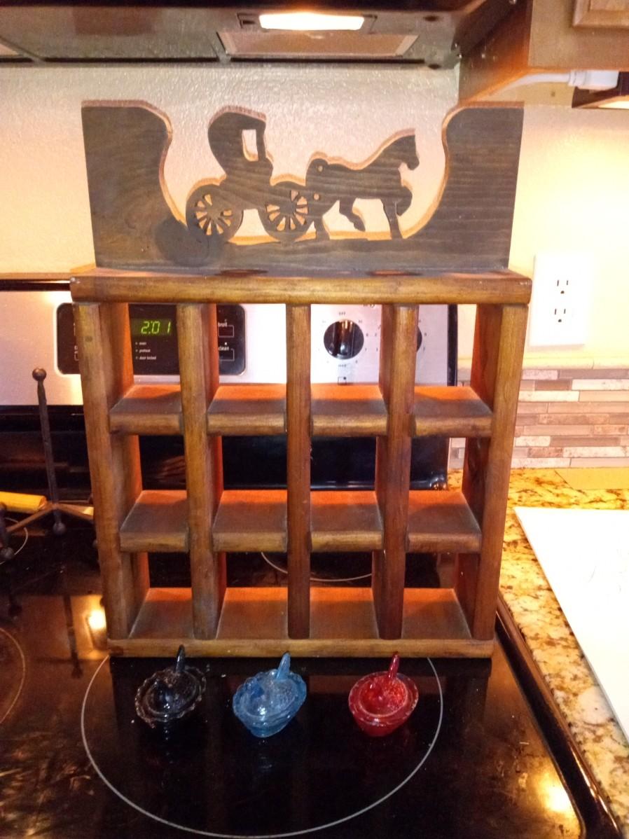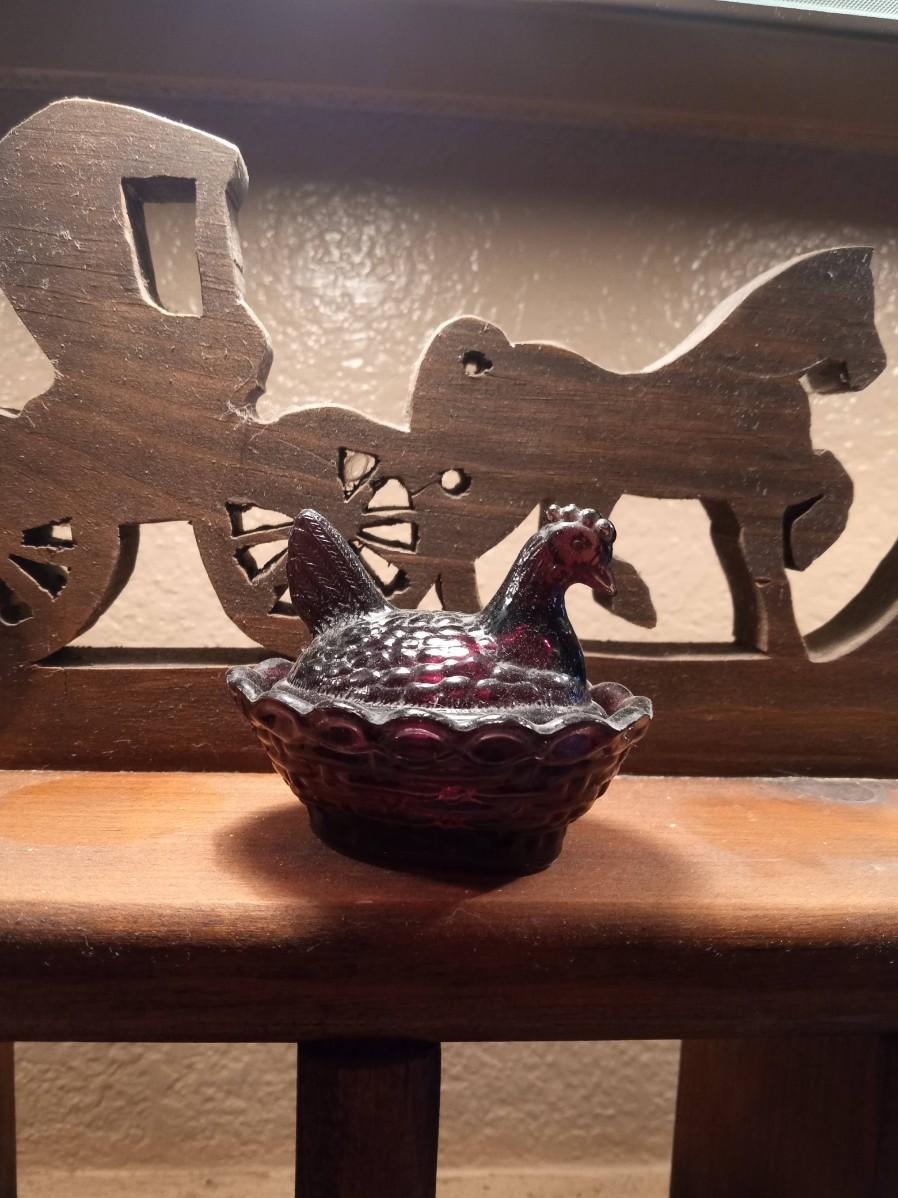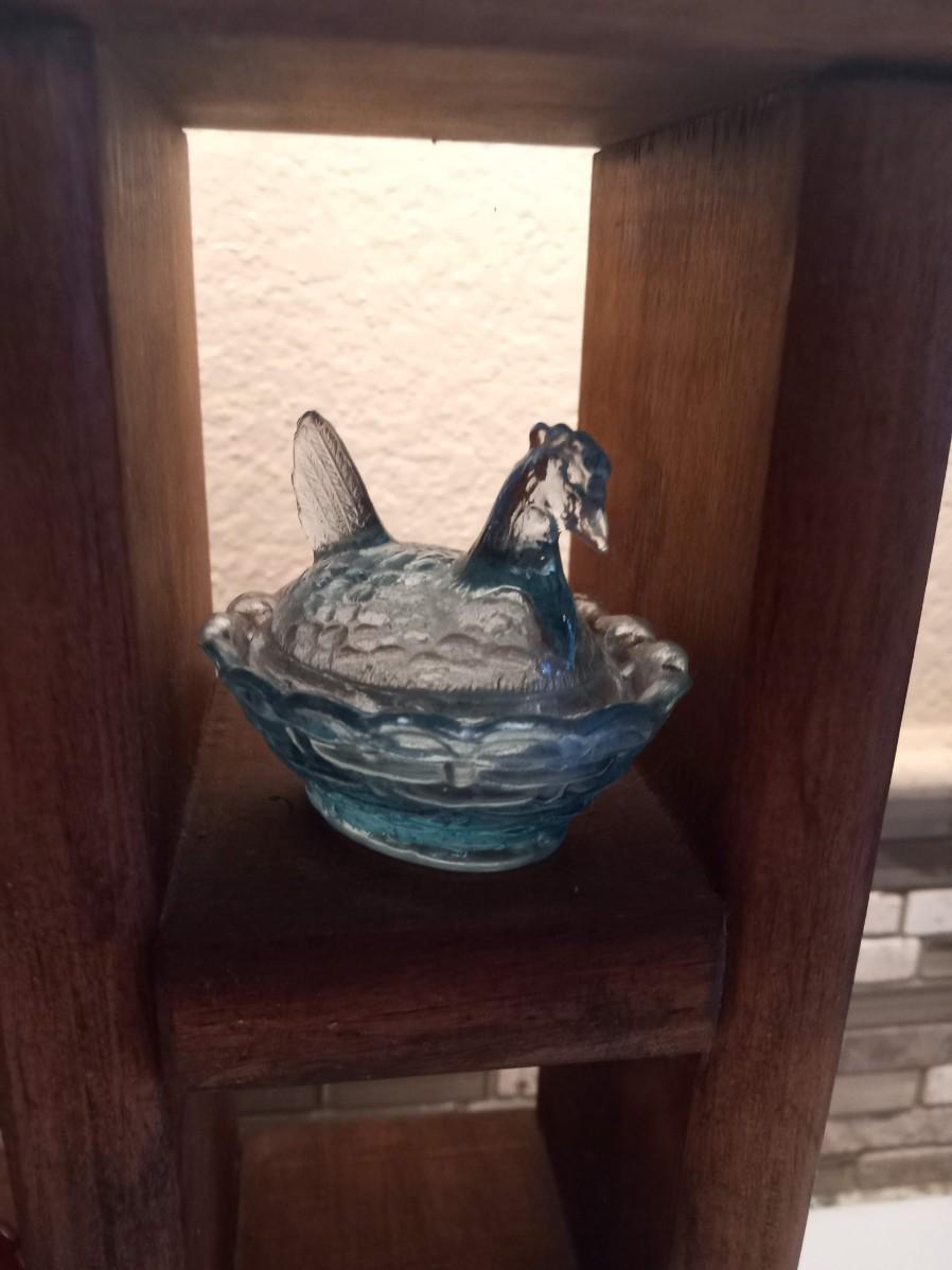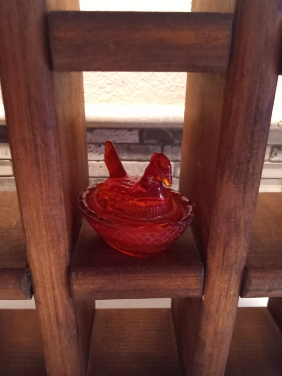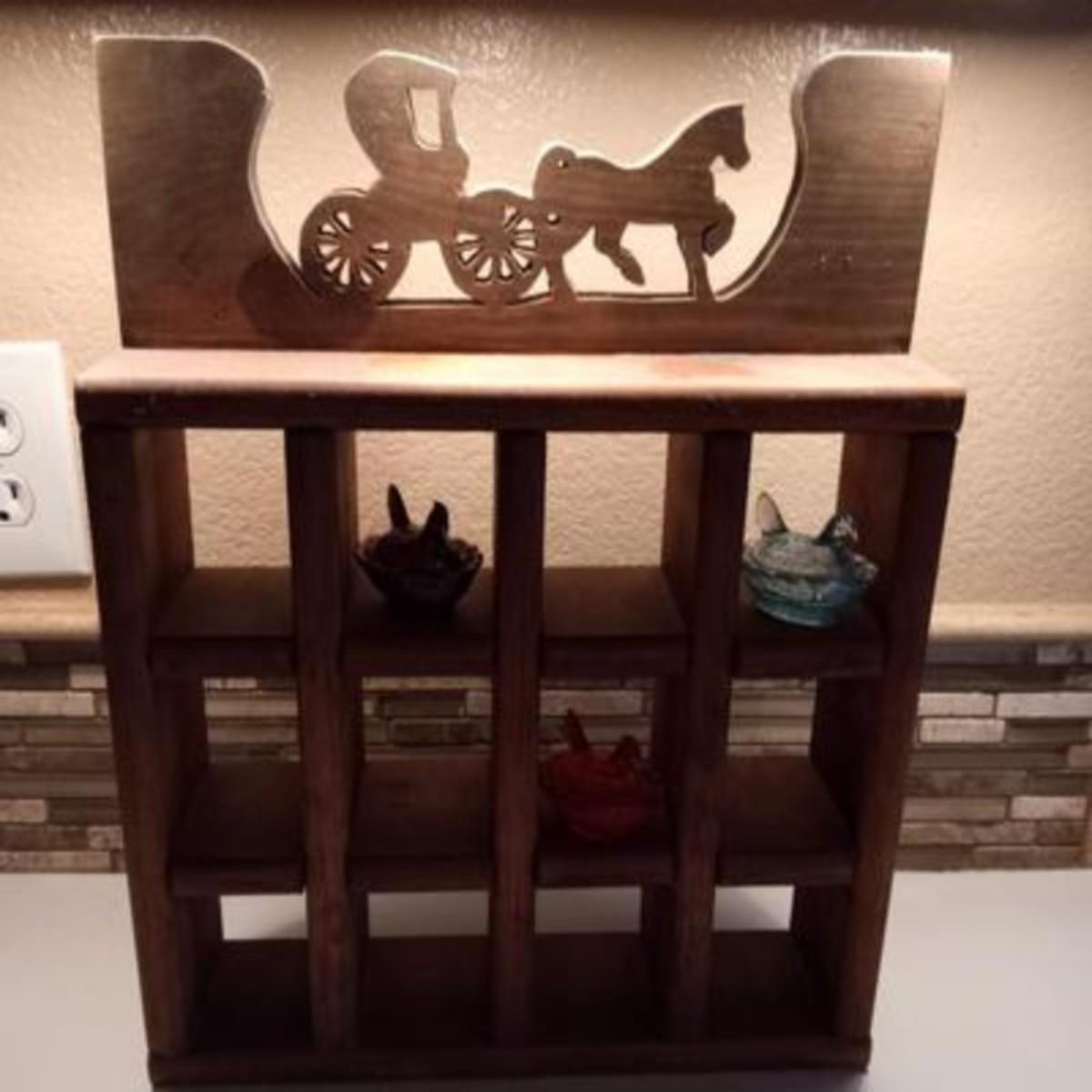 WOODEN WALL SHELF AND 3 SMALL HENS ON NESTS