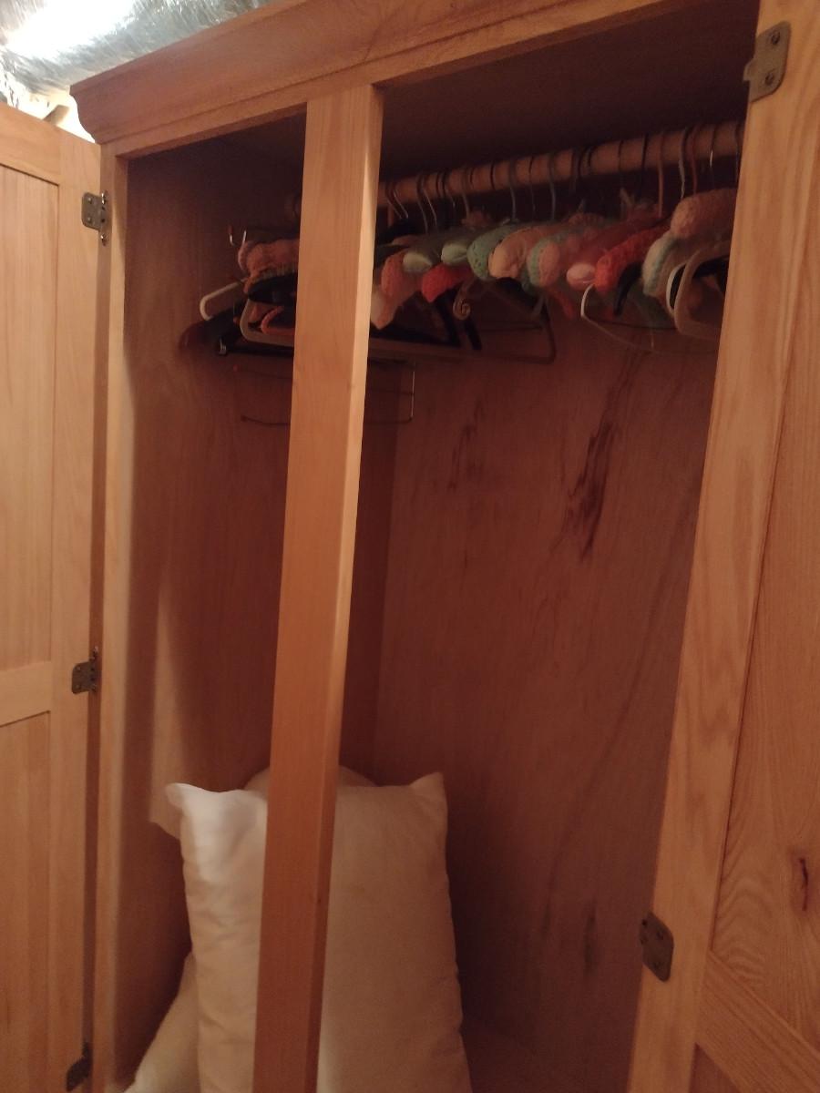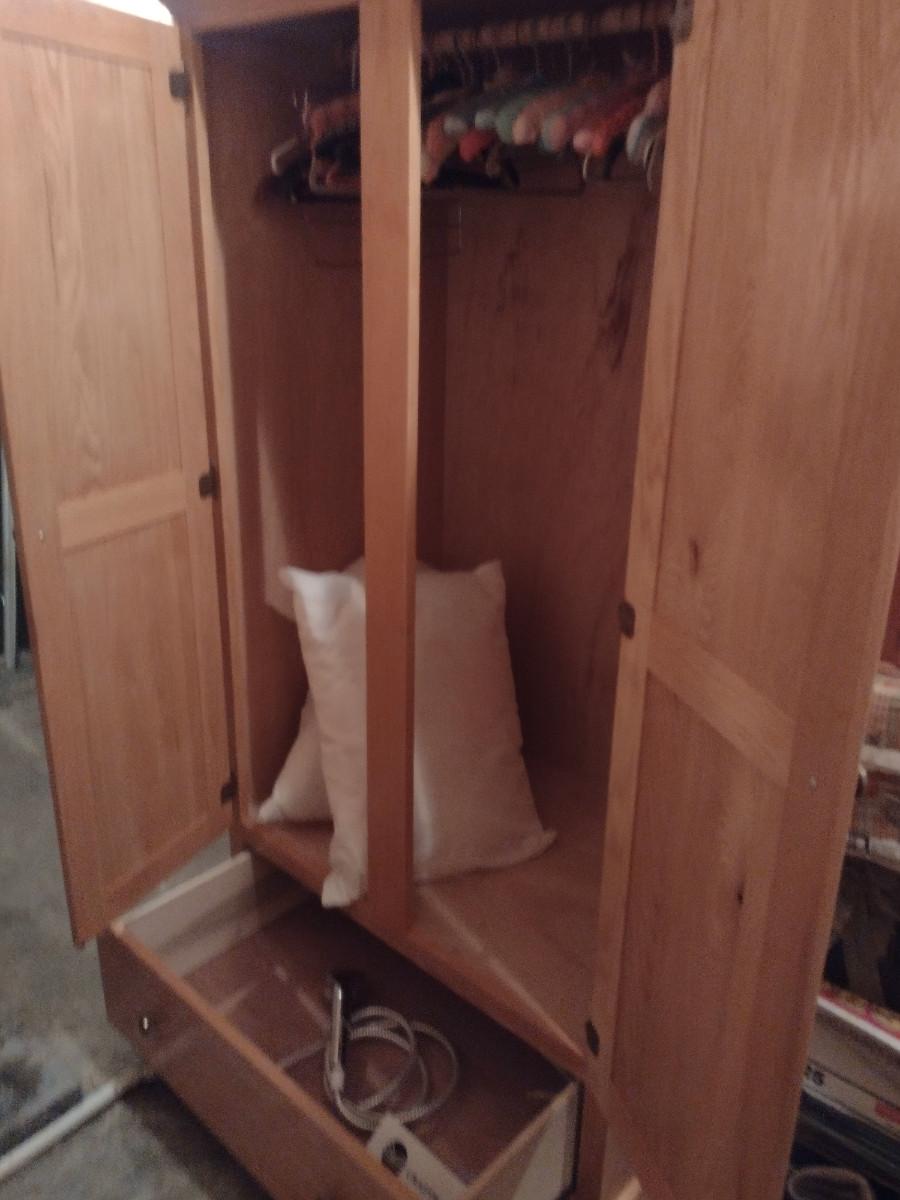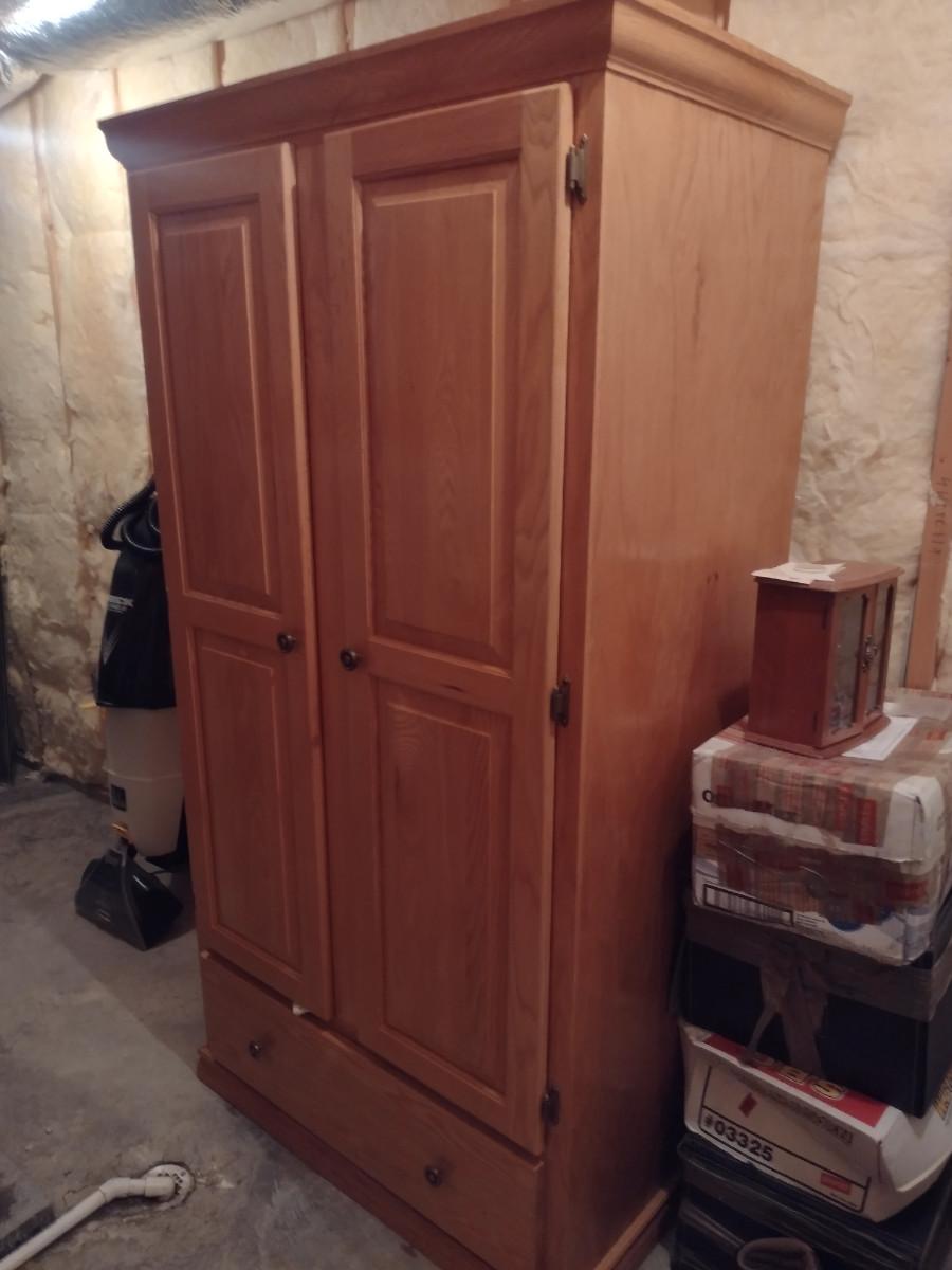 Wooden Wardrobe Cabinet- Approx 36" Wide, 24" Deep, 72" Tall. No contents included. Item is located downstairs and must be brought up a flight of steps. Please bring help for safe removal.