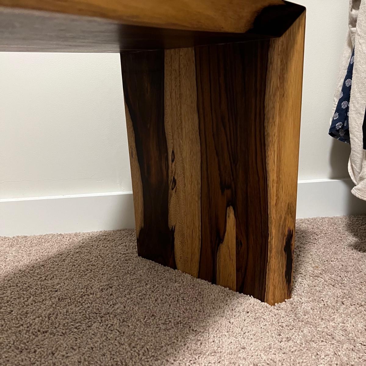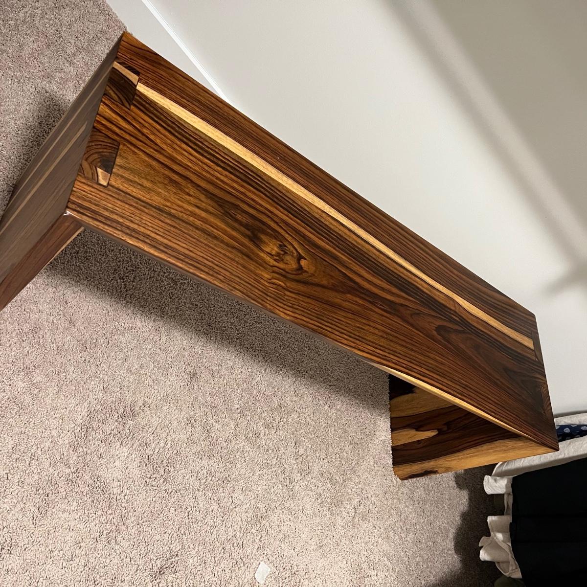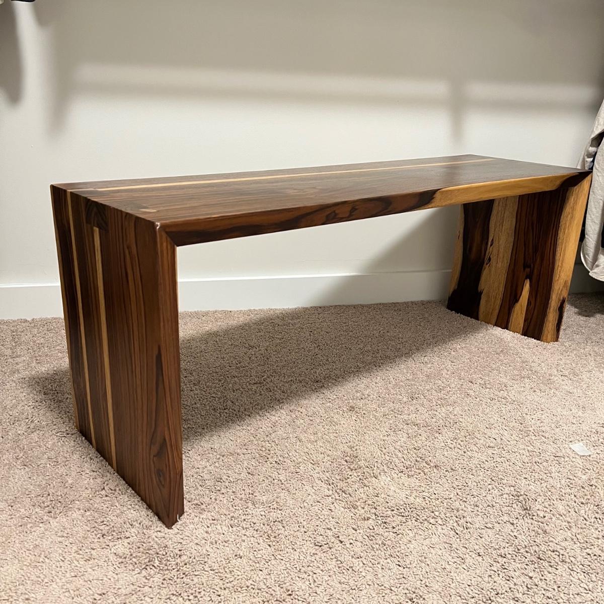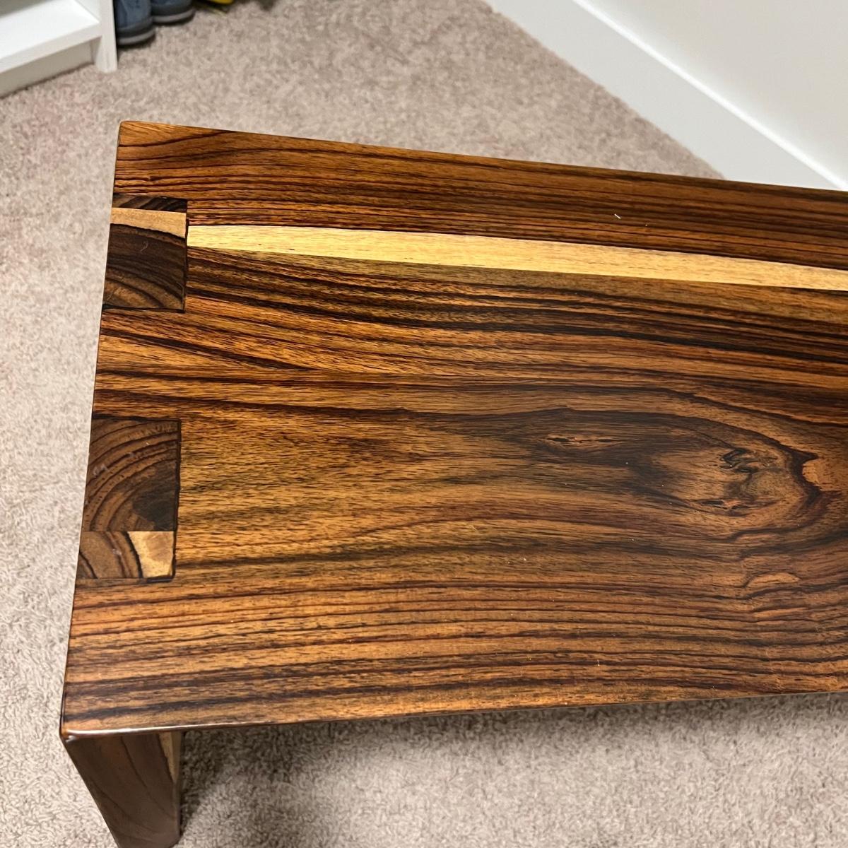This strikingly beautiful and well crafted solid wood waterfall bench is in excellent condition. It has a clear laquer finish and has beveled and dovetailed joins.