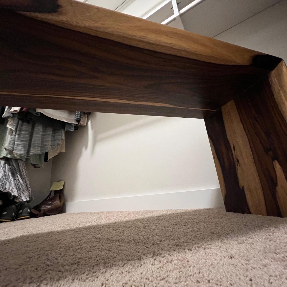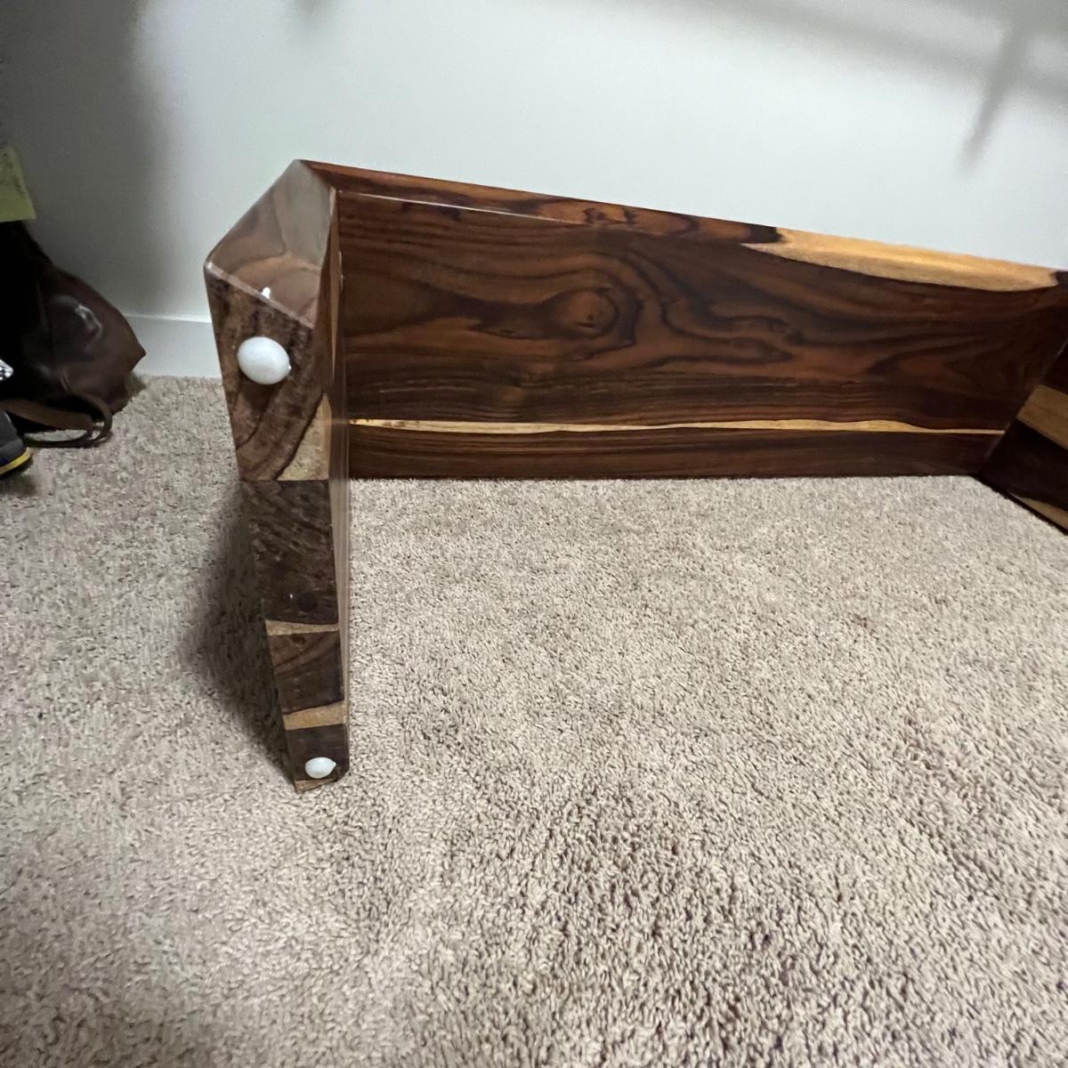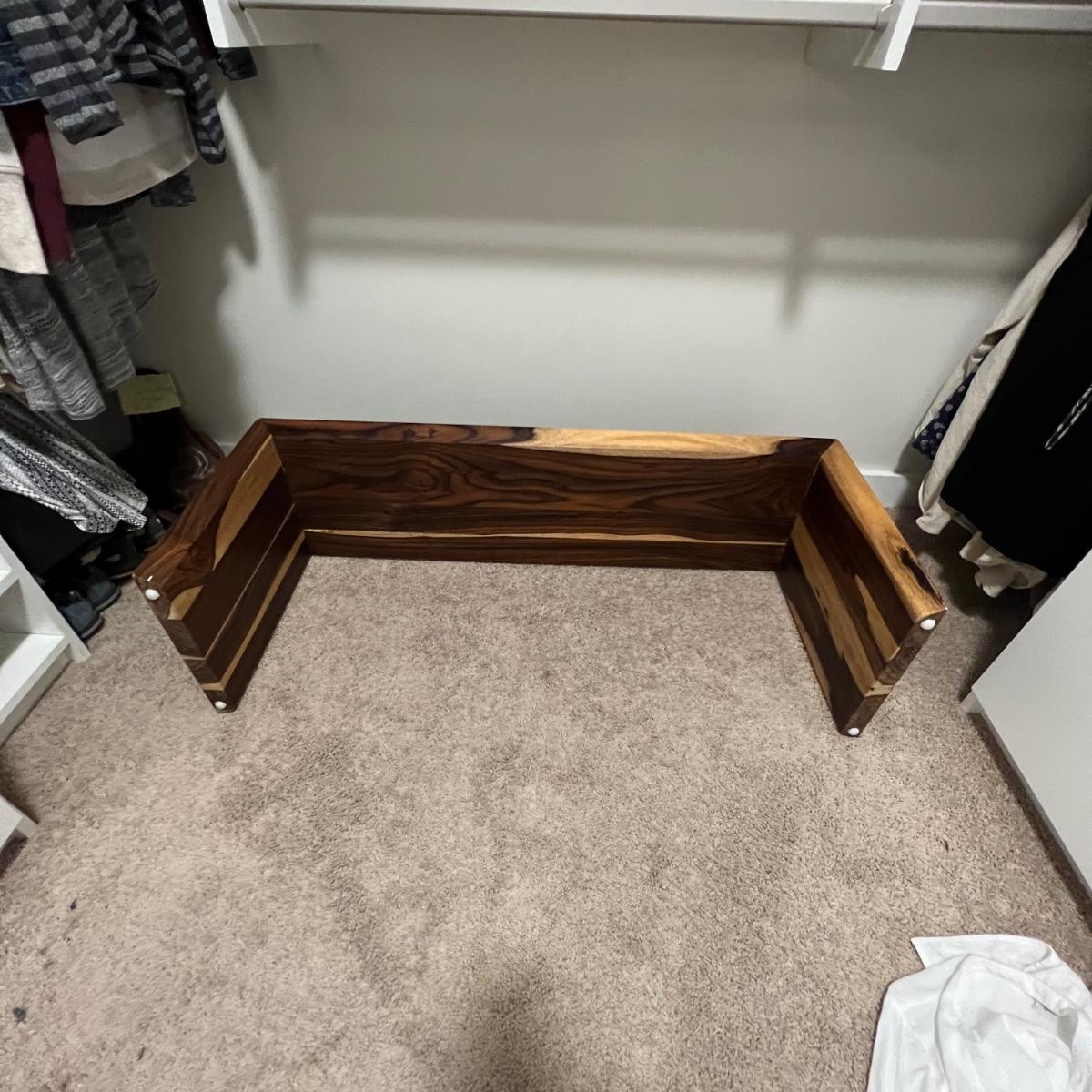 This strikingly beautiful and well crafted solid wood waterfall bench is in excellent condition. It has a clear laquer finish and has beveled and dovetailed joins.
