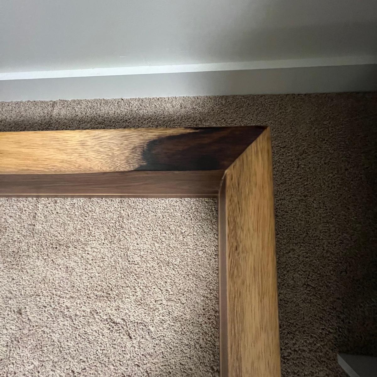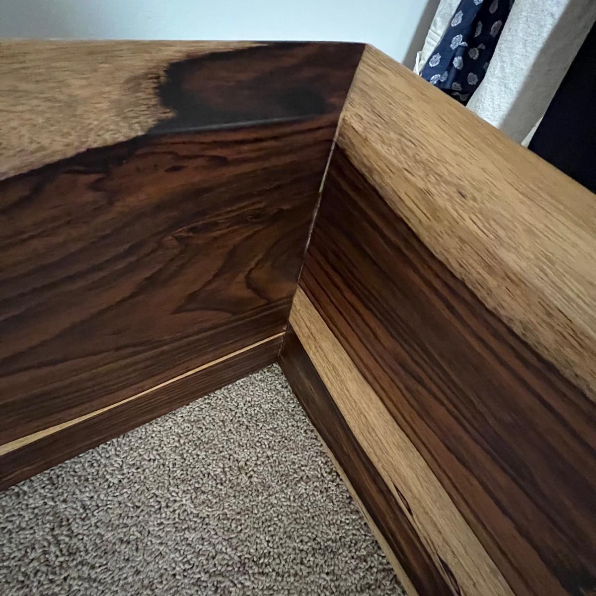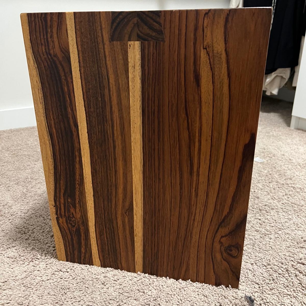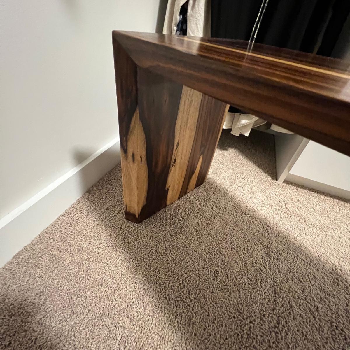 This strikingly beautiful and well crafted solid wood waterfall bench is in excellent condition. It has a clear laquer finish and has beveled and dovetailed joins.