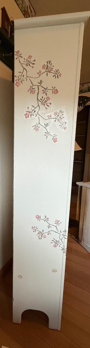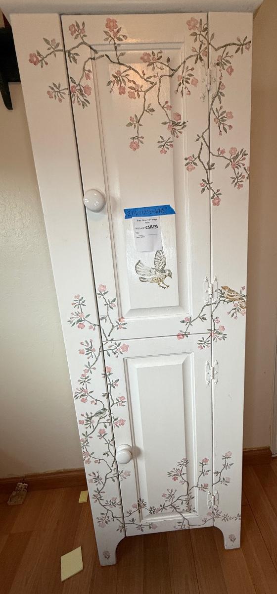 Hand painted cabinet with birds and floral design 21.5x12.5x67.5 and white cabinet 16x14x20.