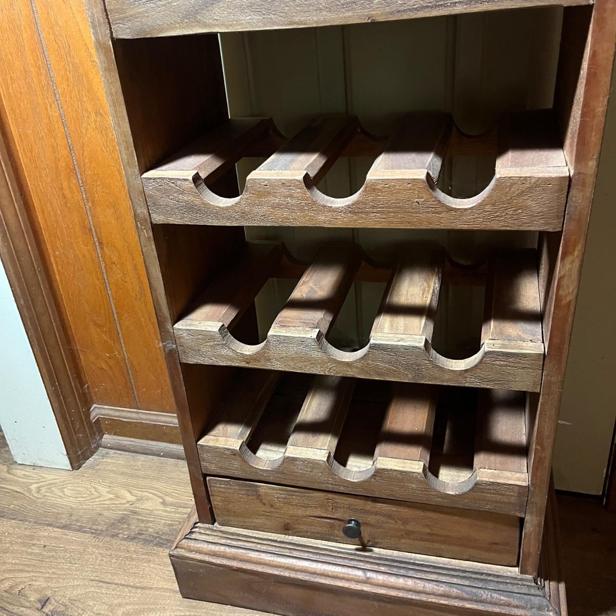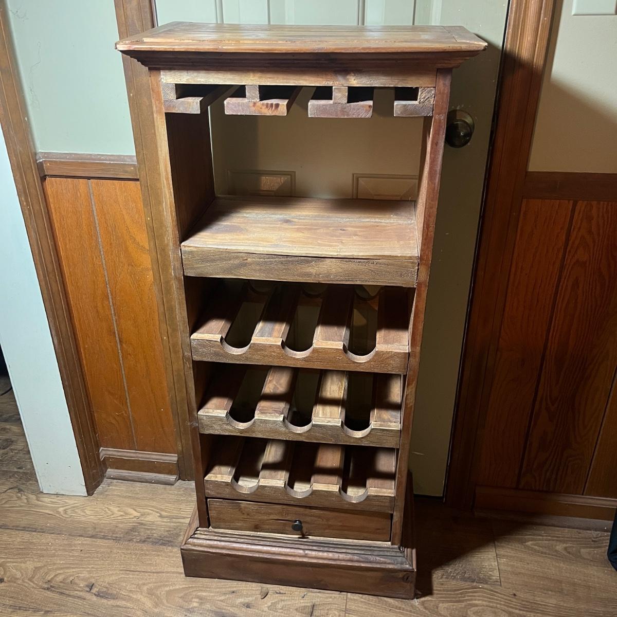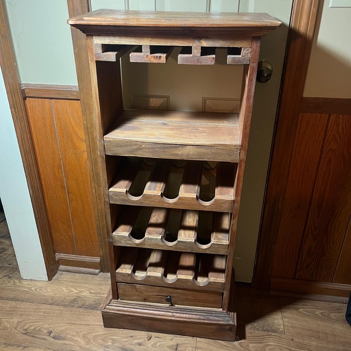 This rustic wooden wine and glass rack will hold nine bottles with three rows of glass storage and a small drawer at the bottom. Piece measures 20” x 11” x 43”H.