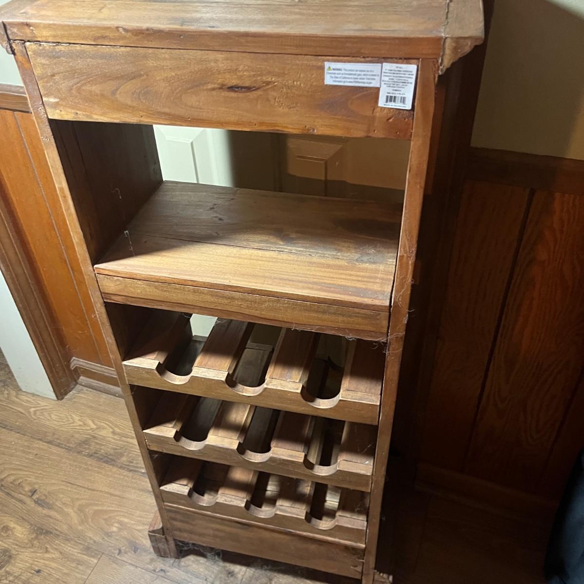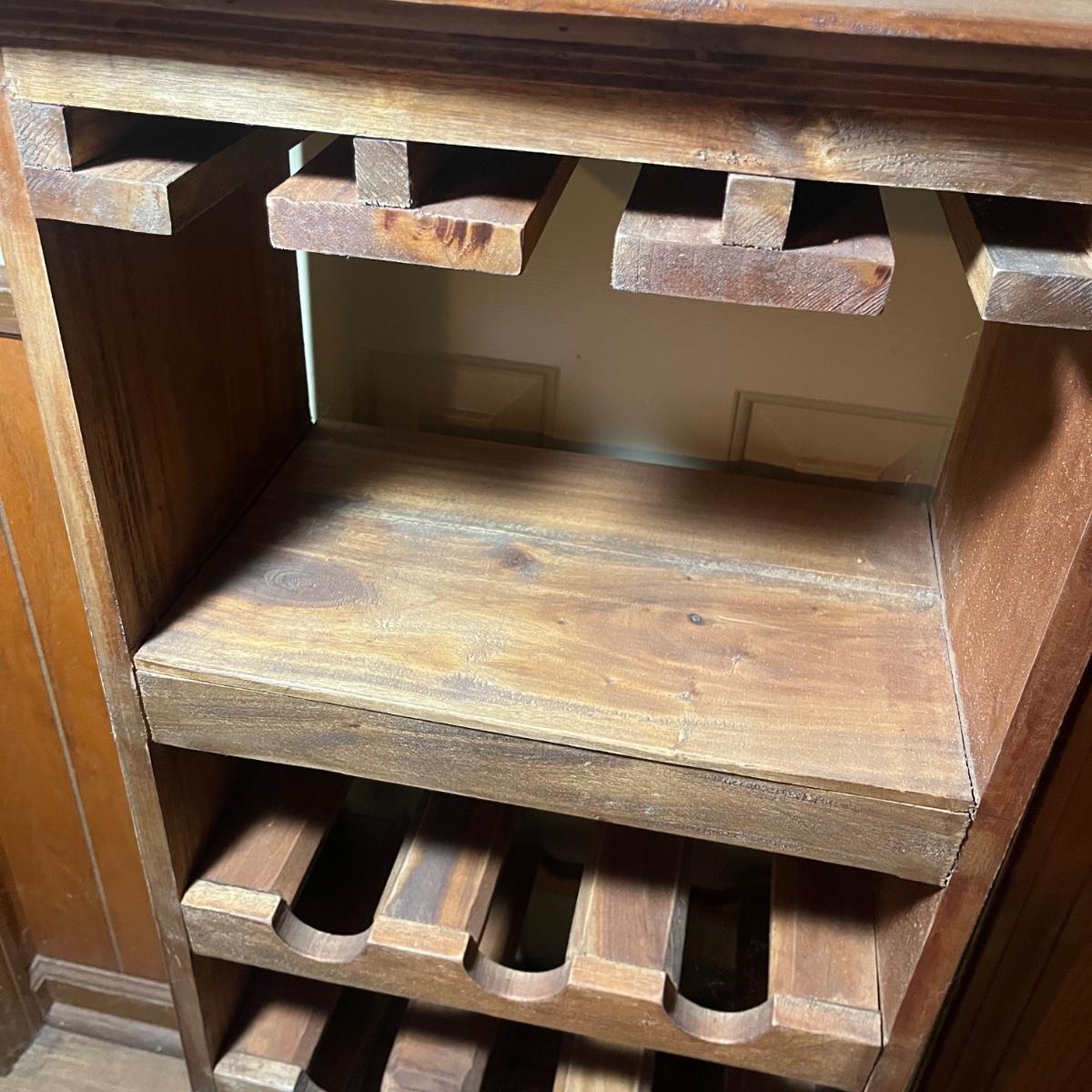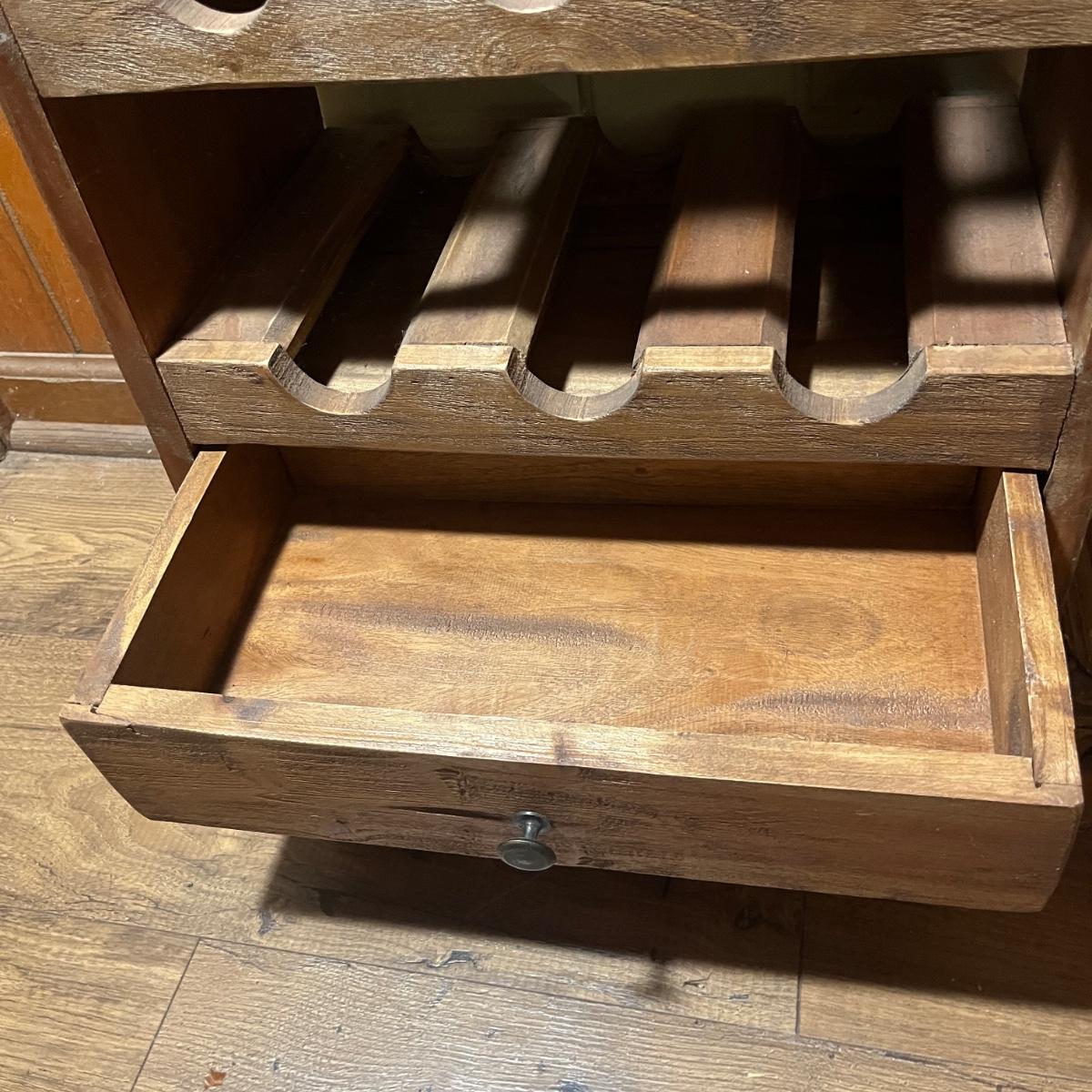 This rustic wooden wine and glass rack will hold nine bottles with three rows of glass storage and a small drawer at the bottom. Piece measures 20” x 11” x 43”H.