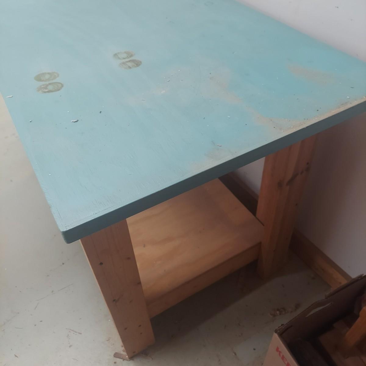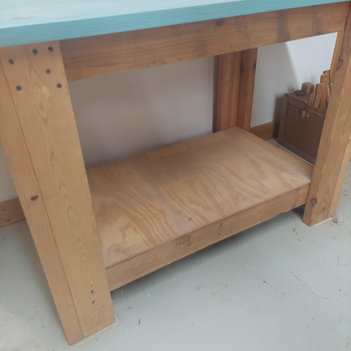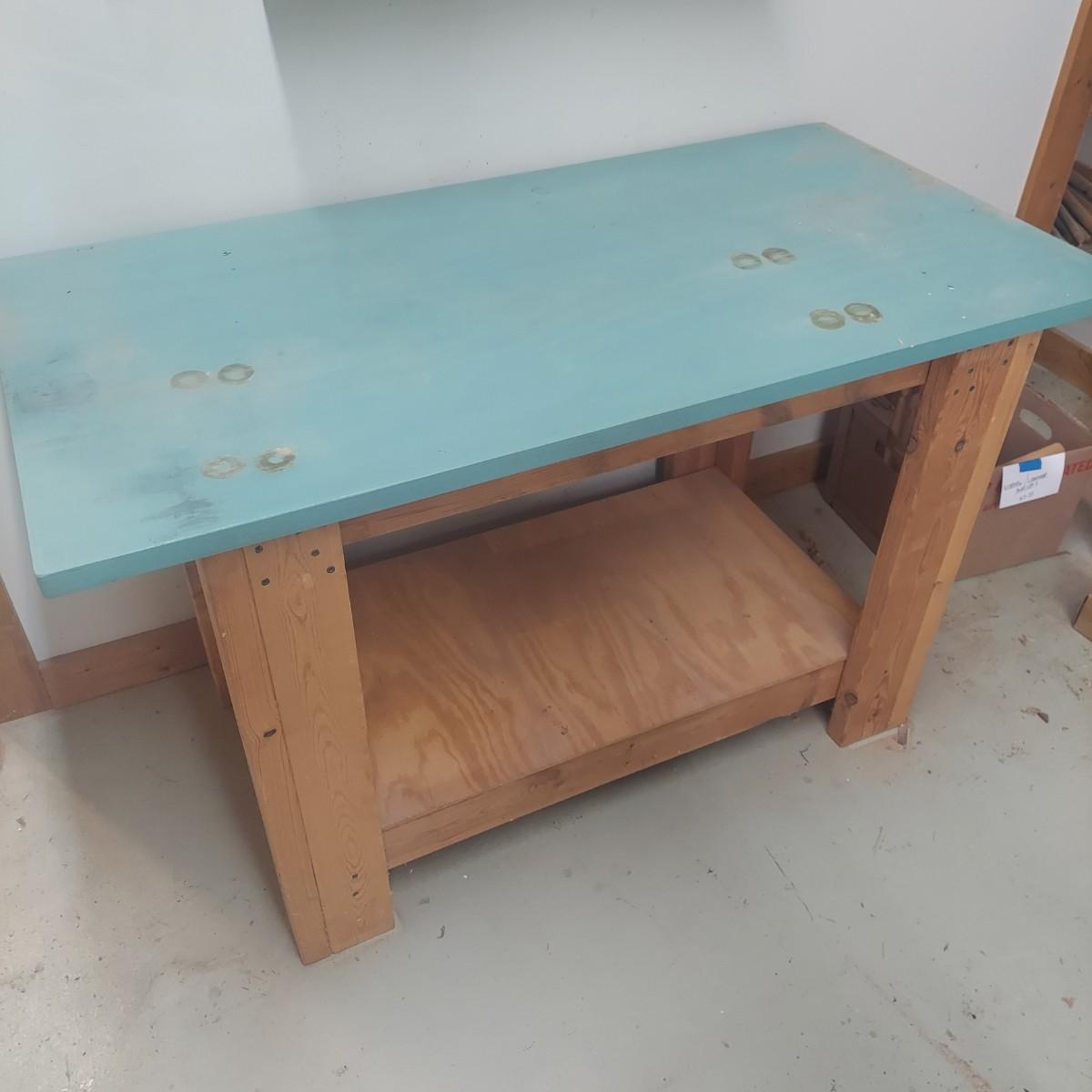 Solid wood workbench measures 48.5” x 24.5” x 30"H. It has a painted top that has a few stains. Local Pickup Only. Winning bidder must bring assistance to help move and load this item due to its weight and/or size.