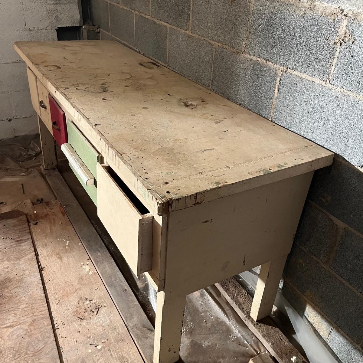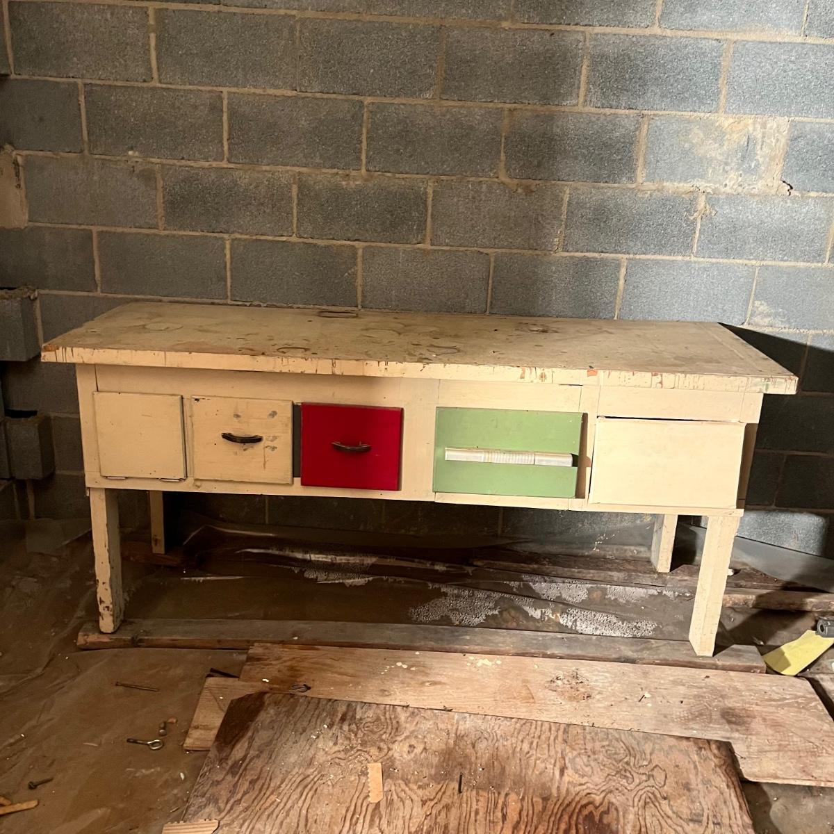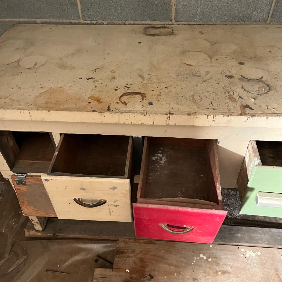 Lot includes a wooden workbench with colored drawers, some are dovetailed.. Bench measures 72” x 24.5” x 33.5”. Drawers currently don’t all fully close and paint work has blemishes, see images.