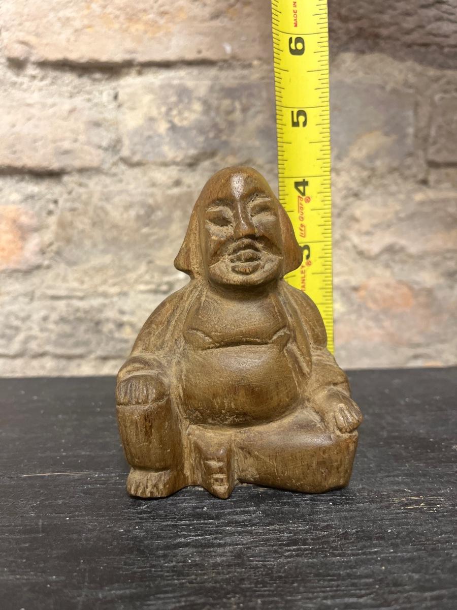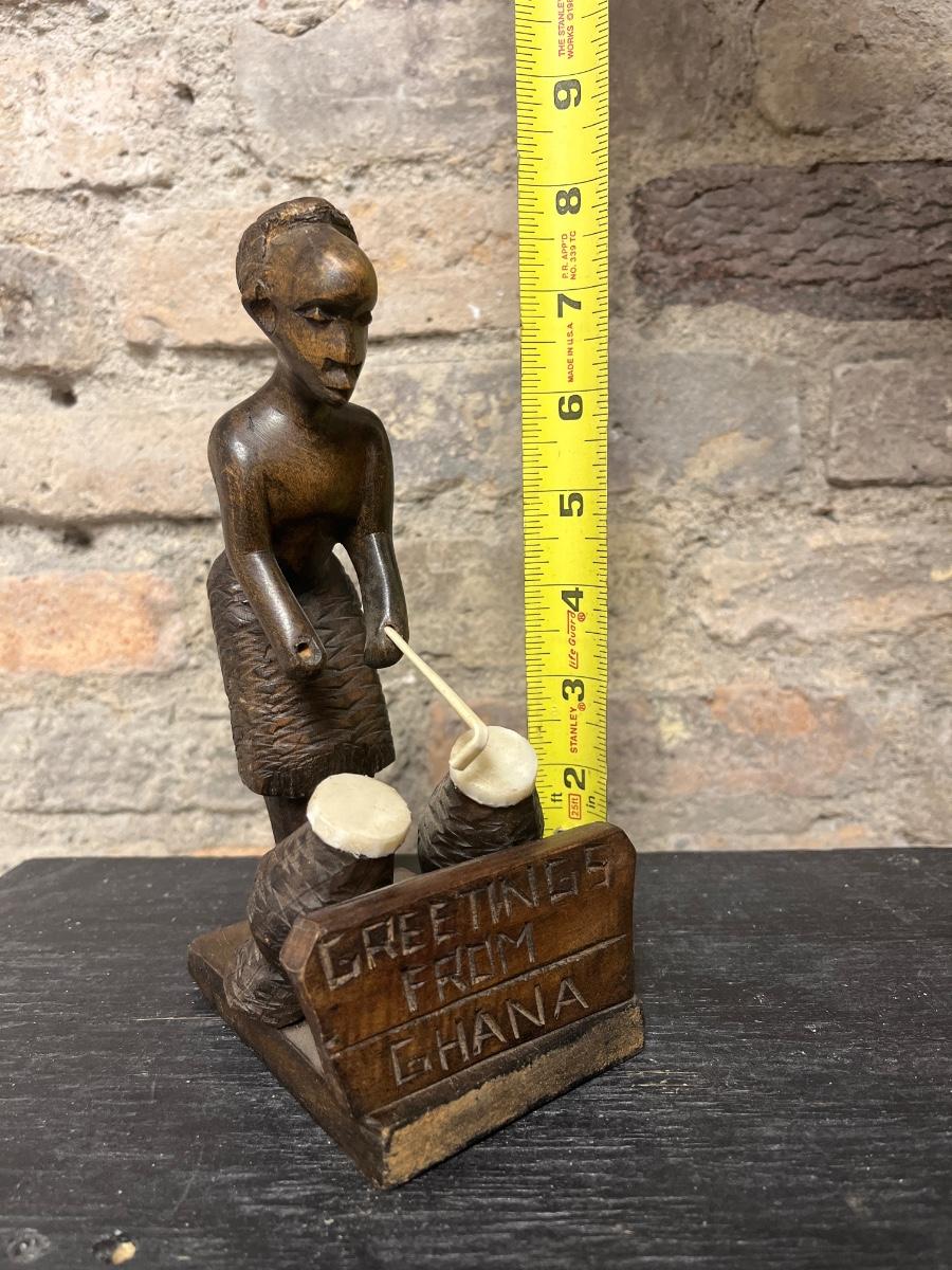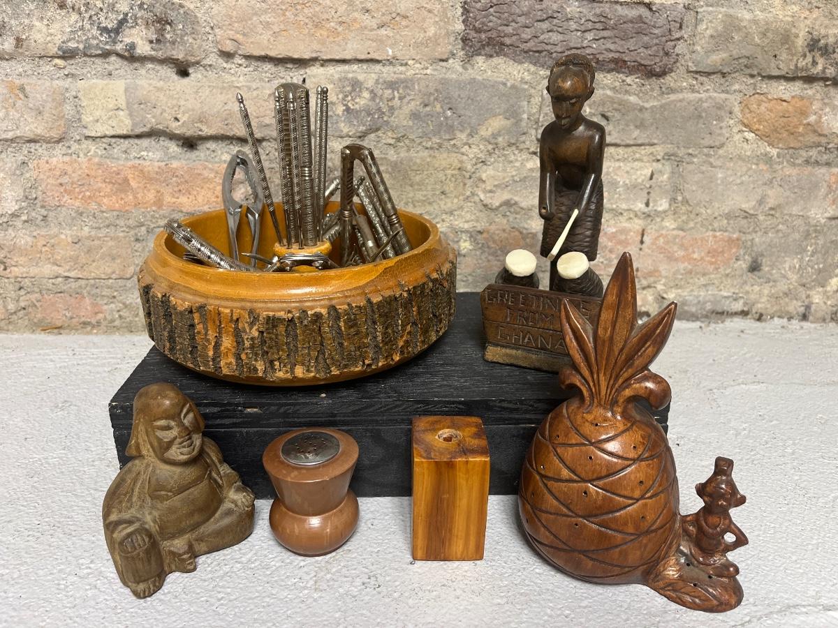 Vintage nut tray with multiple nut crackers and nut meat picks, Ghana figure, small statuette of The Buddha, Hawaiian pineapple toothpick holder (ceramic), one single wooden salt/pepper shaker, wood block candle holder