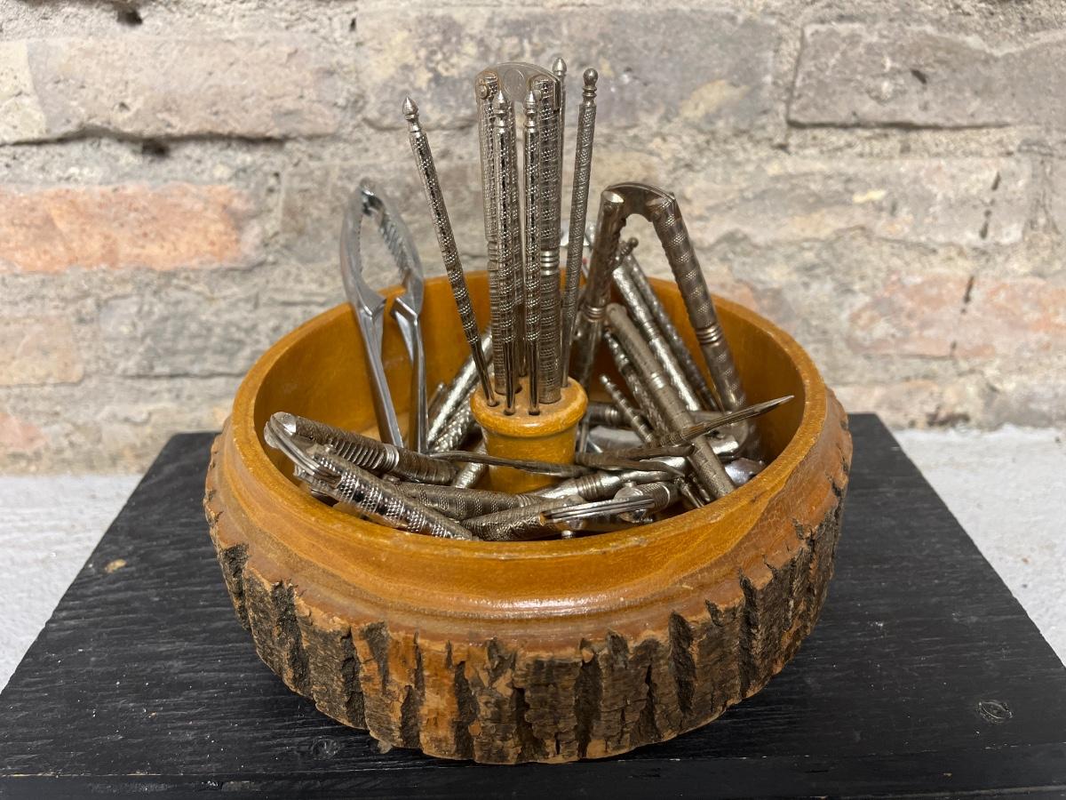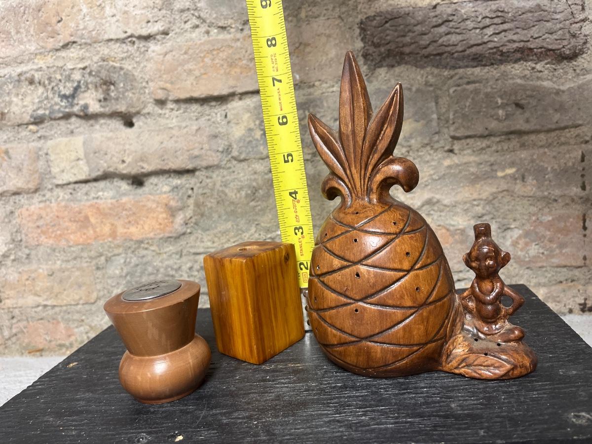 Vintage nut tray with multiple nut crackers and nut meat picks, Ghana figure, small statuette of The Buddha, Hawaiian pineapple toothpick holder (ceramic), one single wooden salt/pepper shaker, wood block candle holder