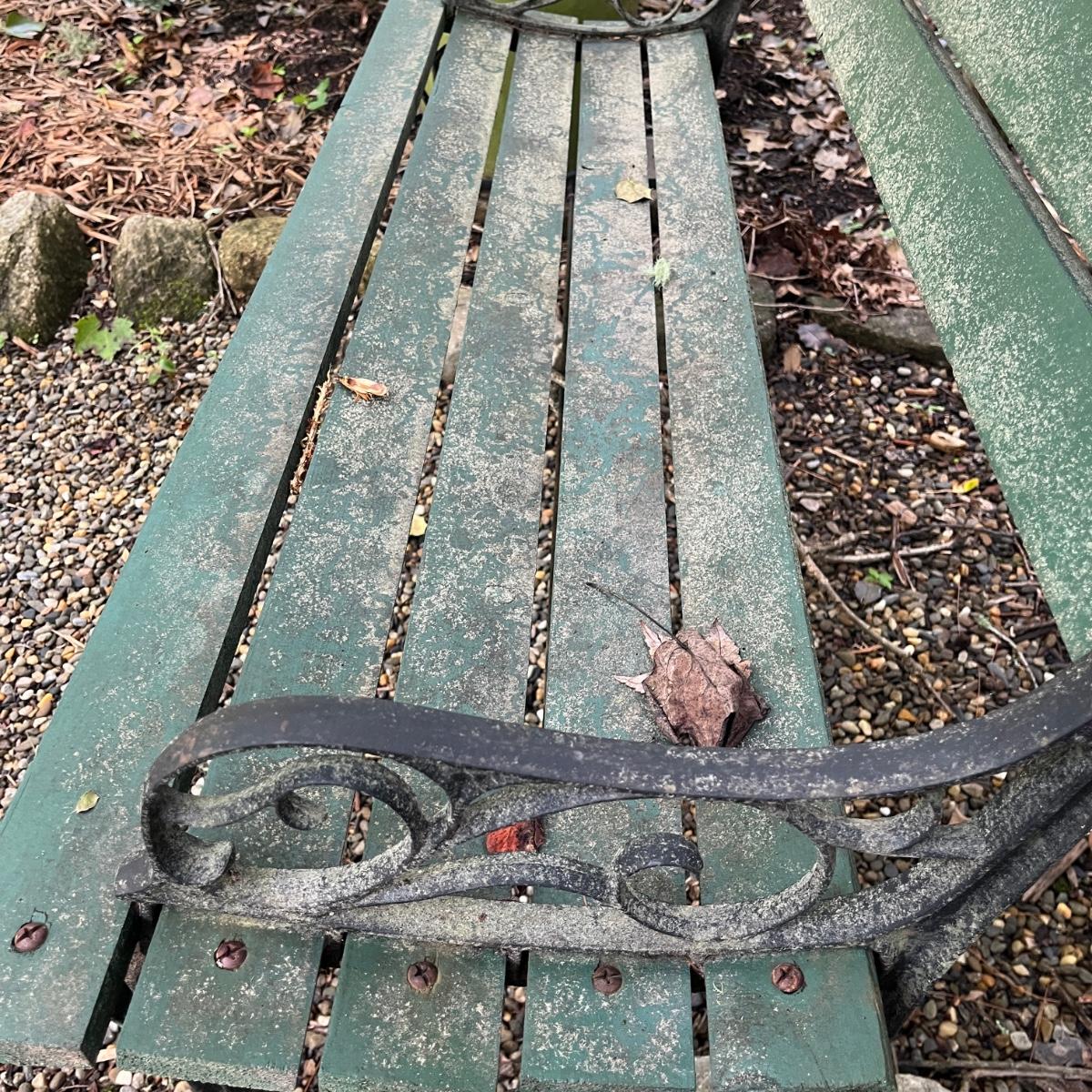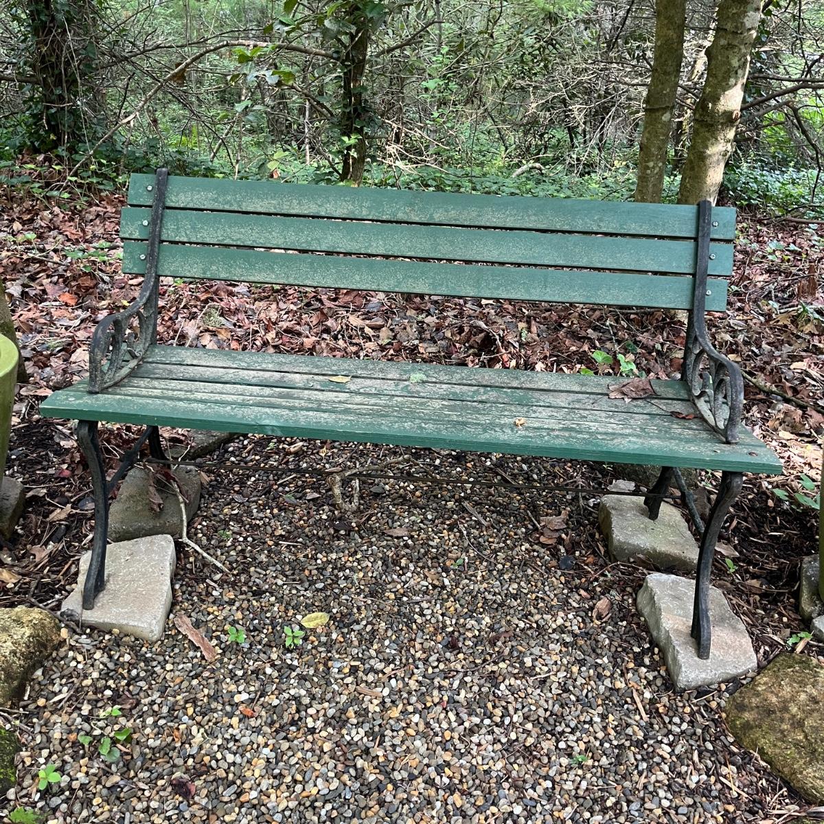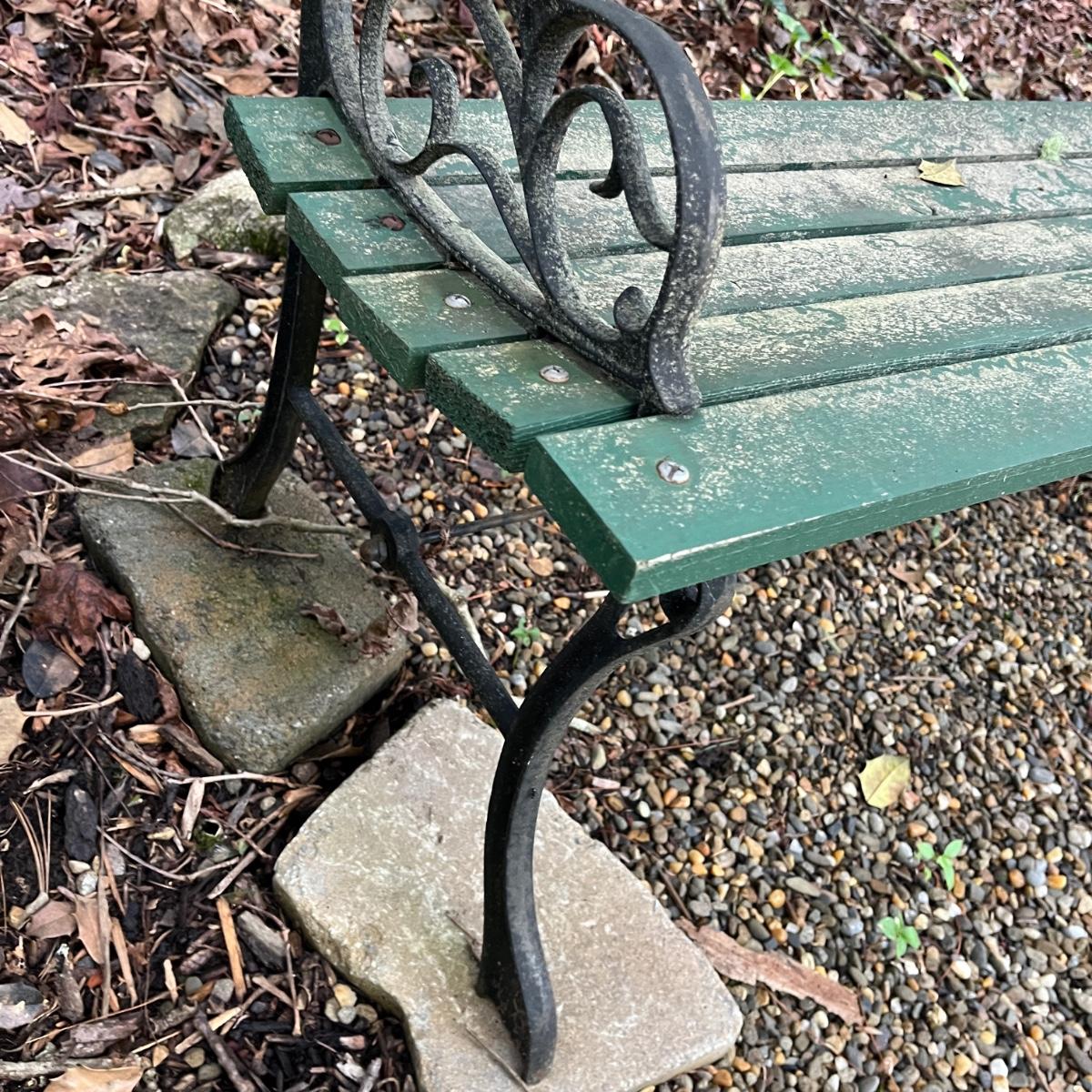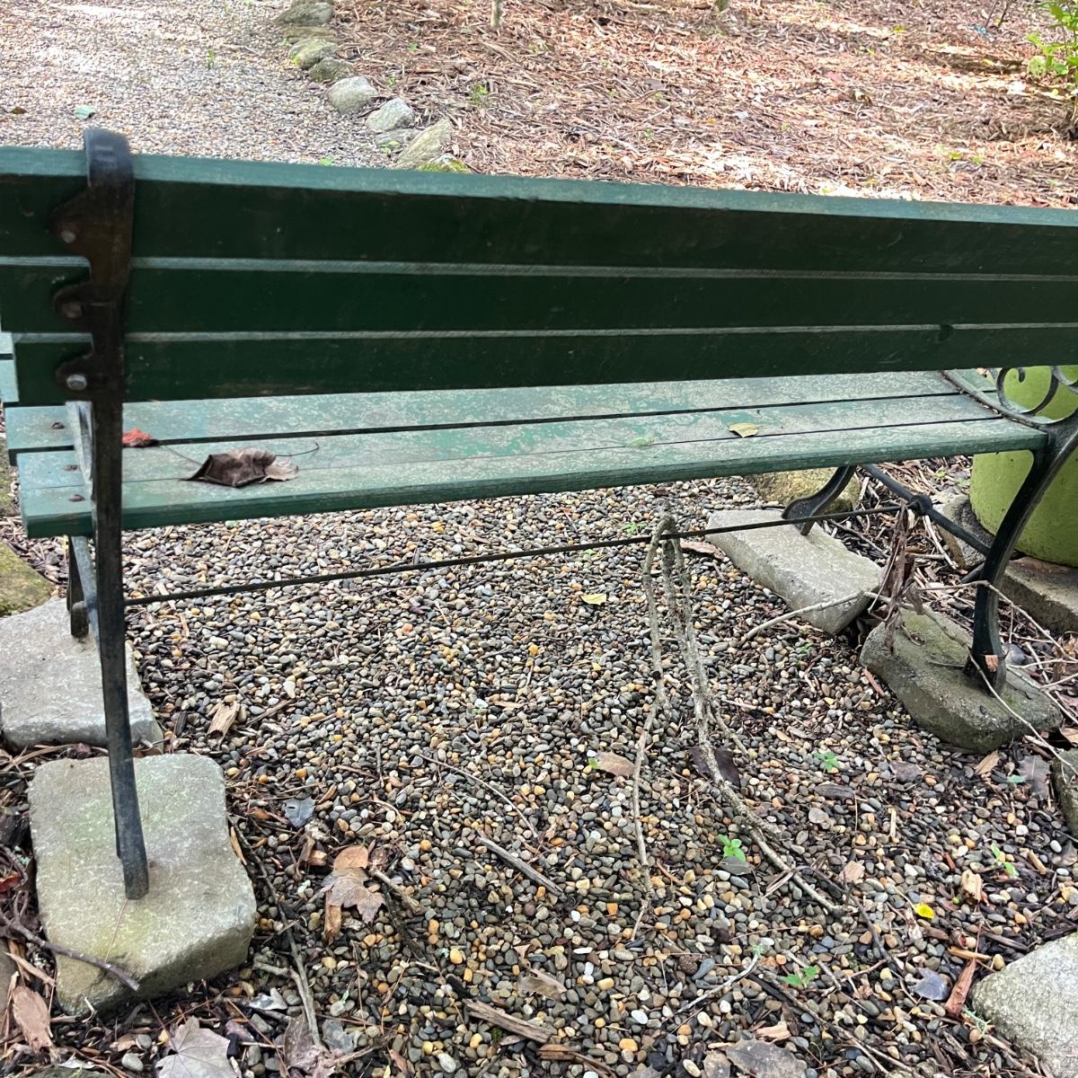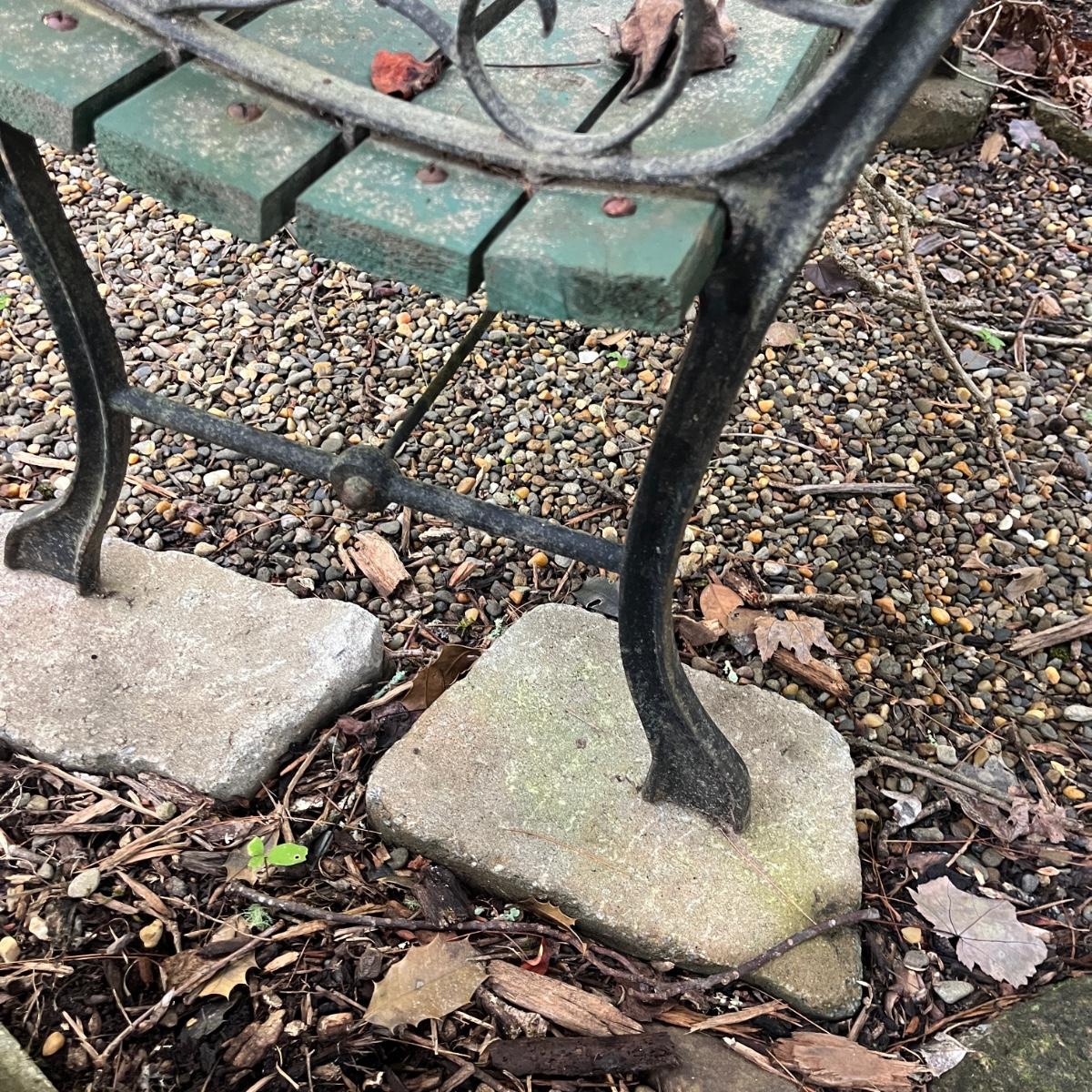 This garden bench is made from wood with cast iron frame and measures 48” x 20” x 29”H with a 17.5” seat height. Rocks shown underneath legs are not included.