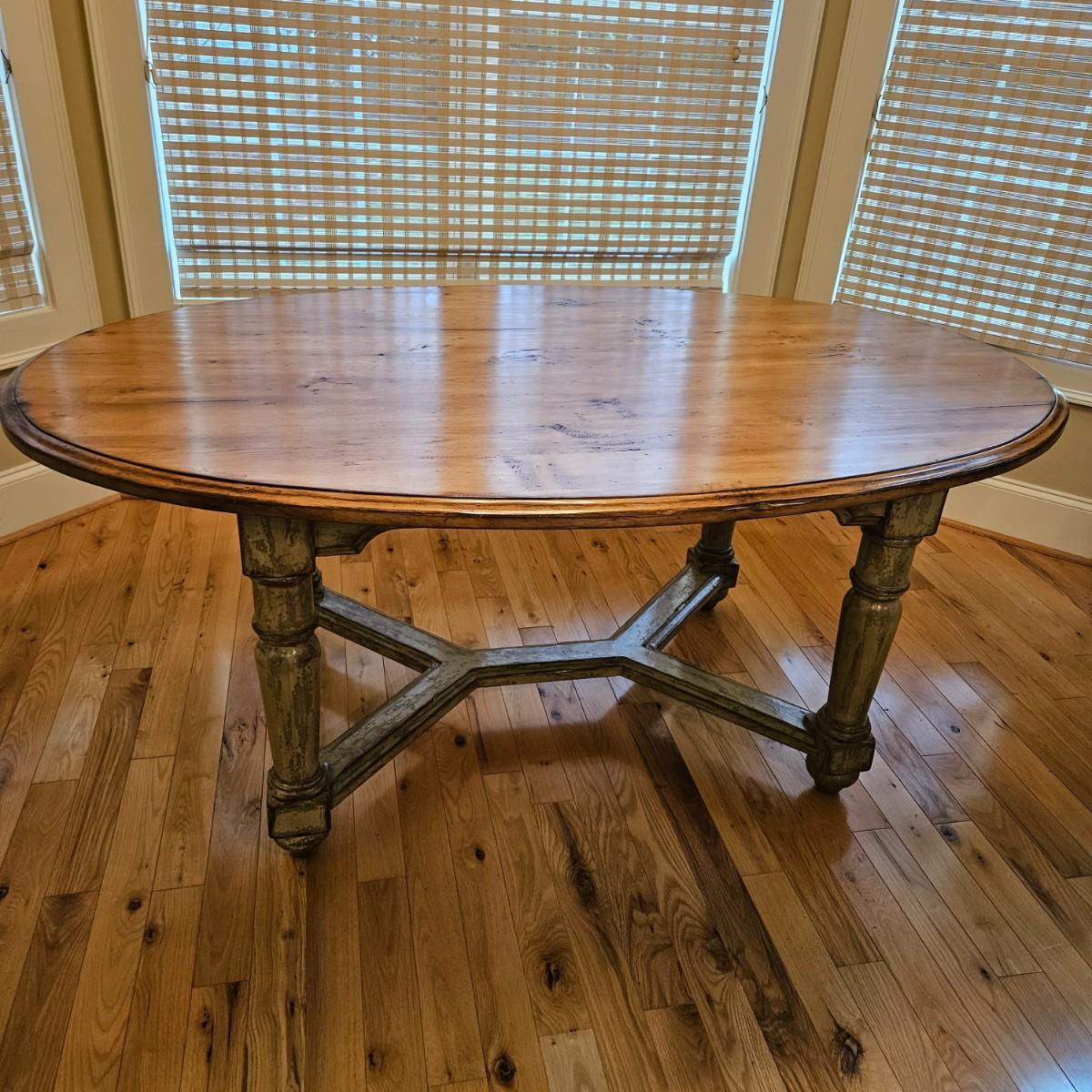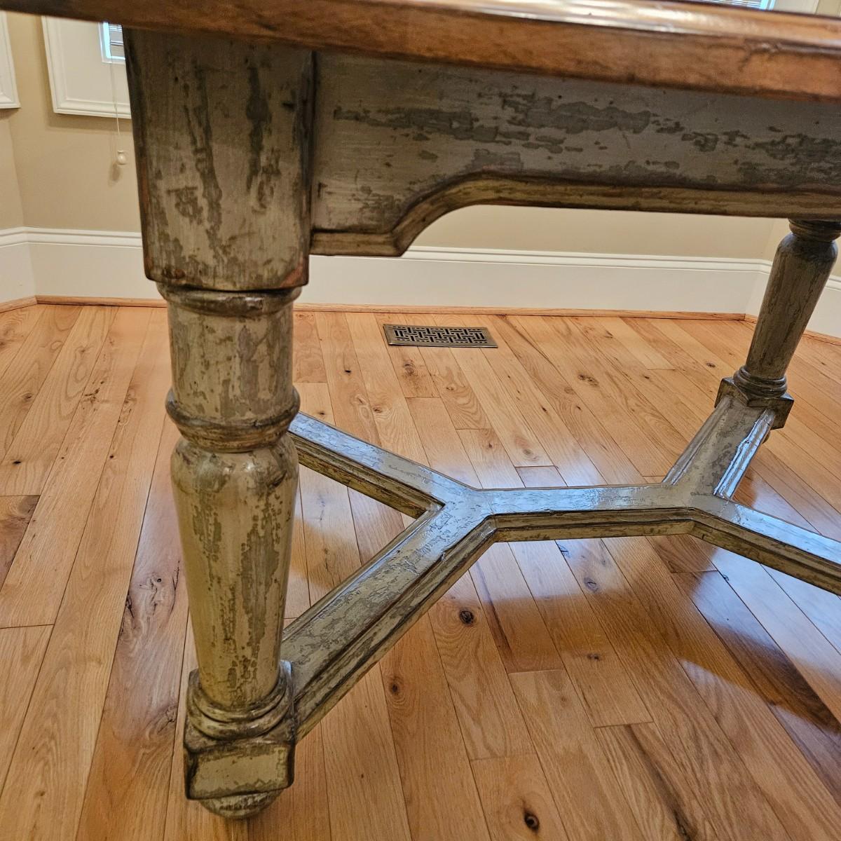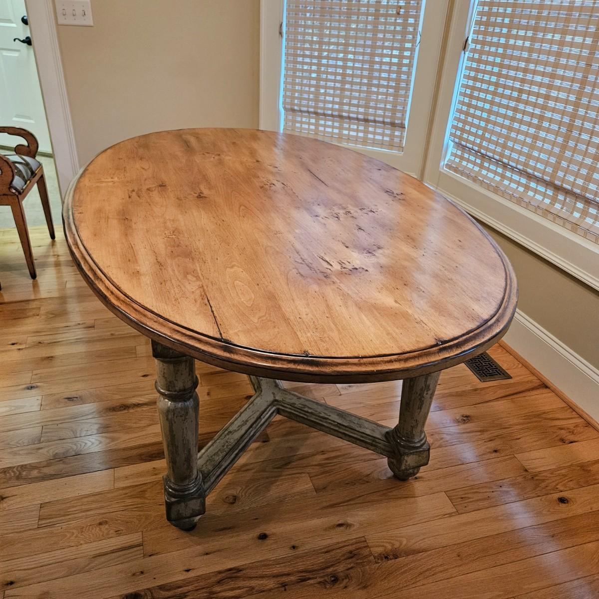 A Woodland kitchen table that has a rustic, rough hewn look to the top and a distressed painted base. It measures approximately 72" x 44" x 31"H. There are matching chairs in this auction. Local pickup only. Winning bidder must bring assistance to help move and load this item due to its weight and/or size.