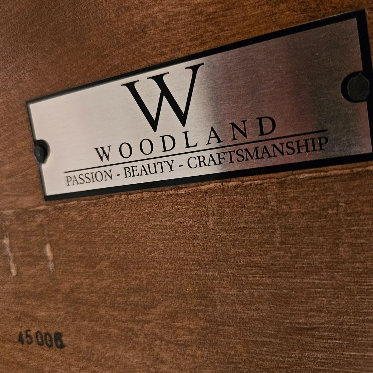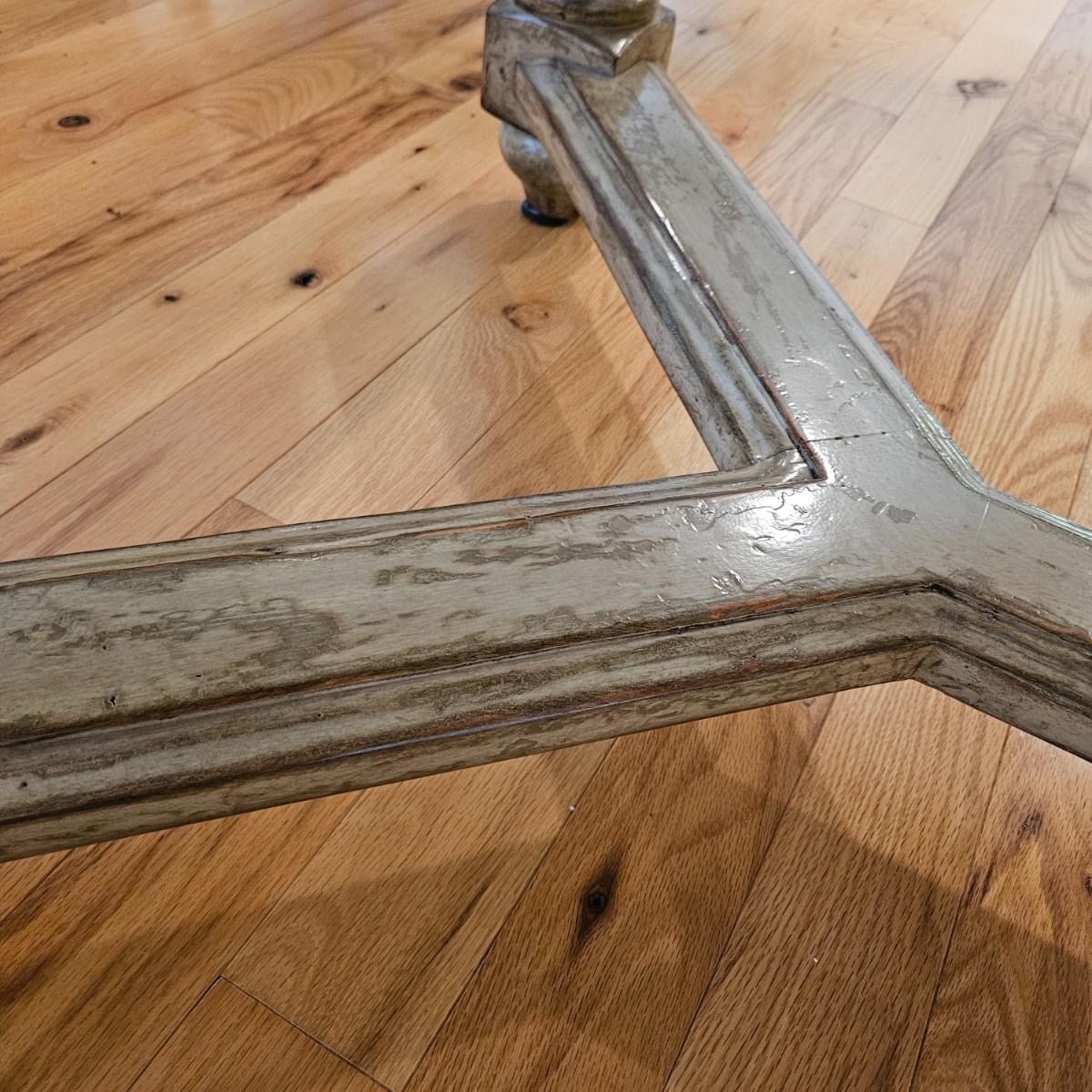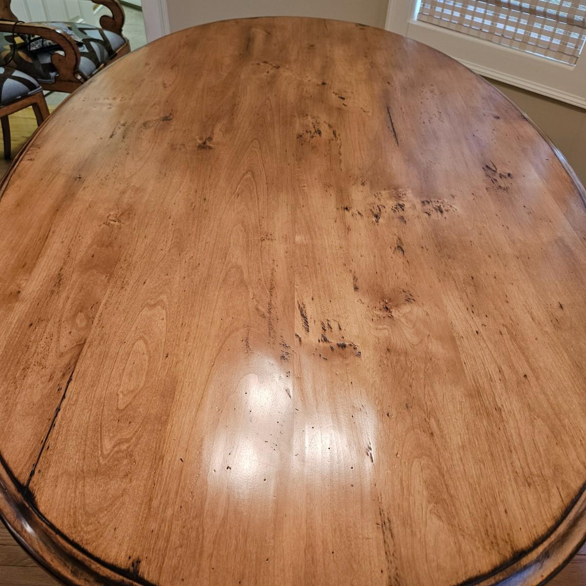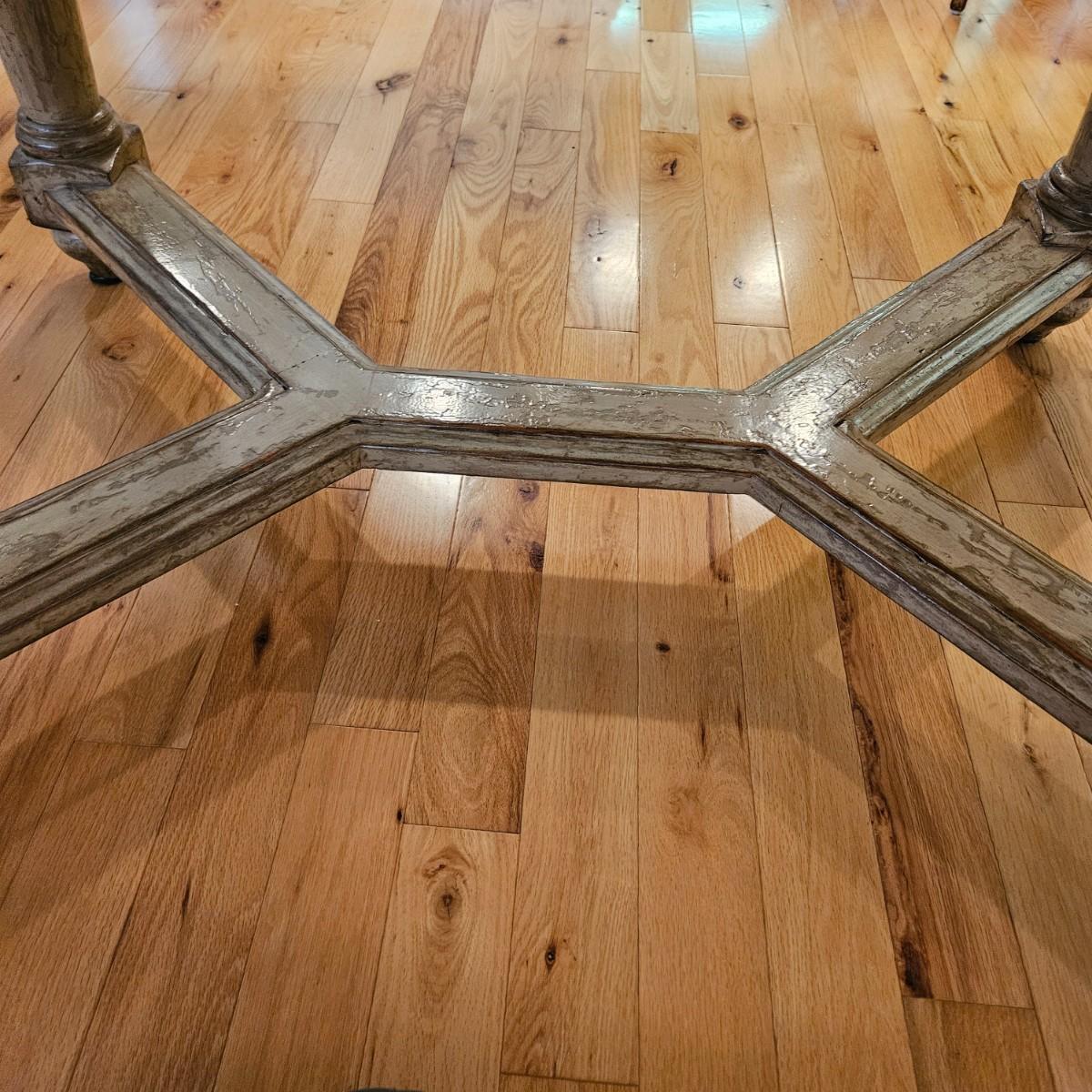 A Woodland kitchen table that has a rustic, rough hewn look to the top and a distressed painted base. It measures approximately 72" x 44" x 31"H. There are matching chairs in this auction. Local pickup only. Winning bidder must bring assistance to help move and load this item due to its weight and/or size.