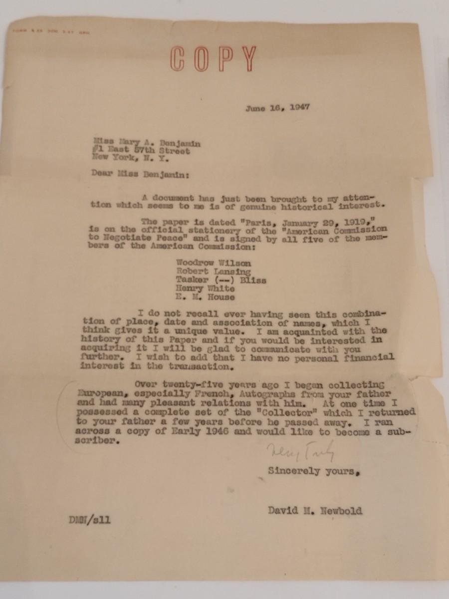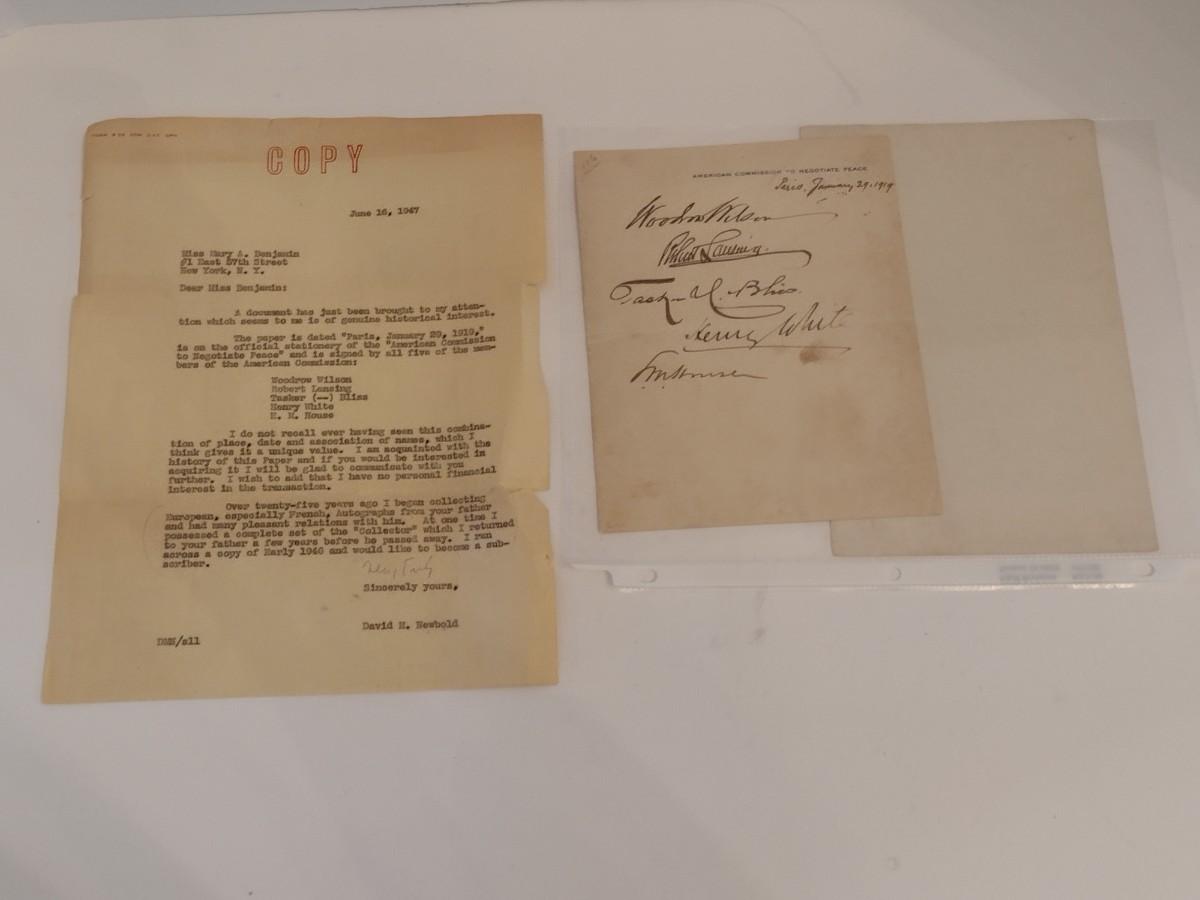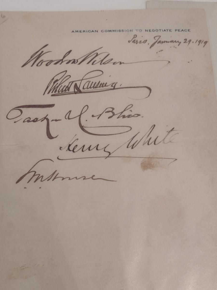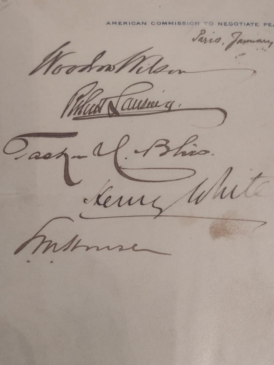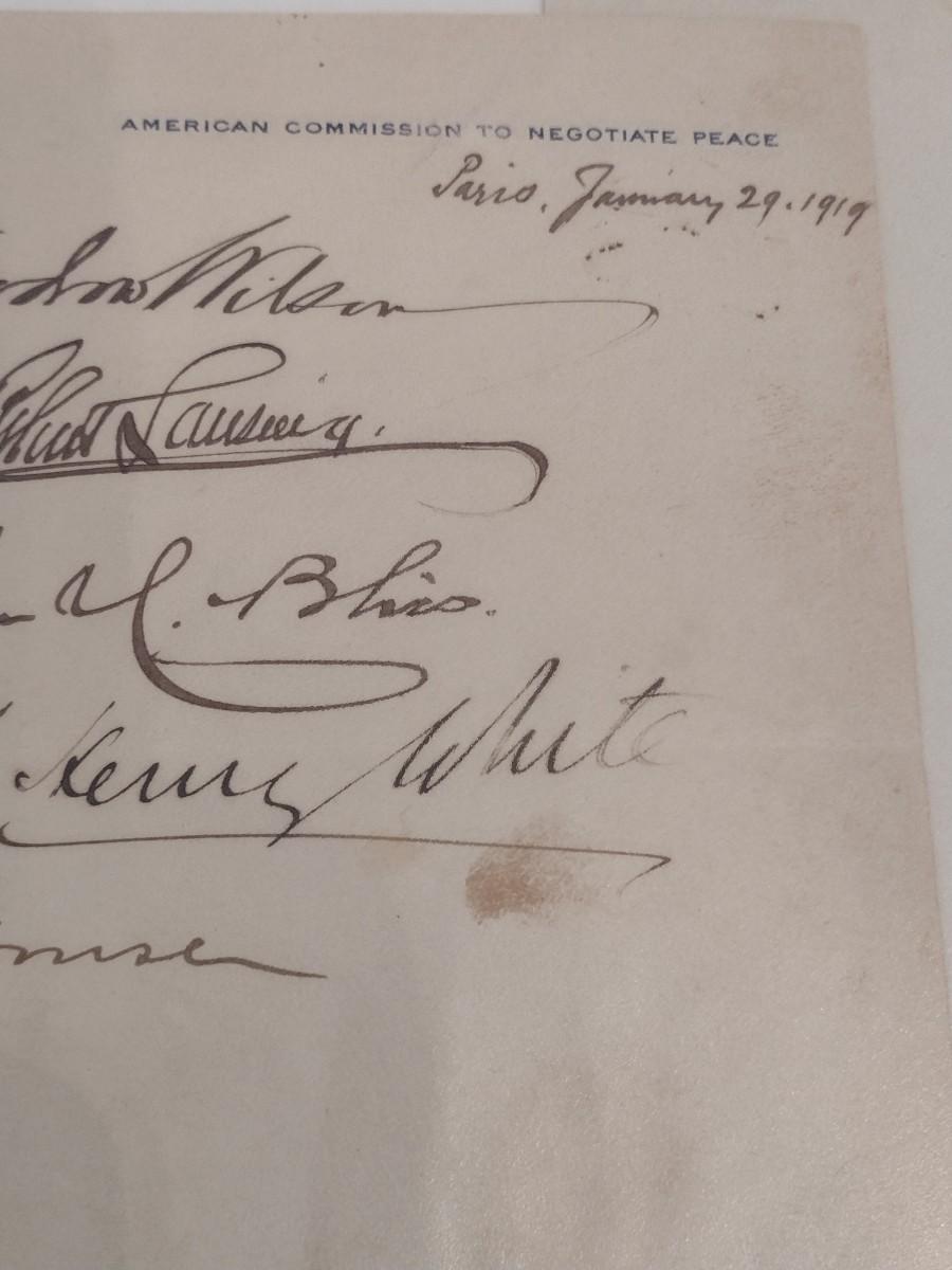 Woodrow Wilson Signature et, al. Historical Document for the January 29, 1919 Paris, France American Commission to Negotiate Peace