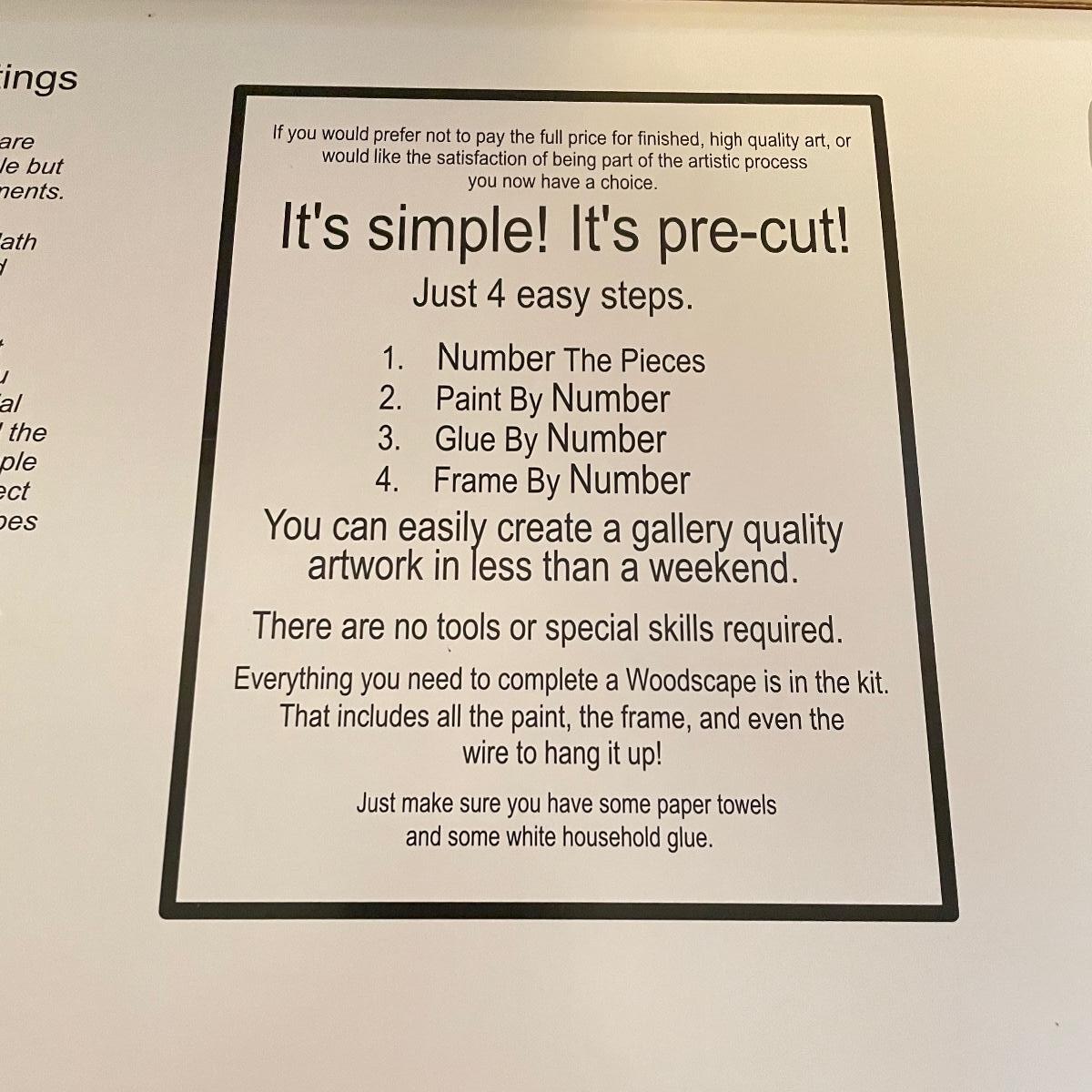 Full kit, unopened, Woodscapes of America Collection. Create your own masterpiece! Box indicates everything except paper towels and white household glue. Local pick up only.