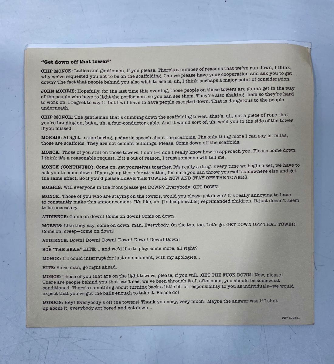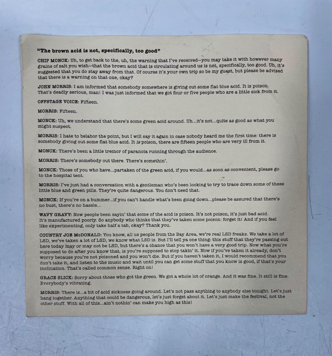 Voices of Grace Slick, Joe of Country Joe and the Fish, with announcements for attendees to get down from scaffolding and about “bad acid”. Cotillion Records, re-released by Rhino Records, in rare Blue vinyl.