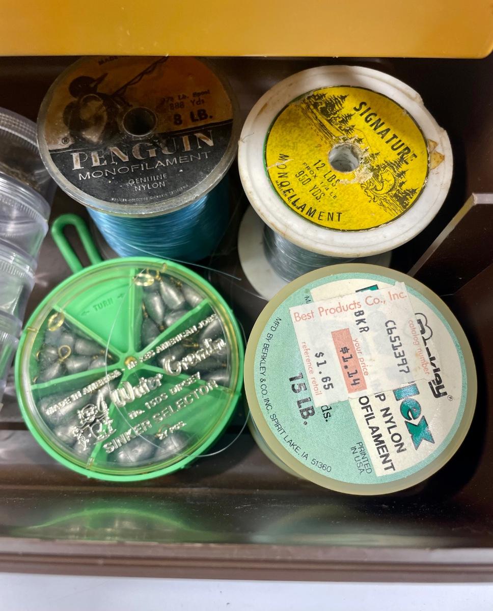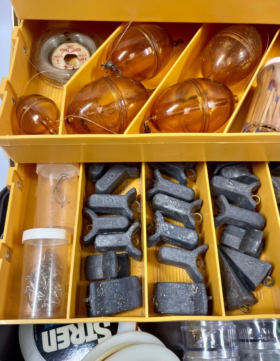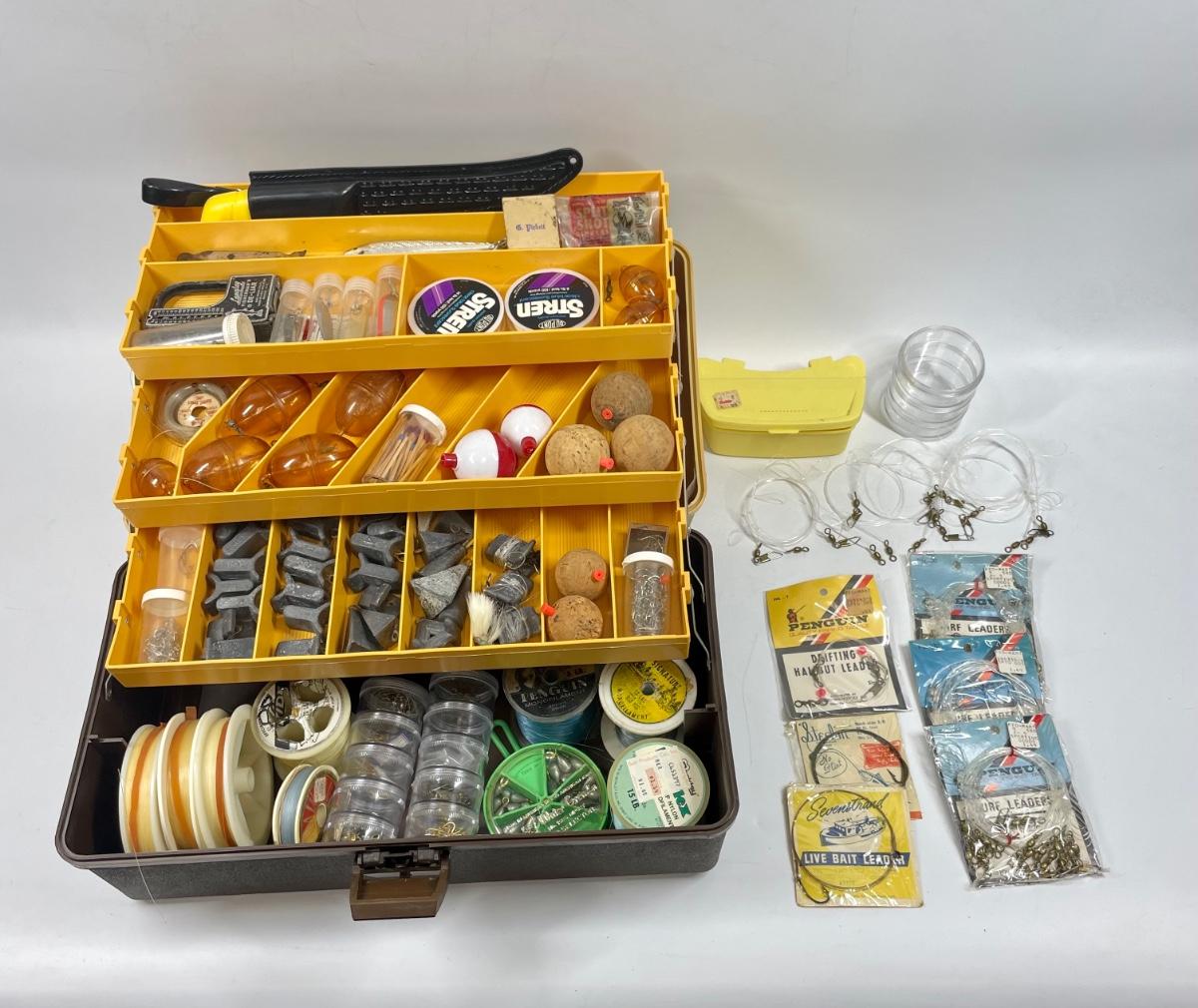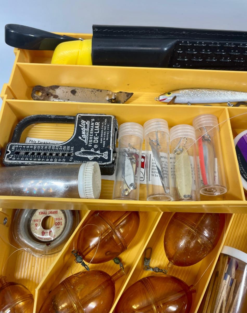 Plastic tackle box with over 50 items: fish scale (weight and tape measure) knife with belt scabbard, spools of fishing line, leaders, hooks, lures, weights, bobbers, See photo for what’s included.