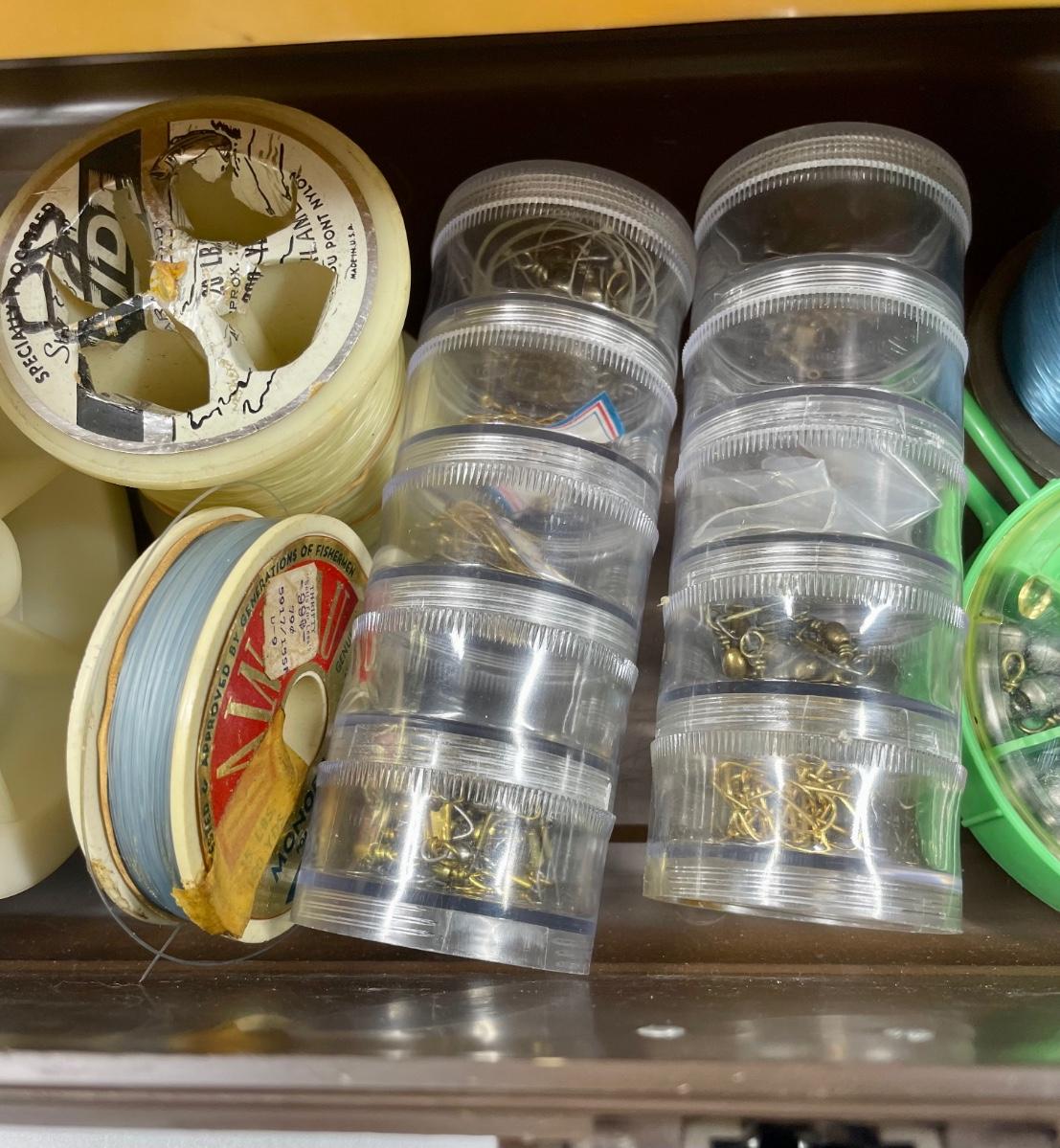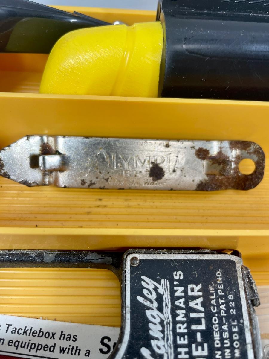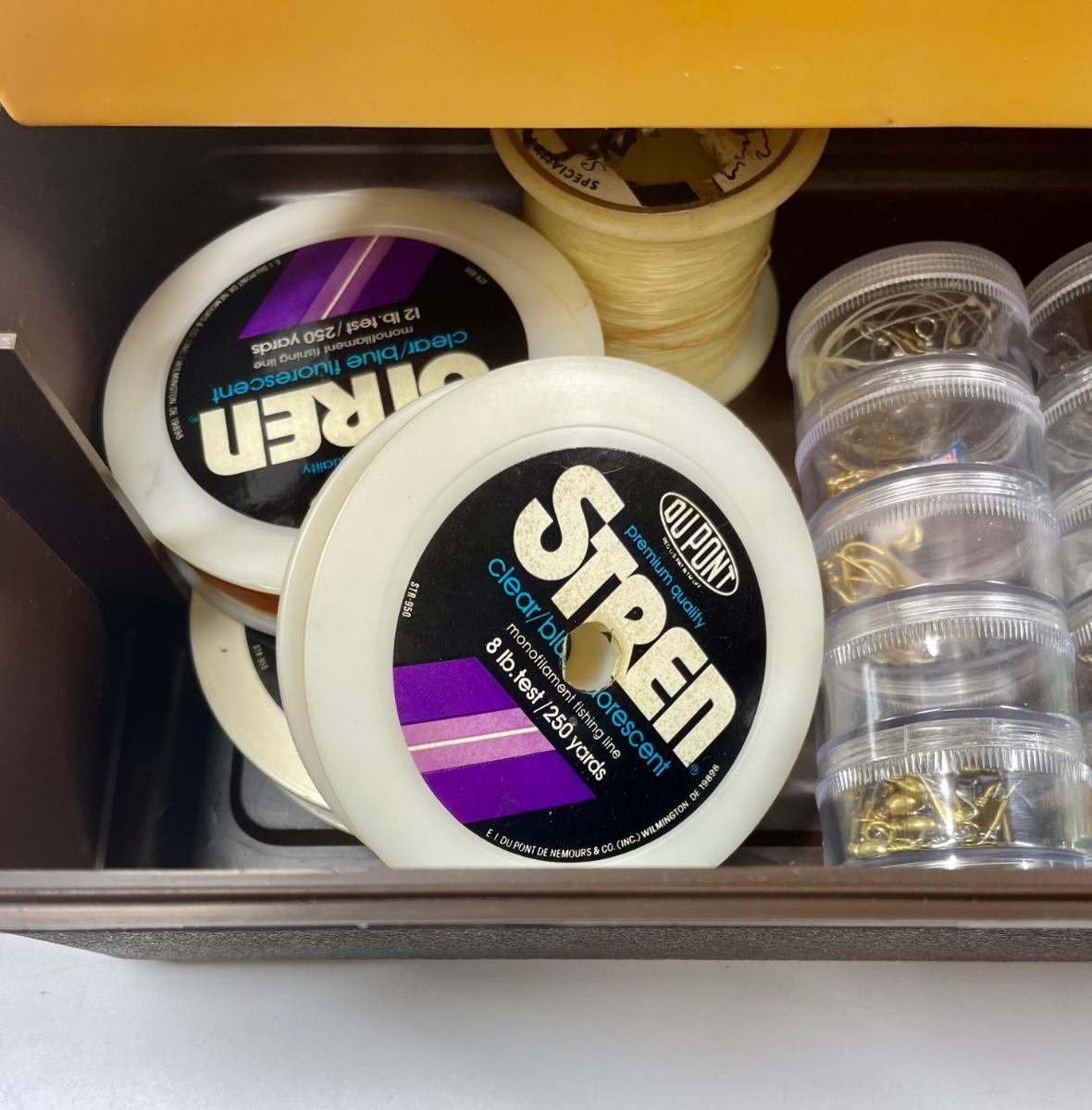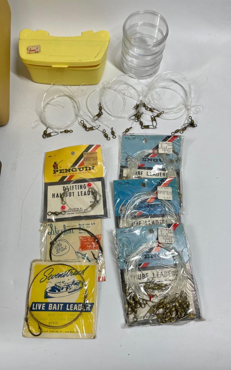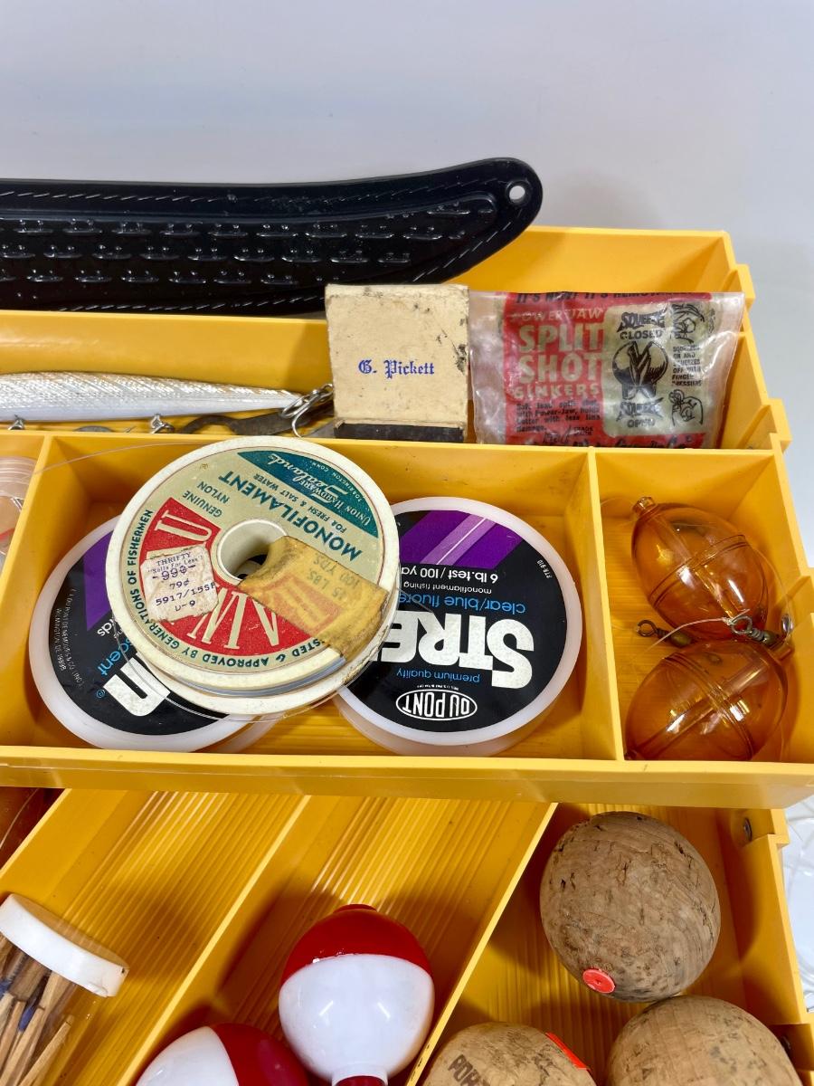 Plastic tackle box with over 50 items: fish scale (weight and tape measure) knife with belt scabbard, spools of fishing line, leaders, hooks, lures, weights, bobbers, See photo for what’s included.