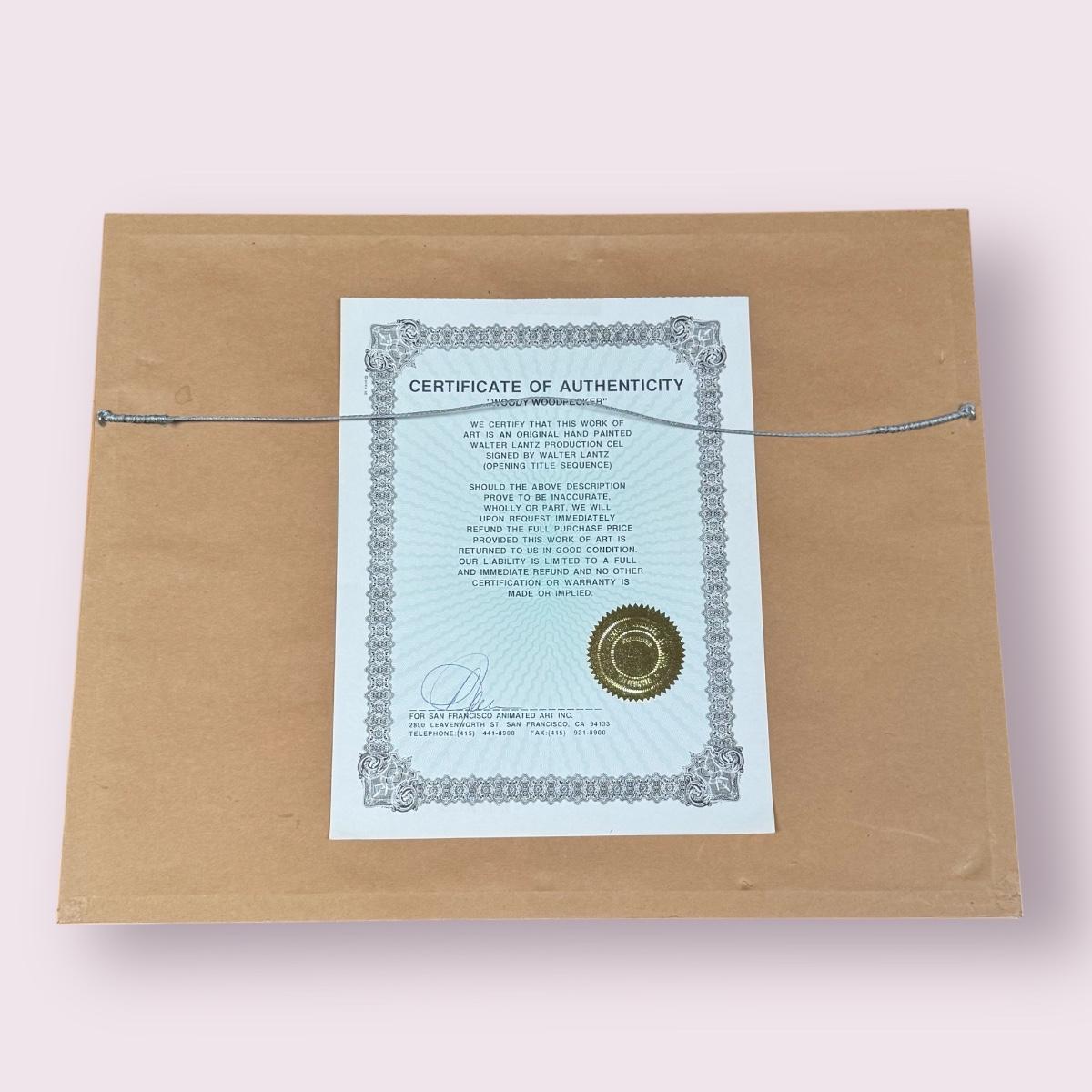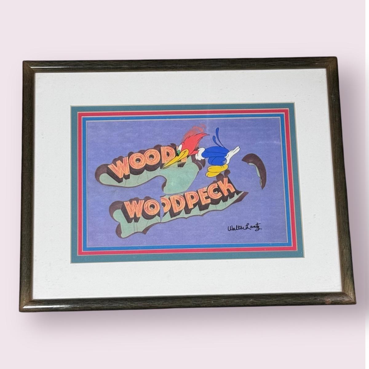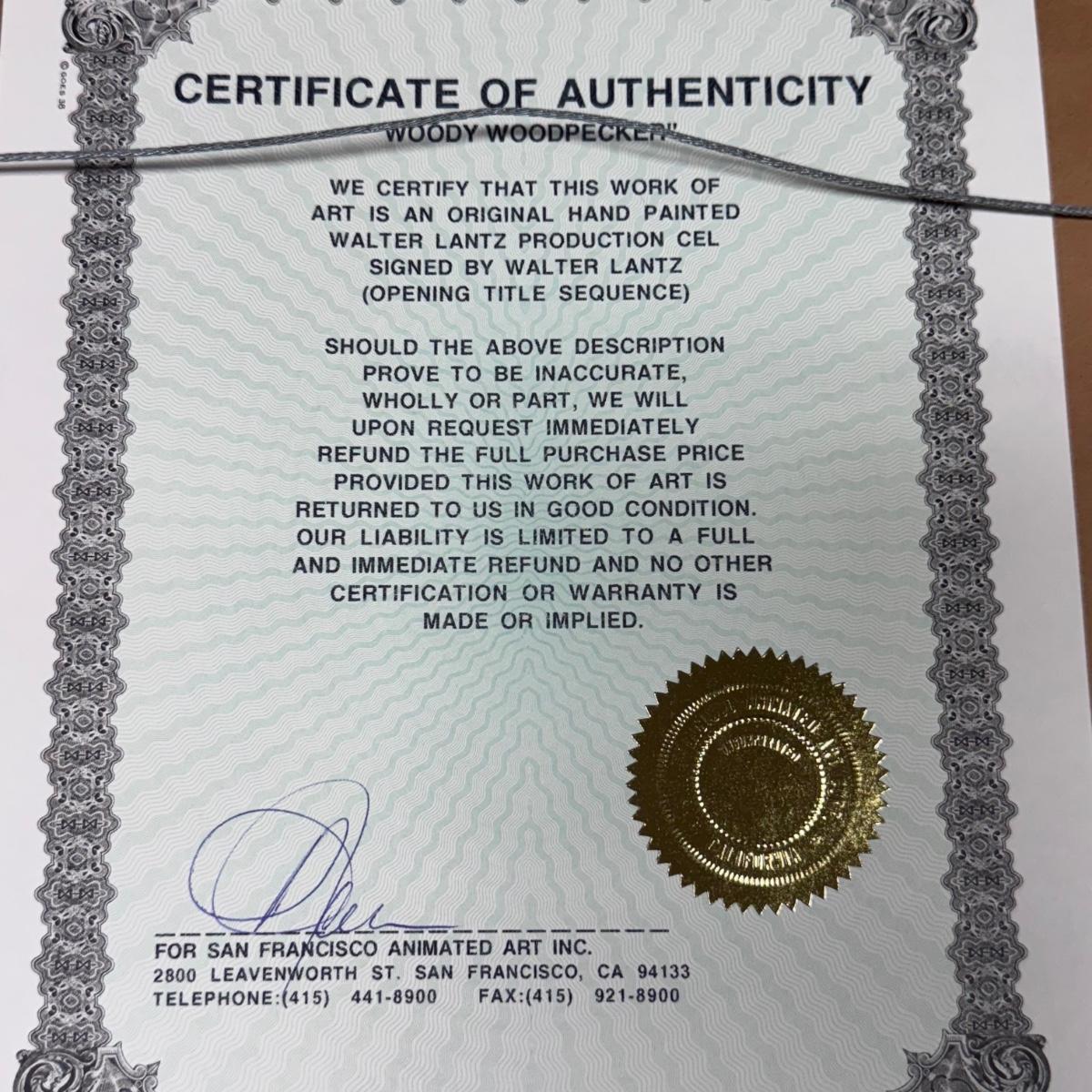 This lot includes one framed “Woody Woodpecker” cel by Walter Lantz. The cel is protected with a layer of plastic, four mattings, and a wooden frame that has been painted a glossy dark green. The frame measures 18” x 14”H. There is a certification of authentication tapes to the back of the frame - see picture included.