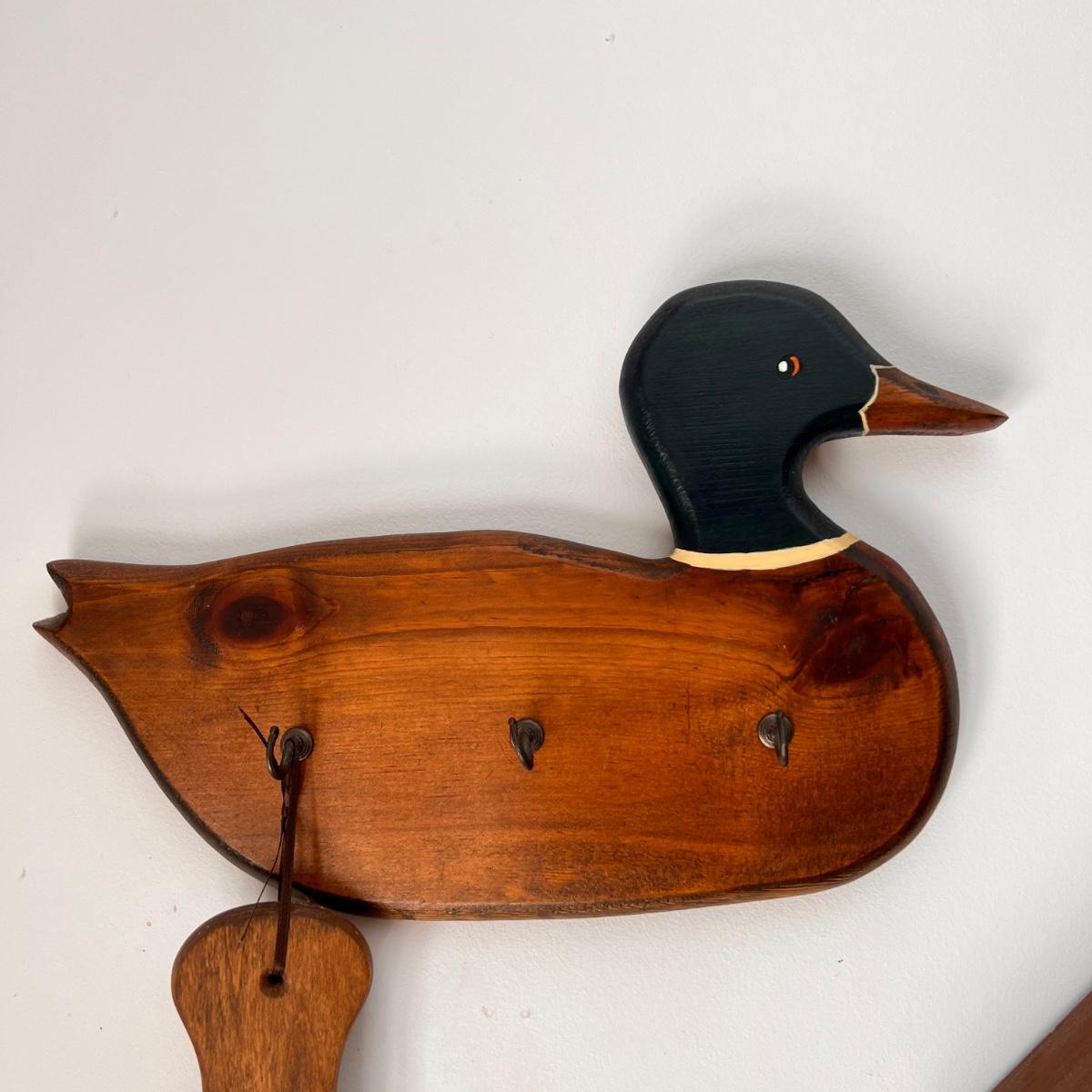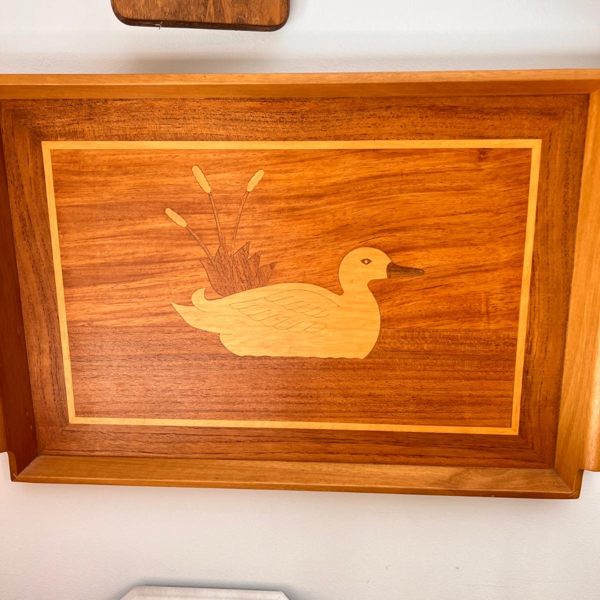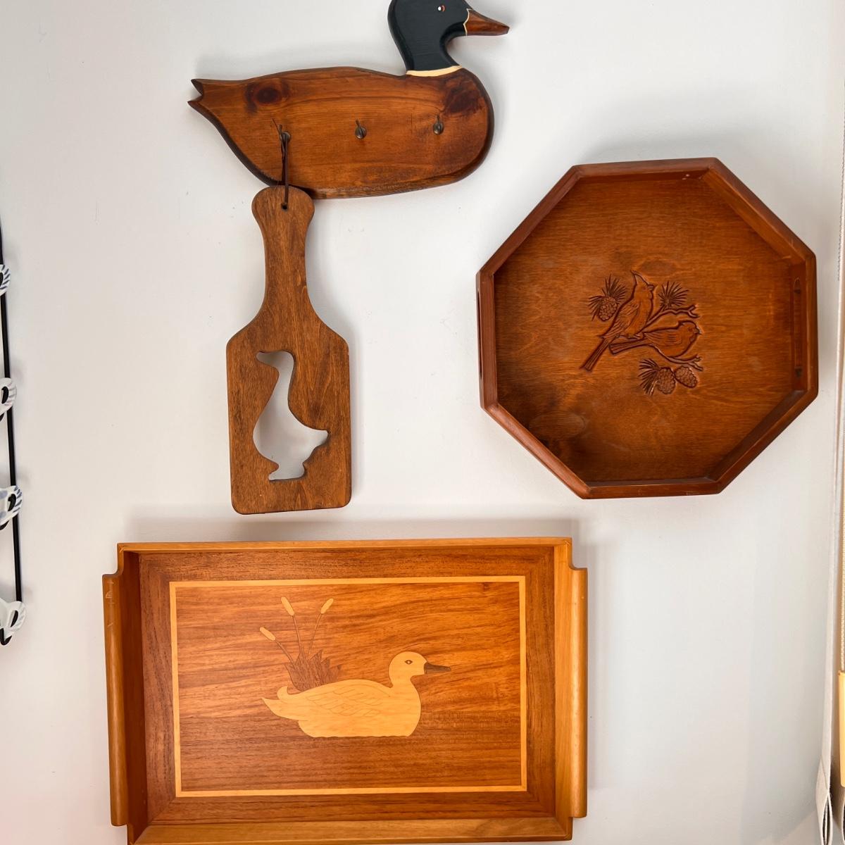 2 trays, one carved and one inlaid, duck wall mount hooks, Longaberger duck stencil-cut butter paddle