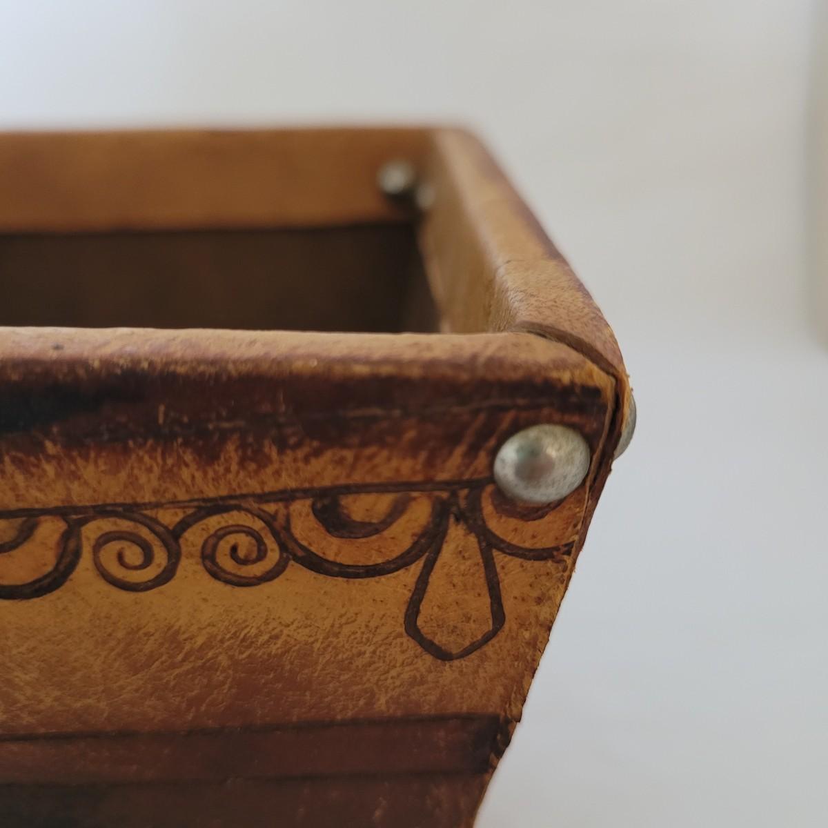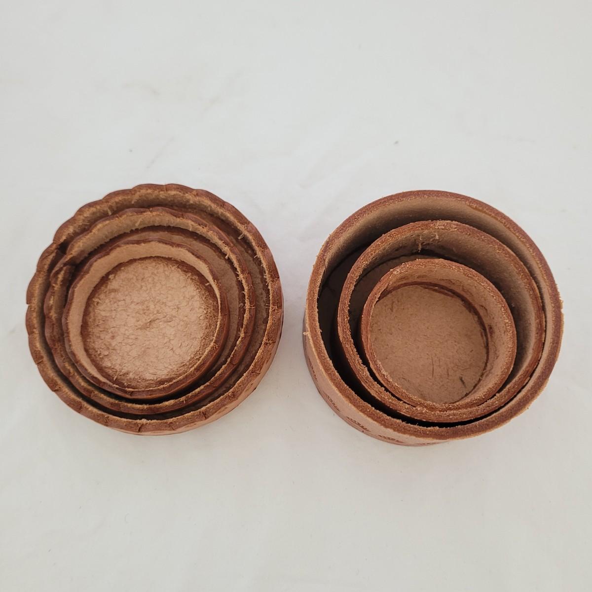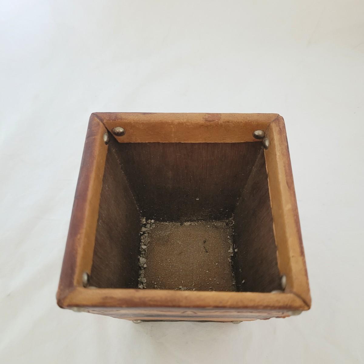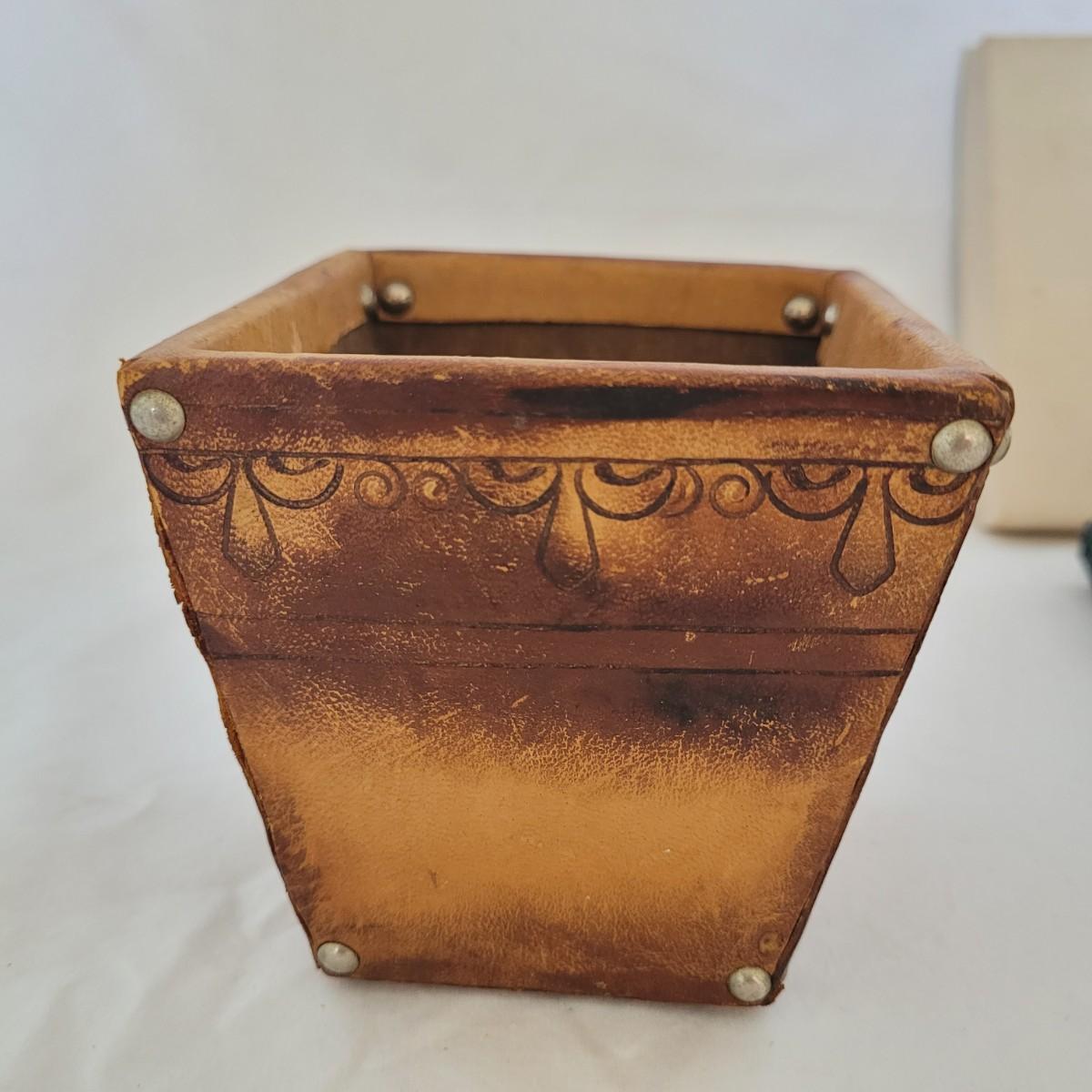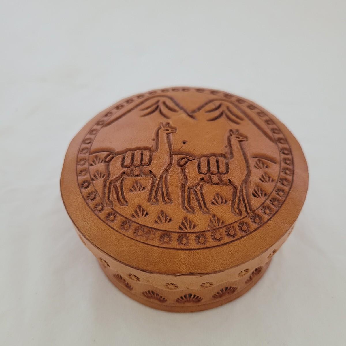 This collection of South American style decor includes a wool Chimayo “La Azteca” bag with a small mirror that fits in the interior pocket, a leather bound container, and carved leather nesting boxes. Container measures approximately 4” x 4” x 4”H (measured at top). Shipping available.