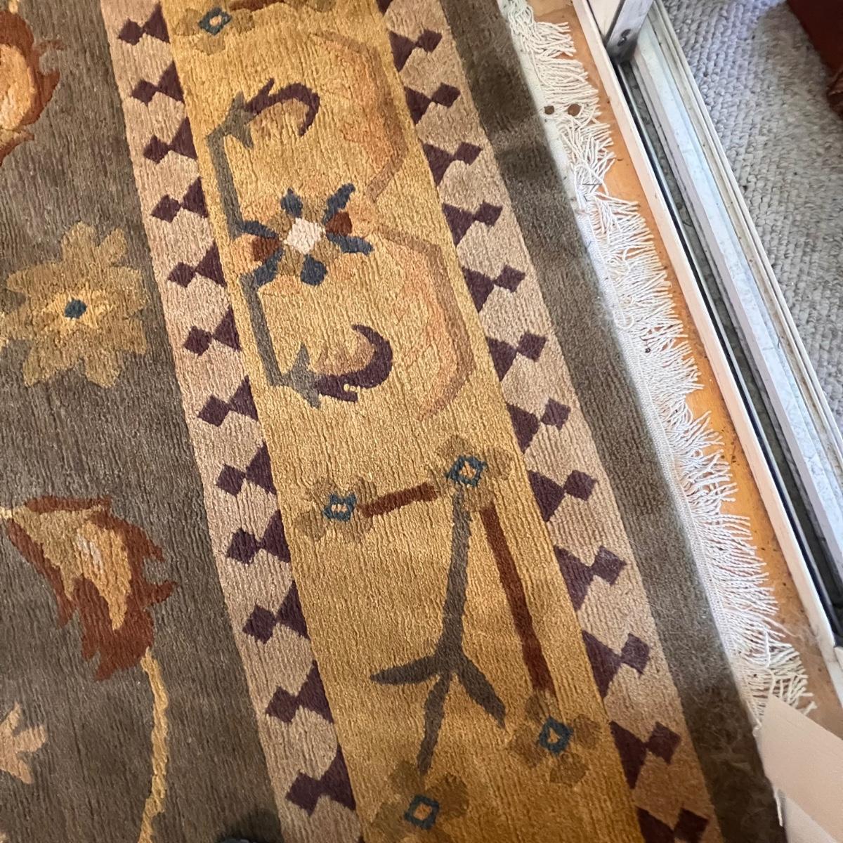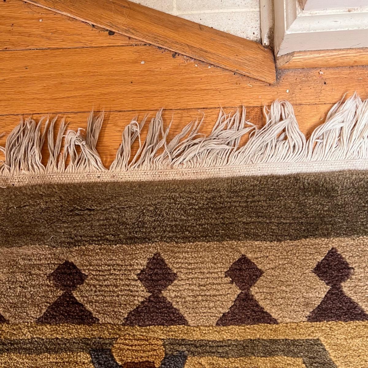 Stunning earth toned rug appears to be handspun wool, but no labels found. Colors include olive green, tan, brown, blue and orange. There has been some fading from sun; you will see the middle is slightly darker as a coffee table protected it. Item comes from home with pets and has pet hair present.