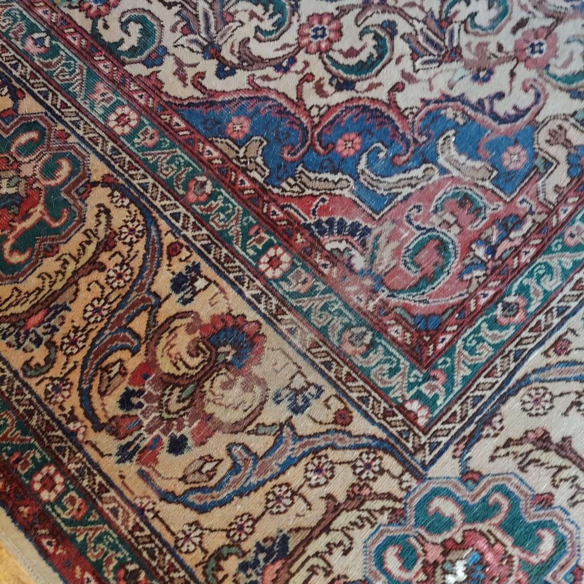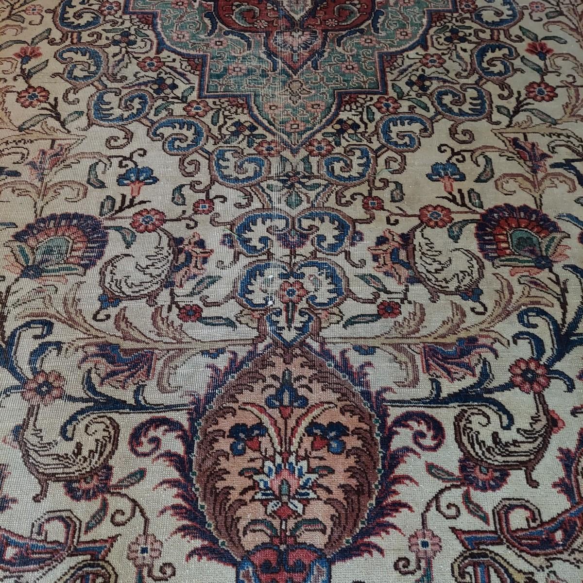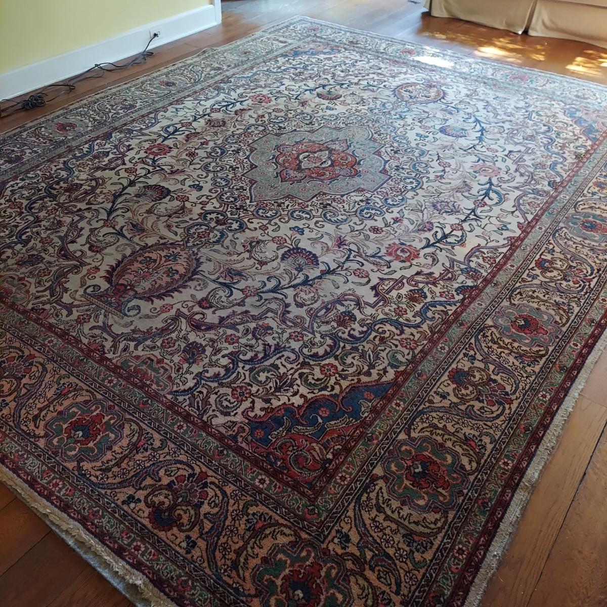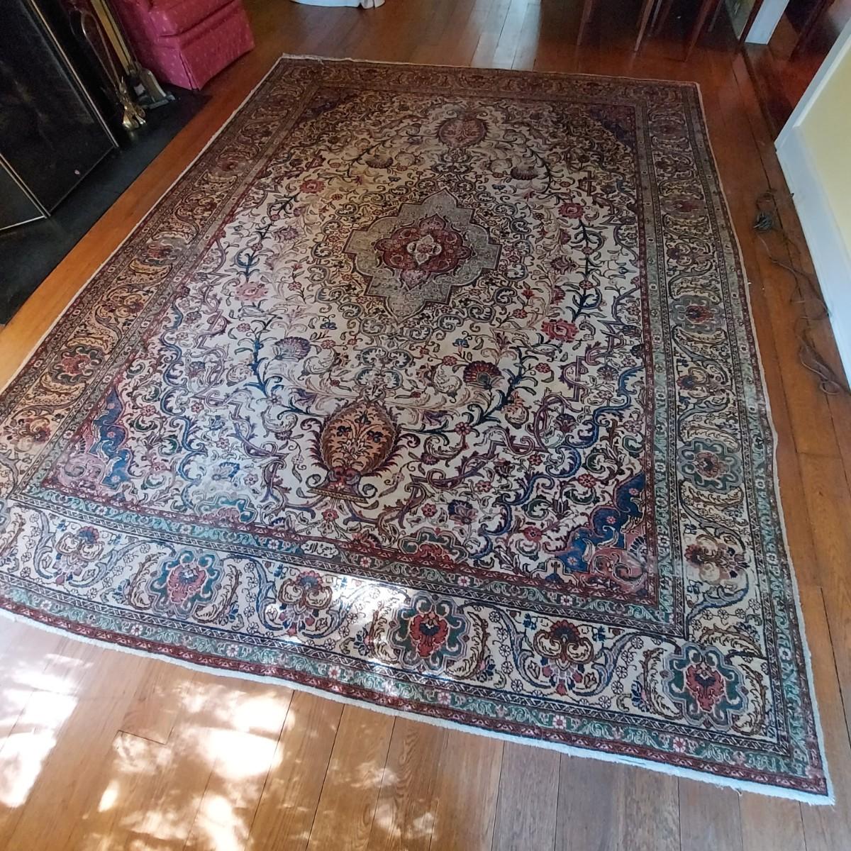 Large wool area rug. Tan with red, green and blue damask style all over print. No tags, appears to be wool. Comes with pad. Rug measures approximately 9'9" x 12'5". There are some worn spots. Please see photos. Local Pickup Only