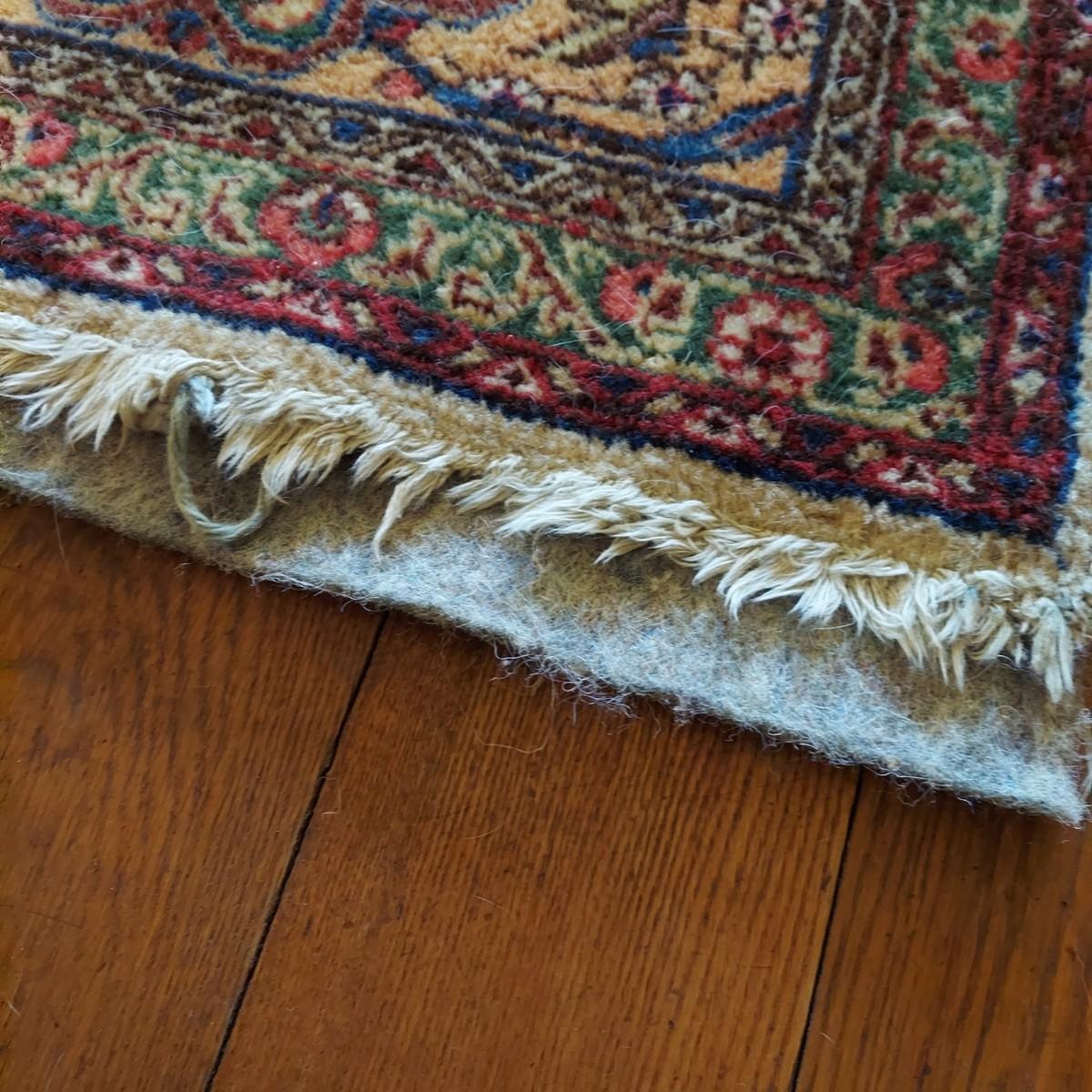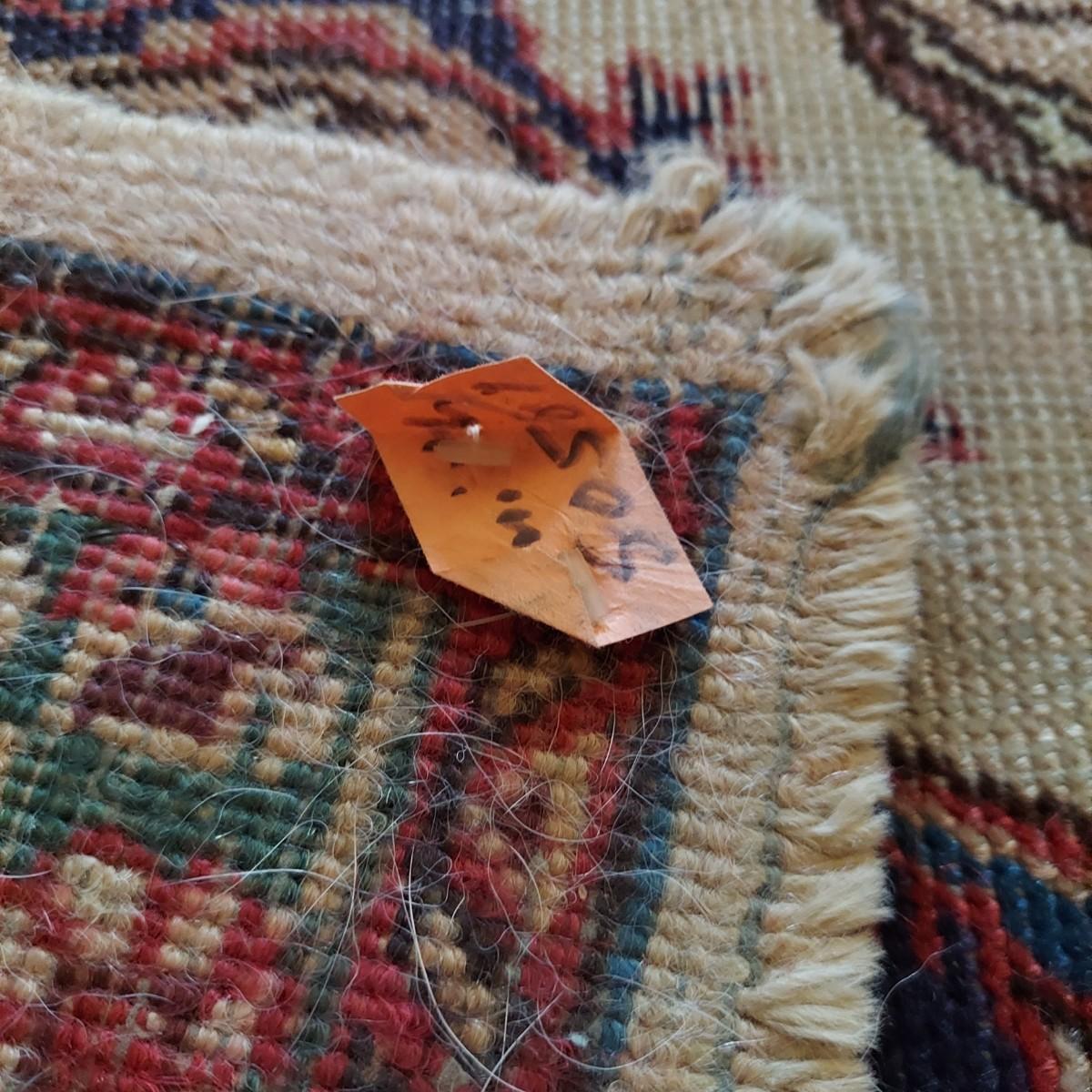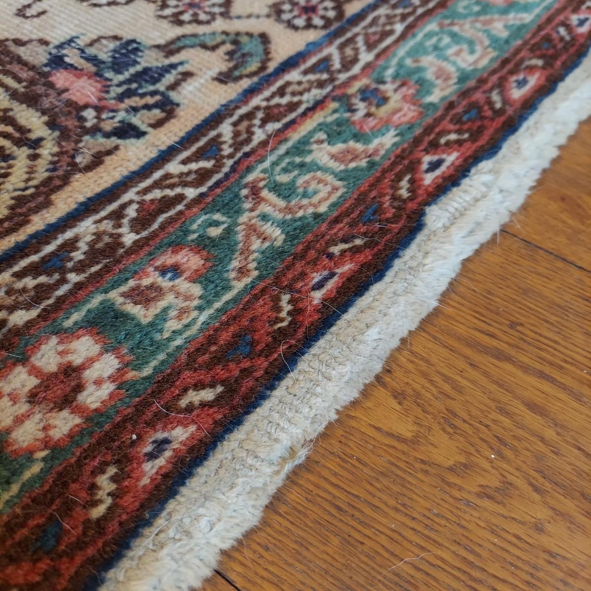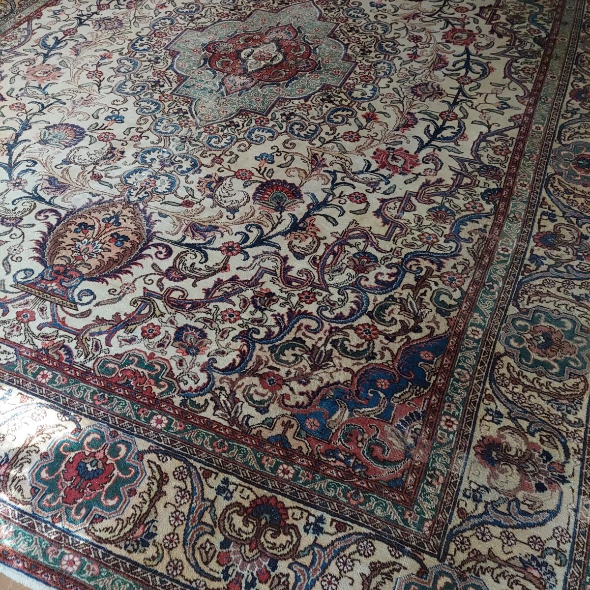 Large wool area rug. Tan with red, green and blue damask style all over print. No tags, appears to be wool. Comes with pad. Rug measures approximately 9'9" x 12'5". There are some worn spots. Please see photos. Local Pickup Only