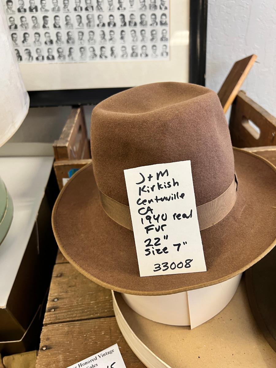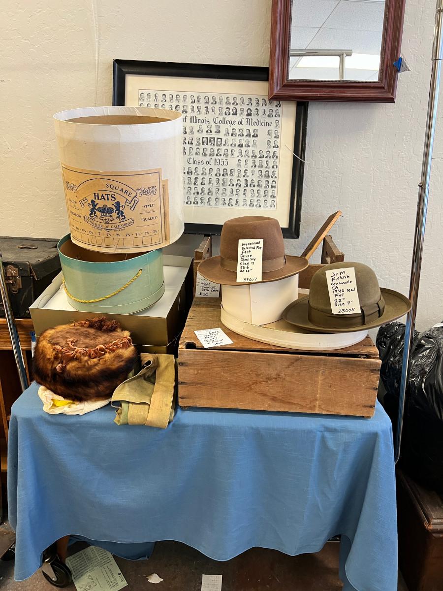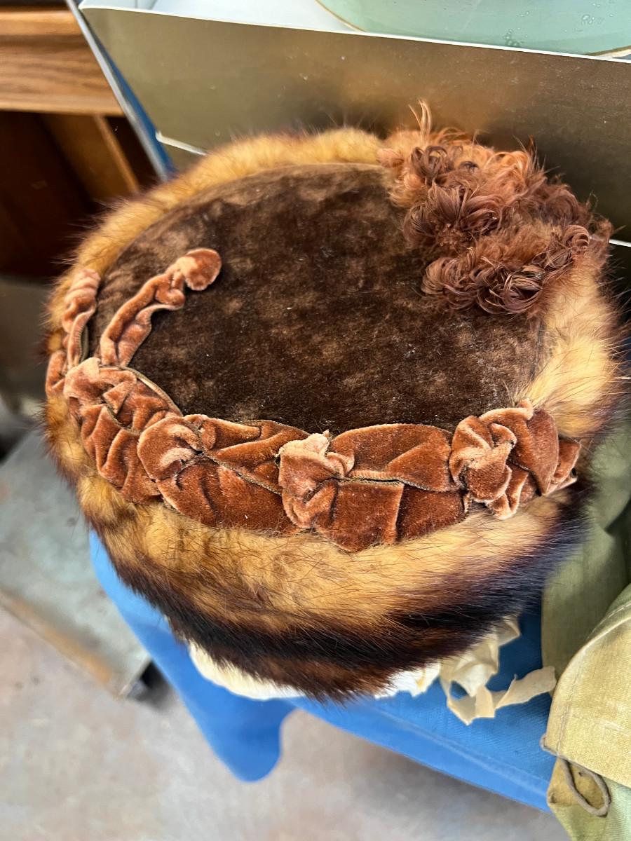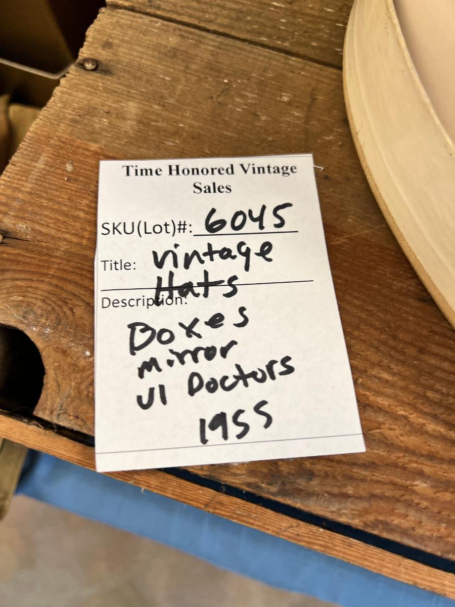 The fur hat is made by a very fine milliner and copies a 1910 Victorian style . The fur is in excellent condition. There are 3 vintage hat boxes with cardboard hat rings. The 2 fedoras are both small size, measurements on the cards. 2 wooden display crates, Henry beer box needs repair. There is a medical school 1955 framed. 1 mirror and a piece of WW1 green material. No shipping, unless you just want the hats.