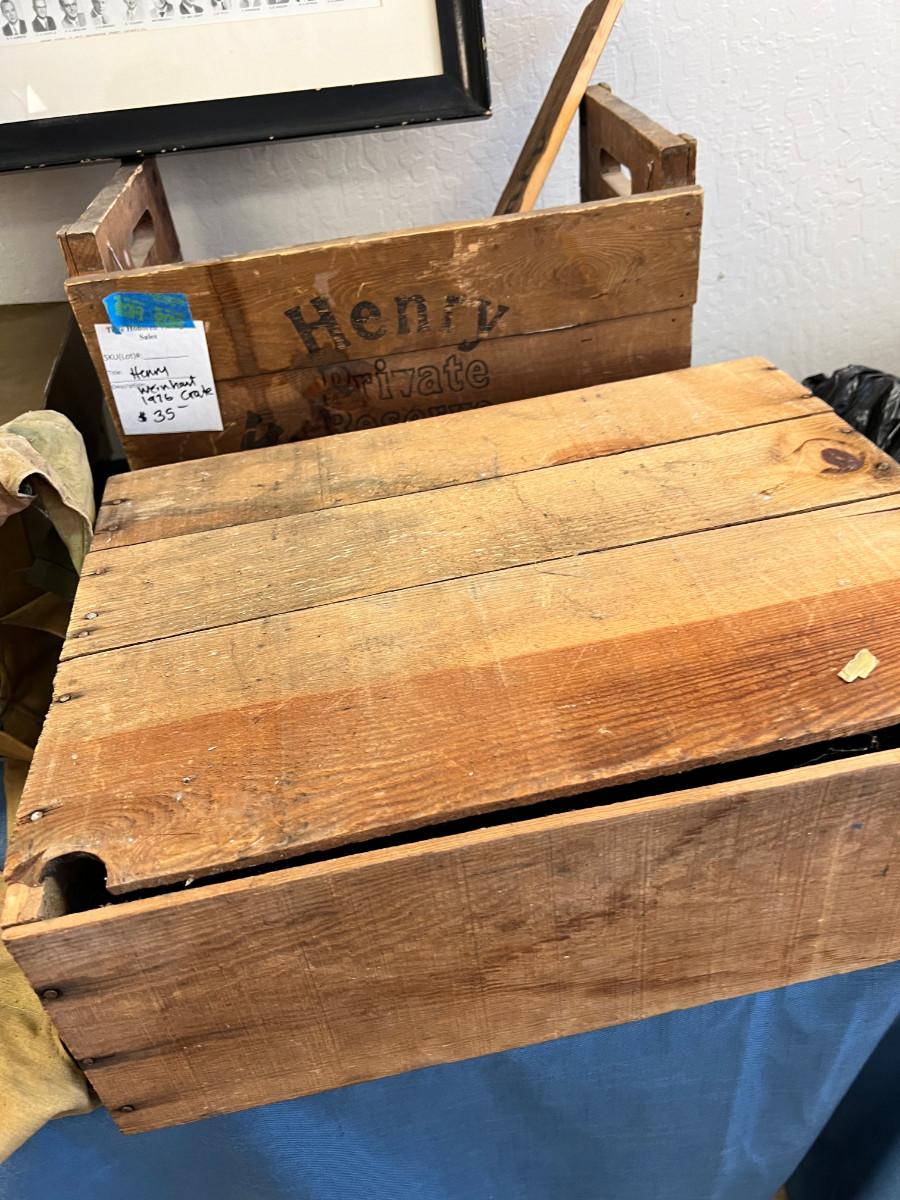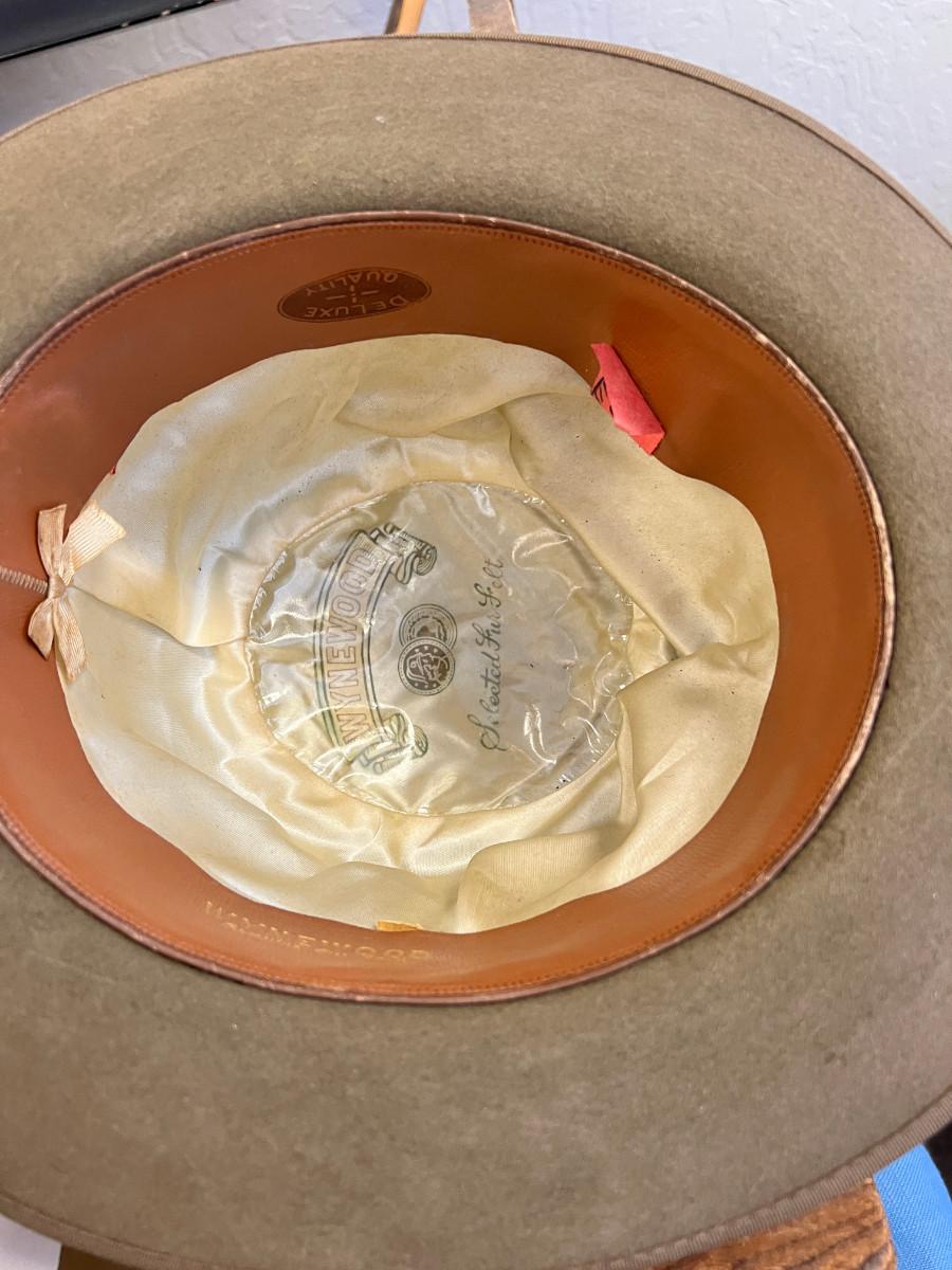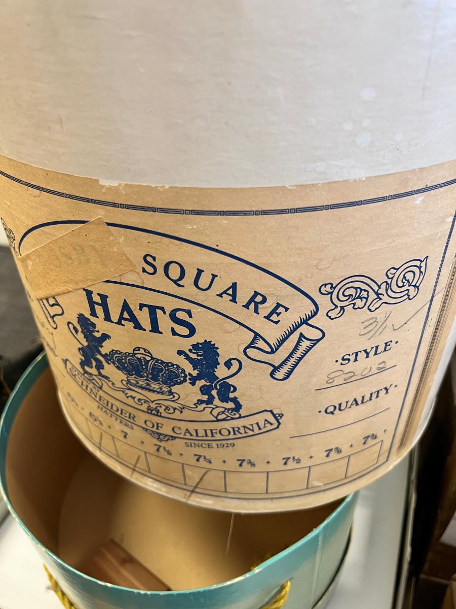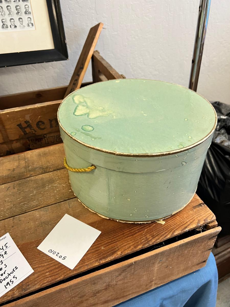 The fur hat is made by a very fine milliner and copies a 1910 Victorian style . The fur is in excellent condition. There are 3 vintage hat boxes with cardboard hat rings. The 2 fedoras are both small size, measurements on the cards. 2 wooden display crates, Henry beer box needs repair. There is a medical school 1955 framed. 1 mirror and a piece of WW1 green material. No shipping, unless you just want the hats.