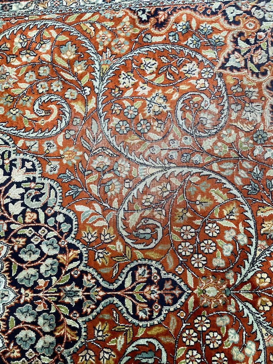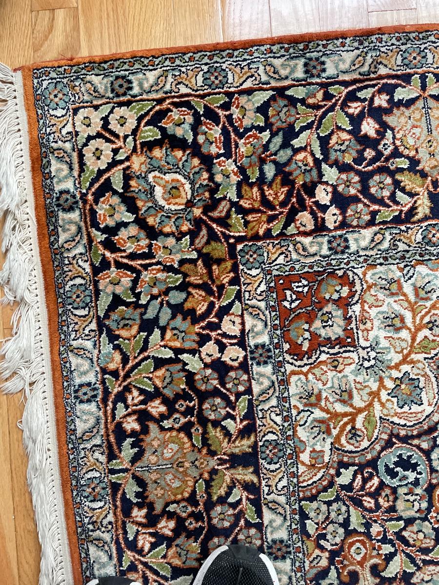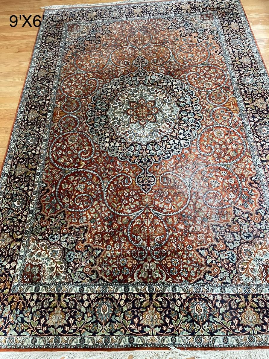 9' X 6' Needs cleaning due to a pet stain and there is a worn spot (see photo). Very high quality rug purchased in India