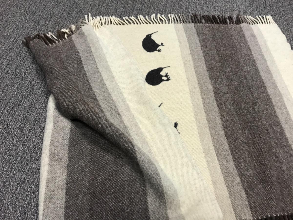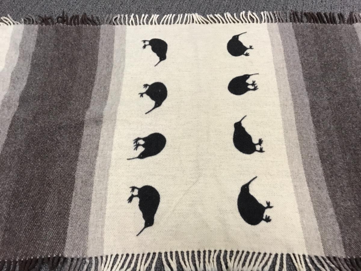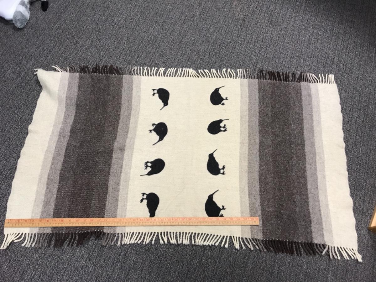 Wool lap blanket 52” x 30”, Pendleton type stripes and birds (Kiwi Bird?)