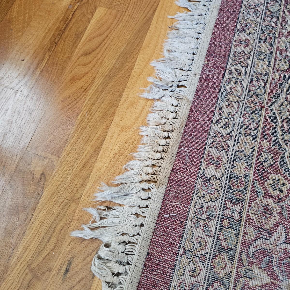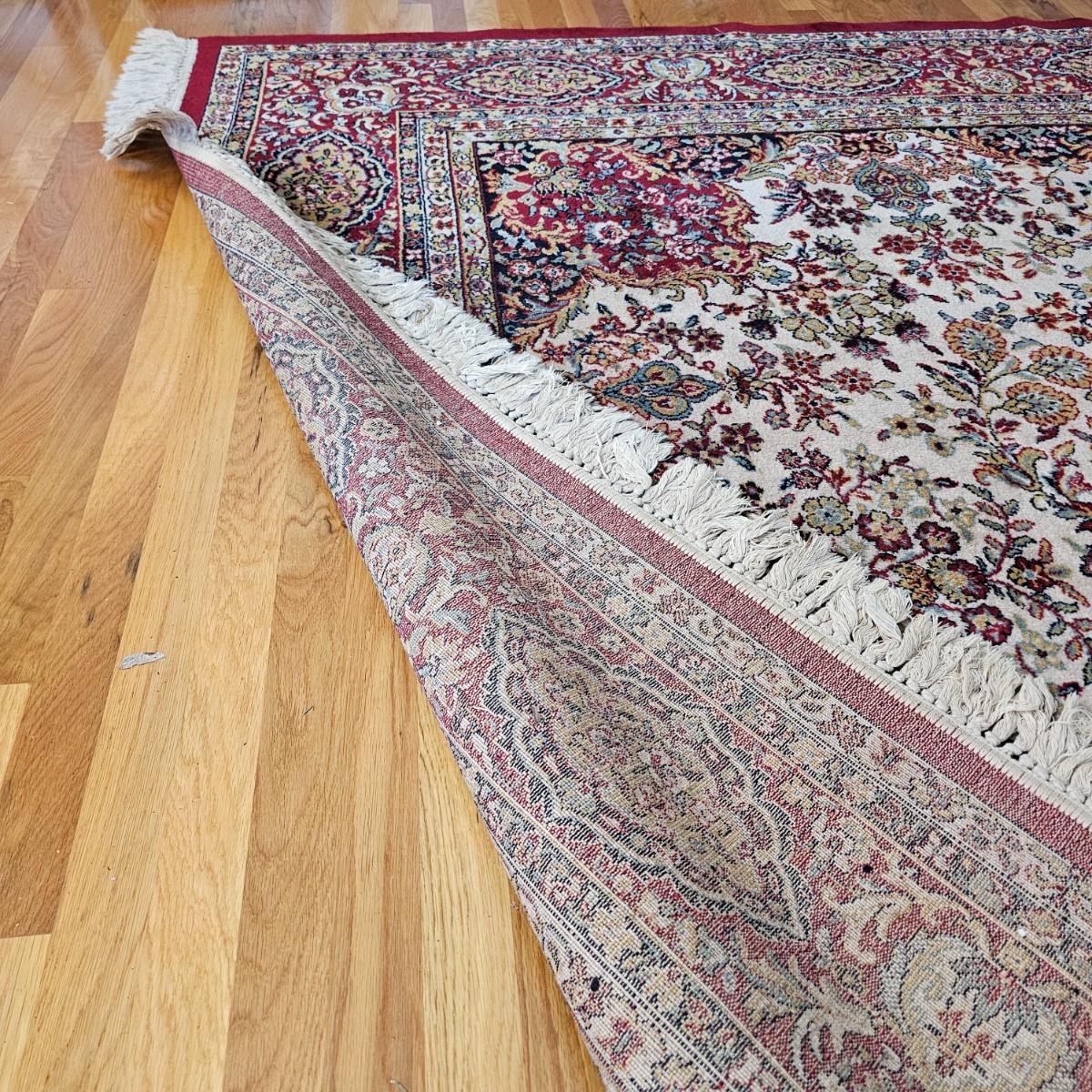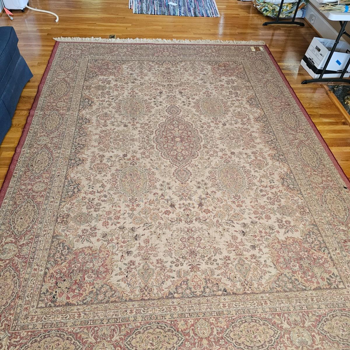 Vibrant reds and soft background colors highlight this Persian style area rug. 100% wool with knotted fringe ends, this rug measures 8'2" x 11' x 10". Partial tag on back attests to wool pile but is unreadable for manufacturer. Some staining on fringe on one end and has also been trimmed in that area. See photos for details. Local pickup only. Winning bidder must bring assistance to help move and load this item due to its weight and/or size.