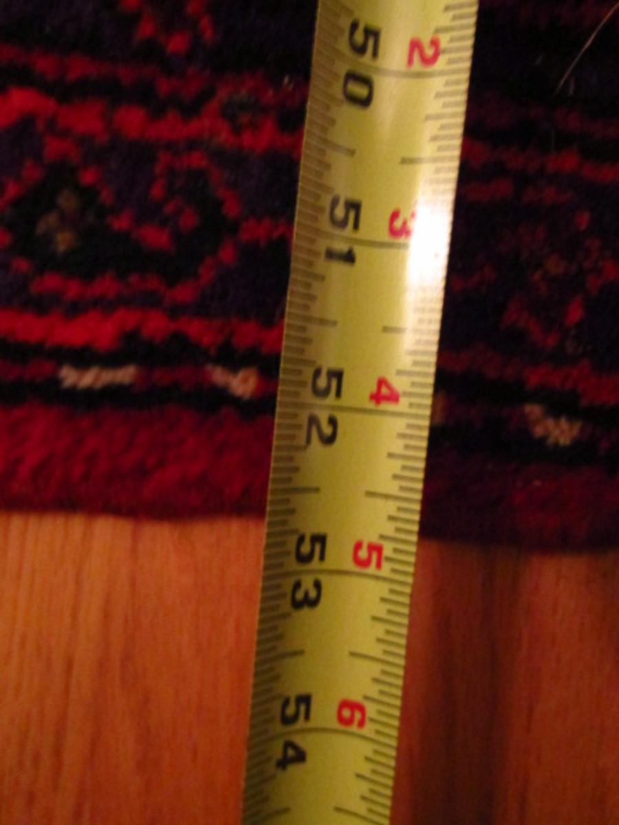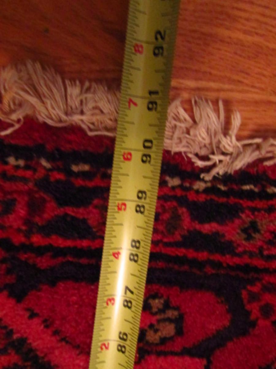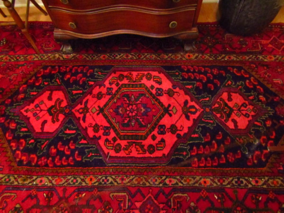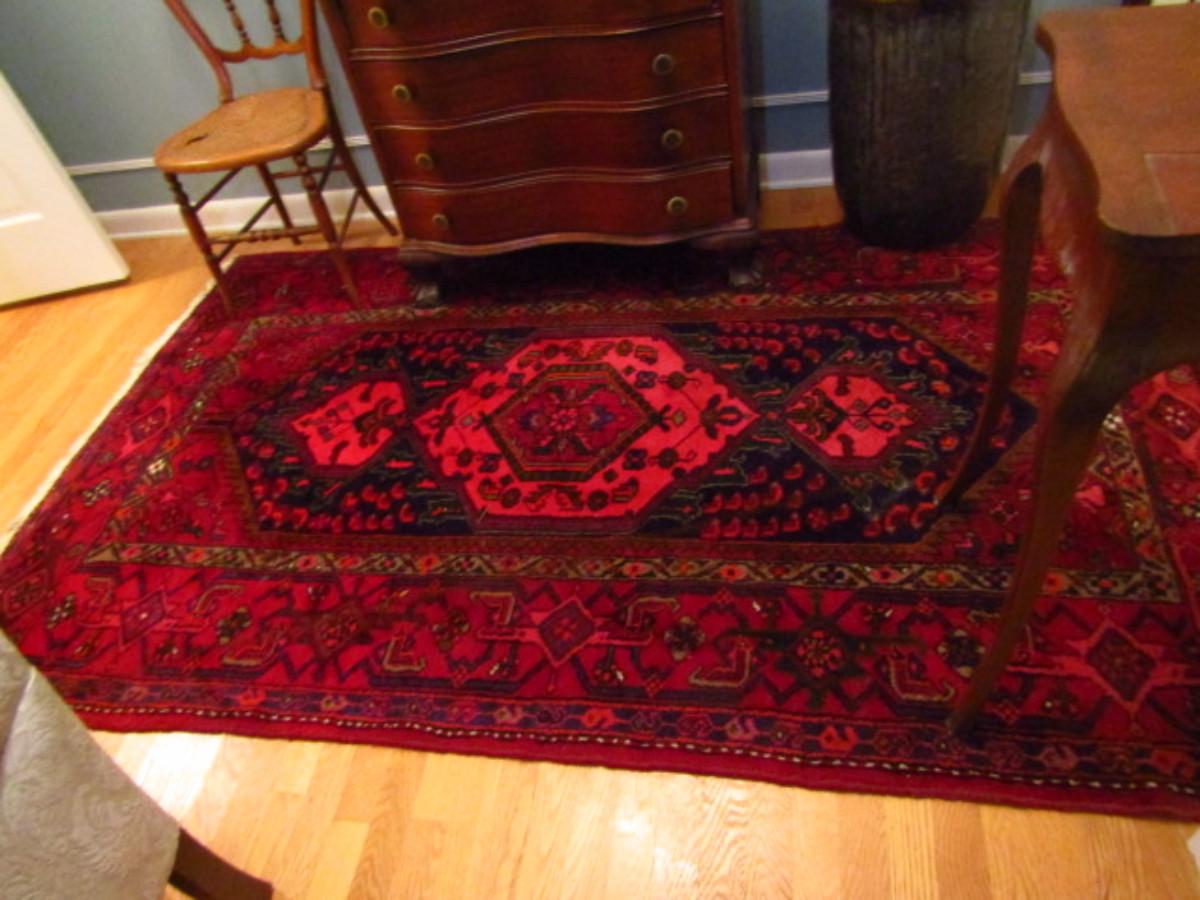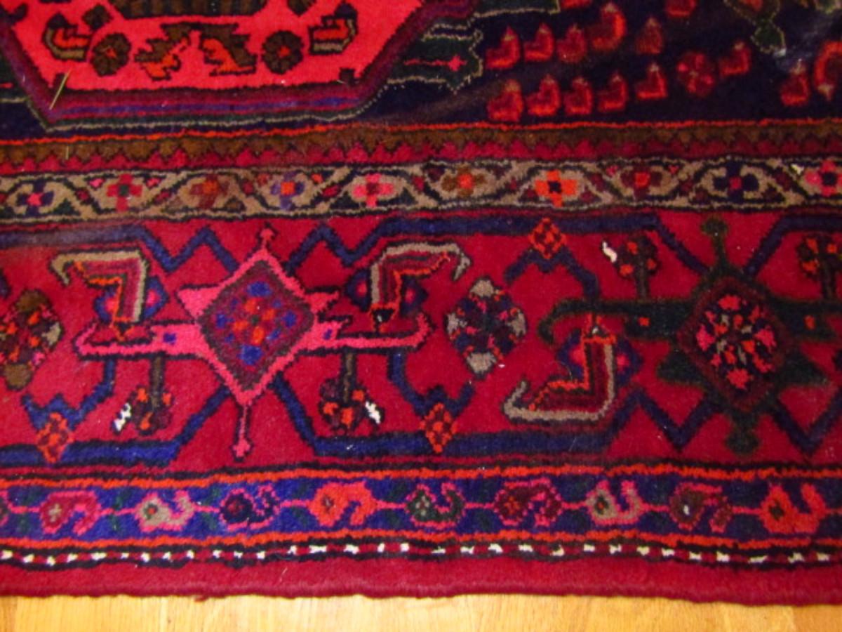 Wool Pile Area Rug- Approx 90" x 53" (Entry). Deep, dark reds and blues.