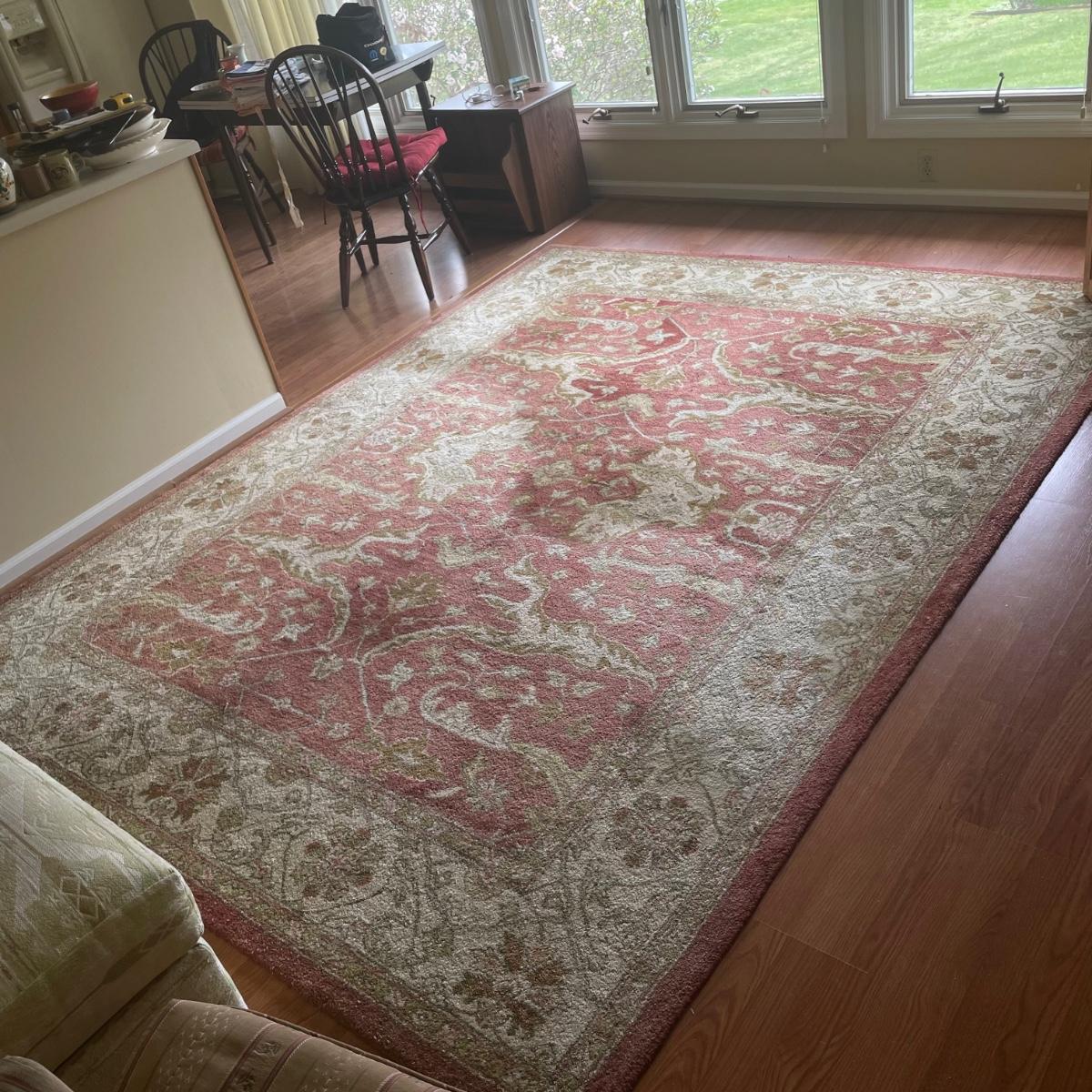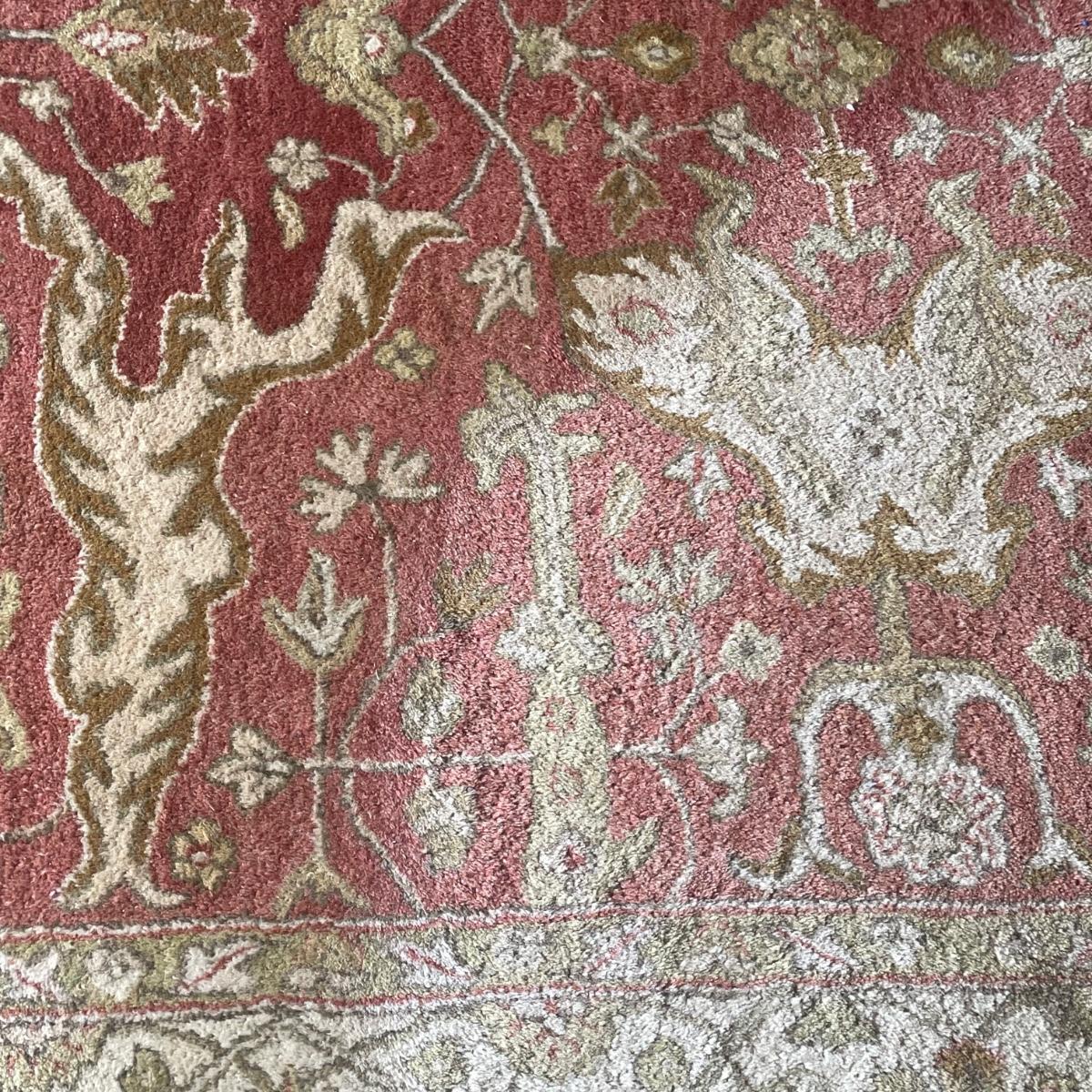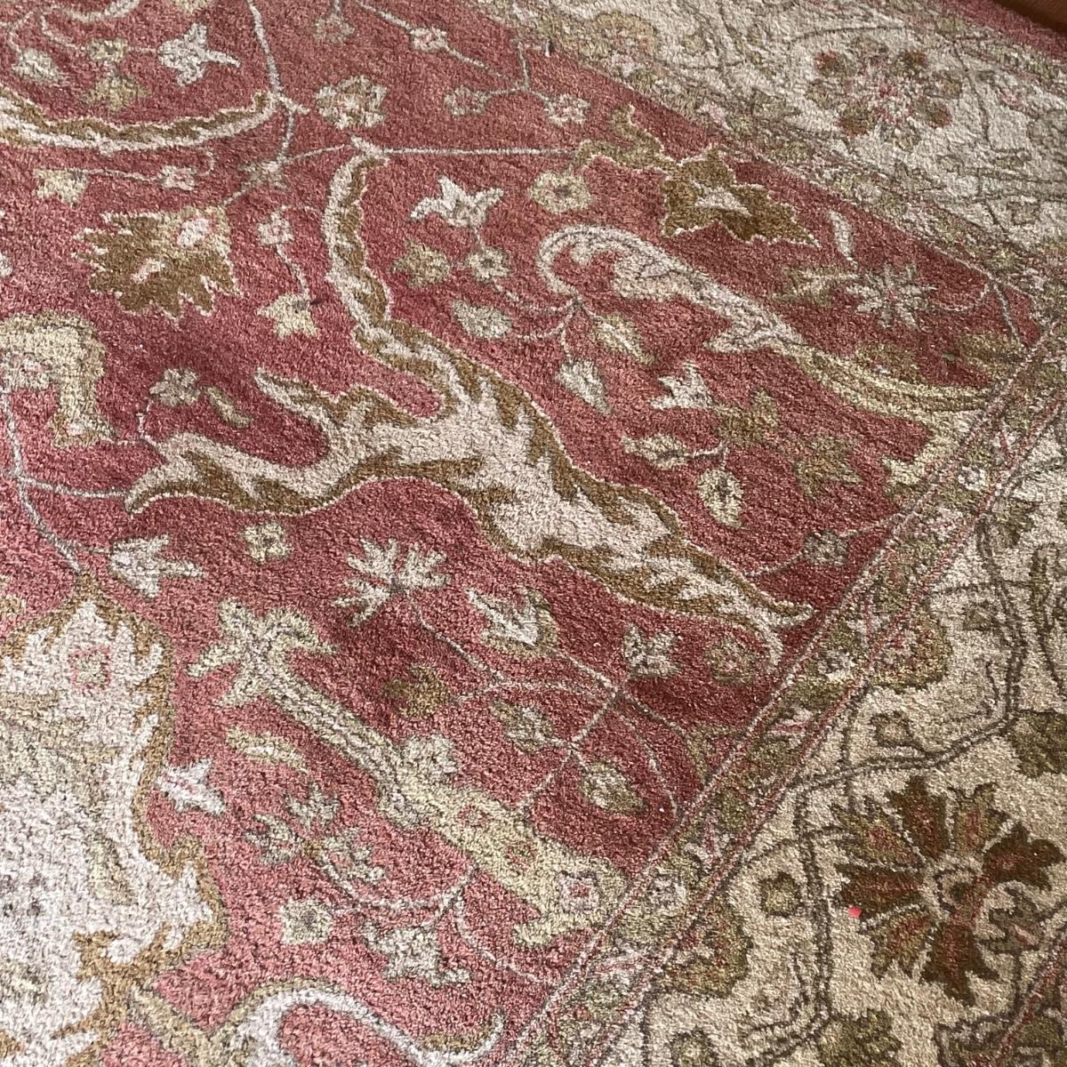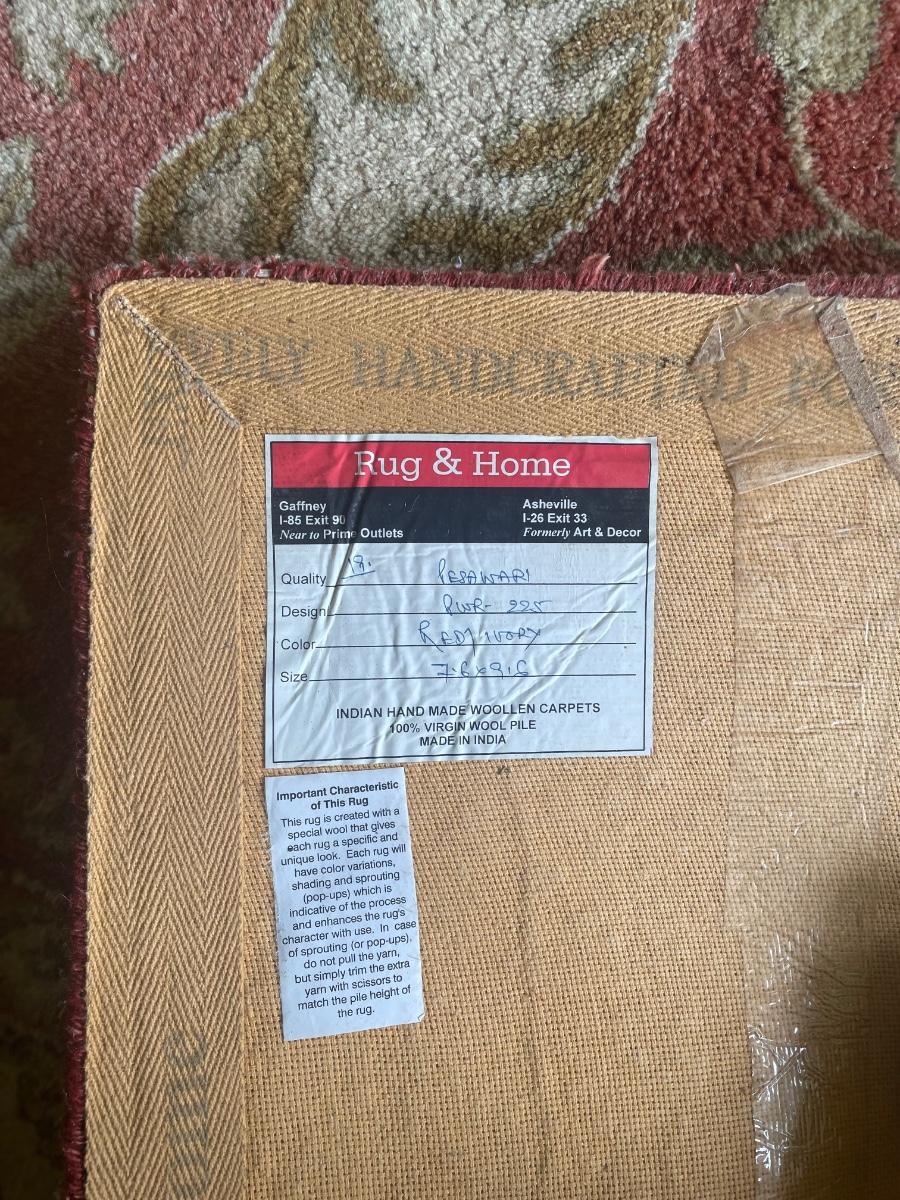 This large virgin wool pile rug from Rug & Home measures 7’6” x 9’6”. This super soft and thick rug does have some sun bleaching (darker areas have the original red/ivory colors whereas the red has faded to pink in approximately 75% of the remaining surface area). It is in good condition otherwise.