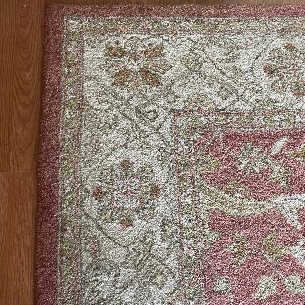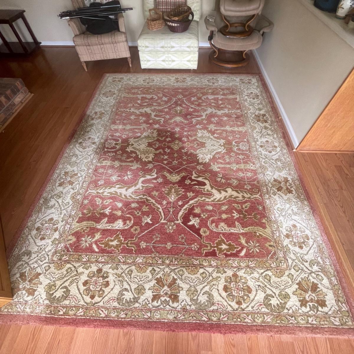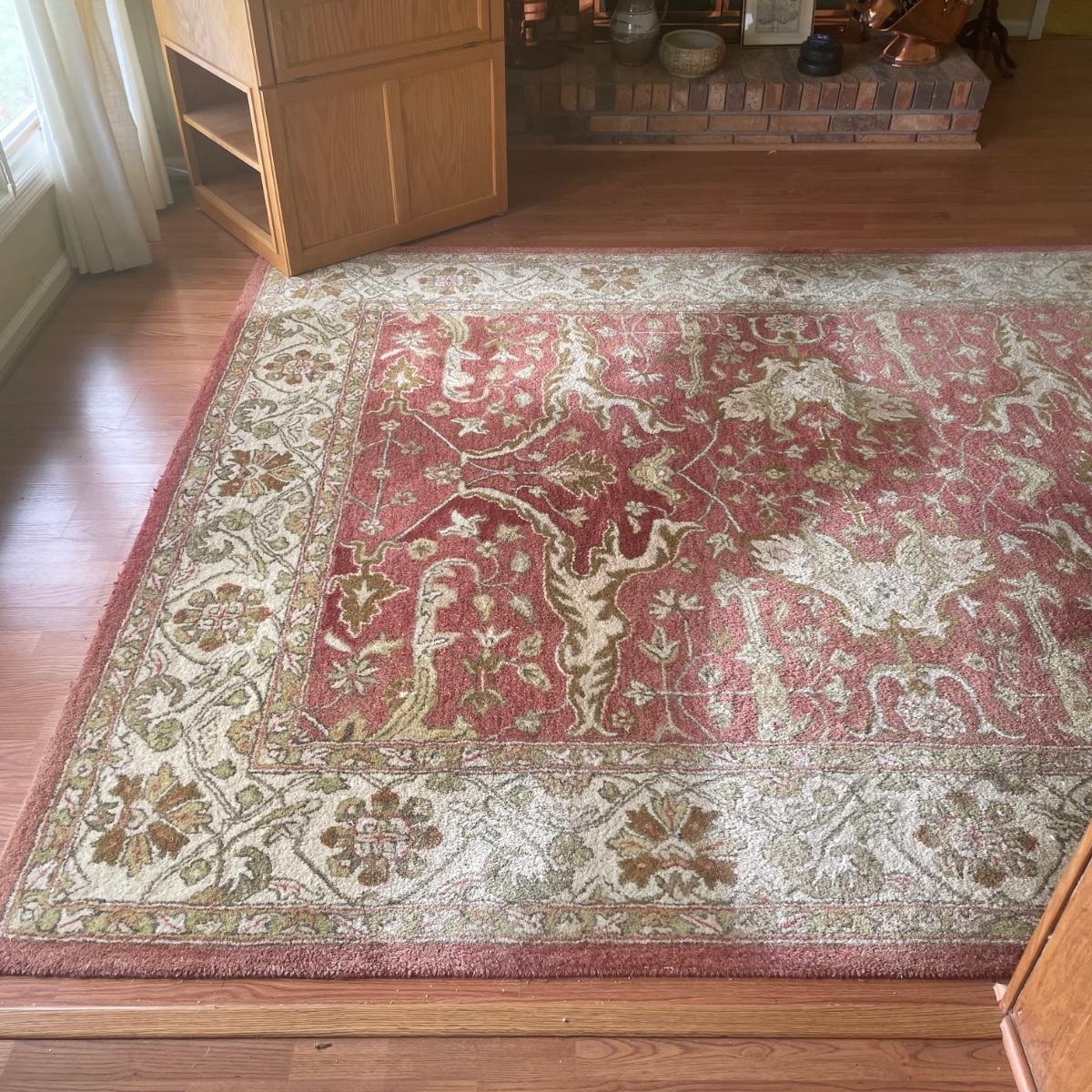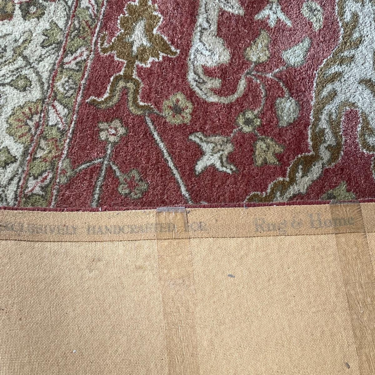 This large virgin wool pile rug from Rug & Home measures 7’6” x 9’6”. This super soft and thick rug does have some sun bleaching (darker areas have the original red/ivory colors whereas the red has faded to pink in approximately 75% of the remaining surface area). It is in good condition otherwise.