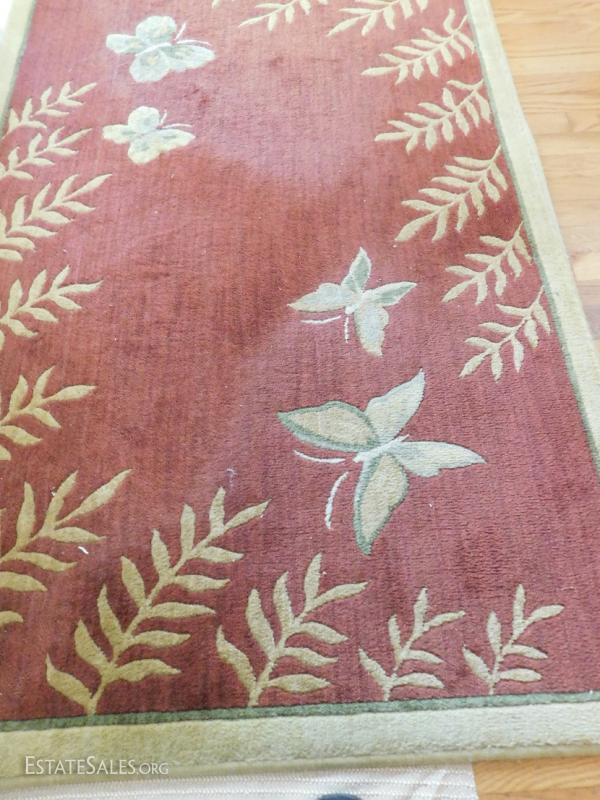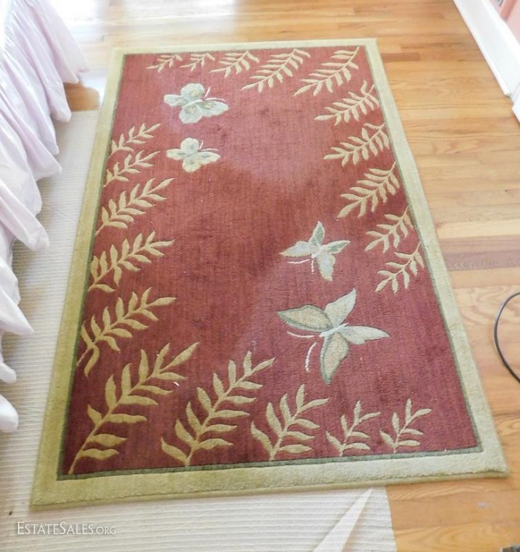 Wool Rug with Butterfly Design 66" x 42" cranberry and cream.. Needs cleaning
