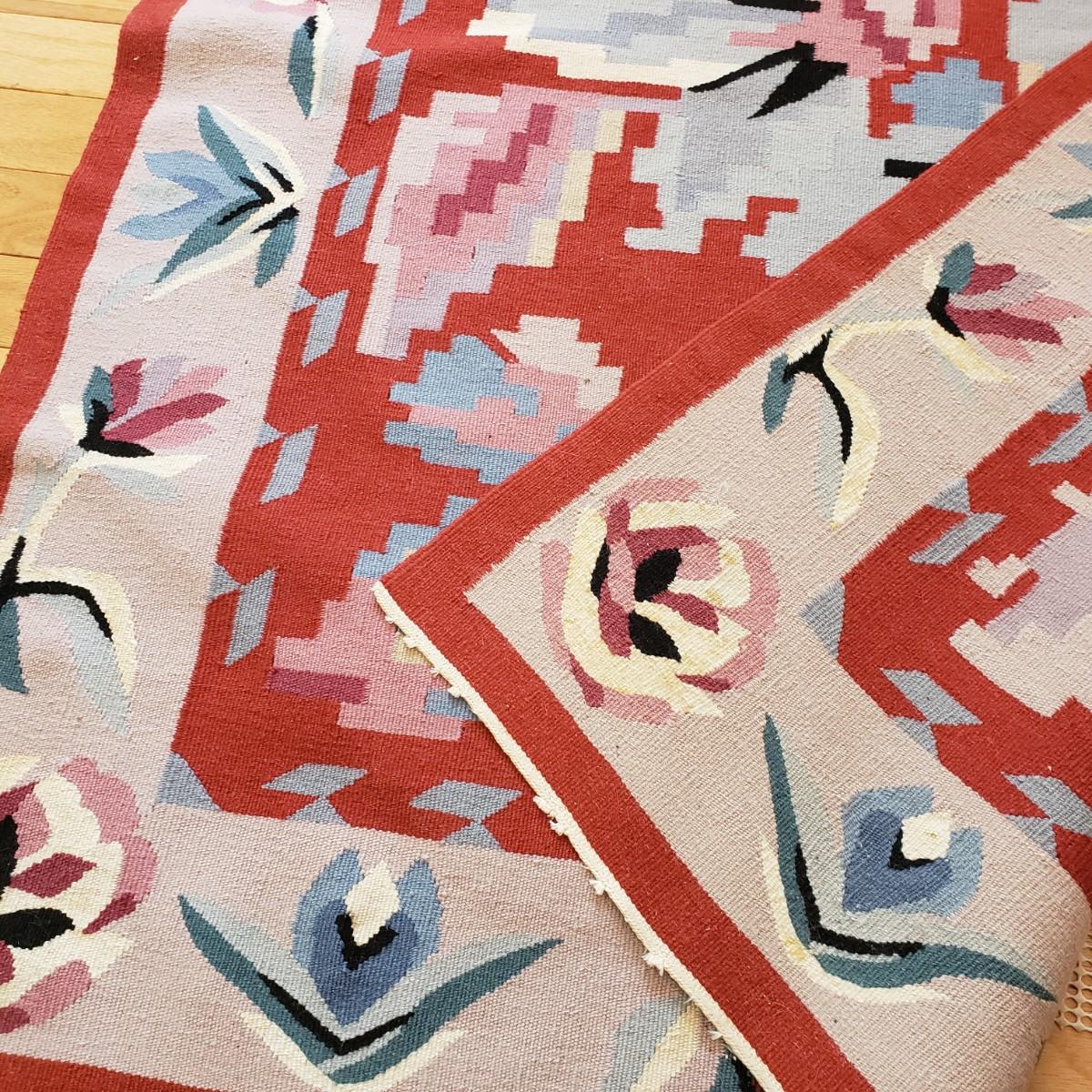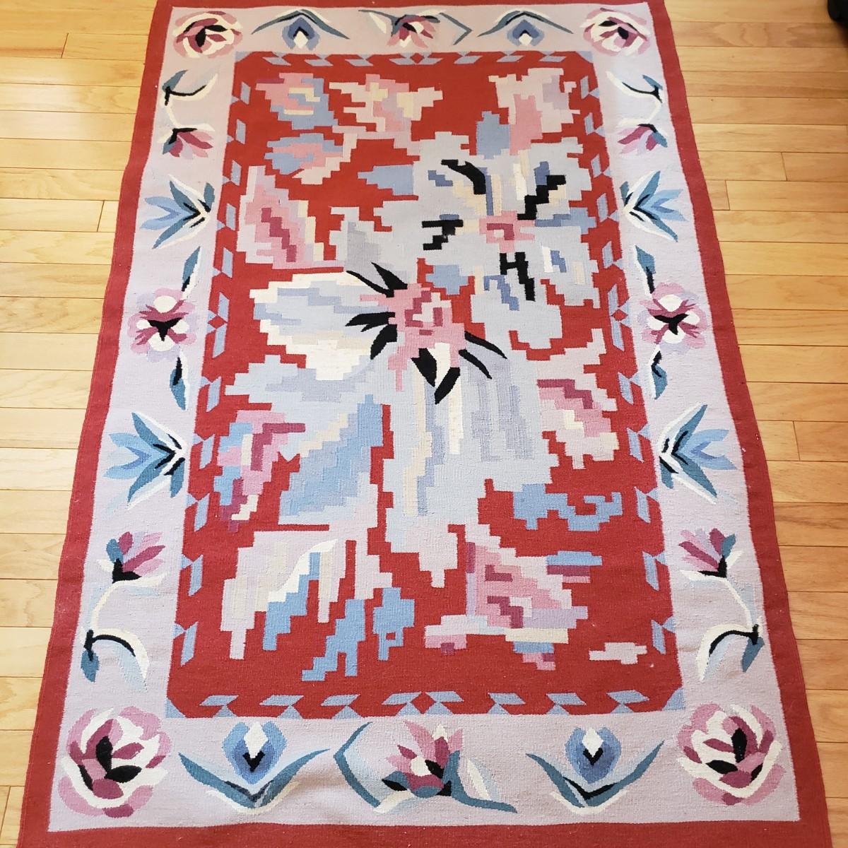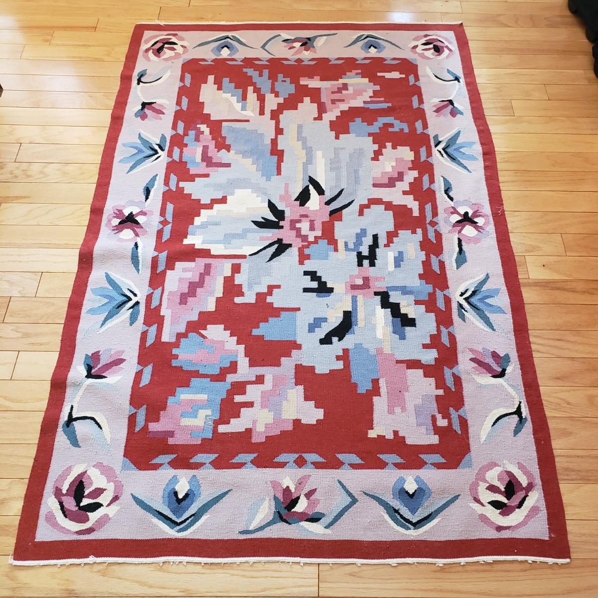 This red, blues, and pinks rug measures 70" x 46" (approx 6' x 4'). This rug is reversible. There is fraying on the ends, yet does not come apart. The one side has some spots on the white parts, see picture. There is no label present to confirm, but the rug looks and feels like wool.