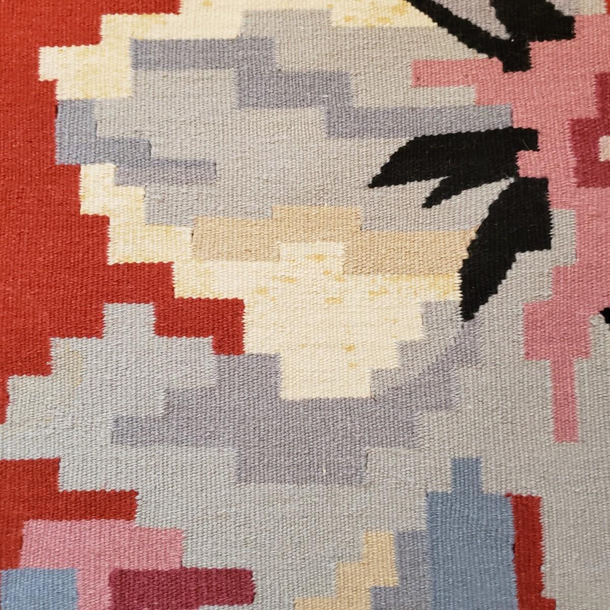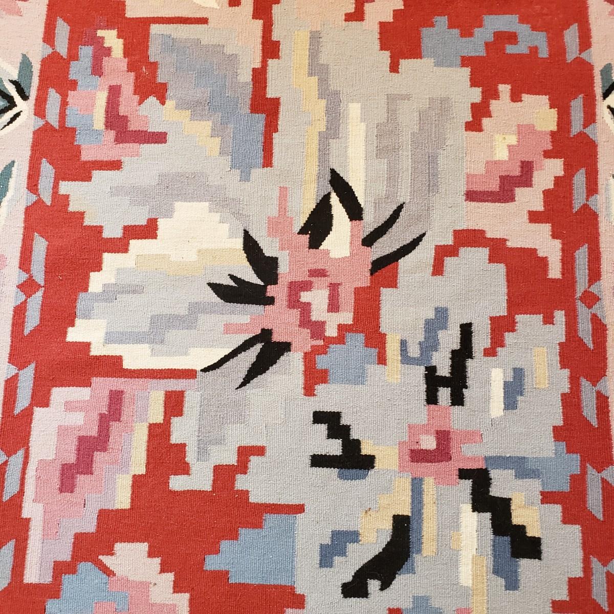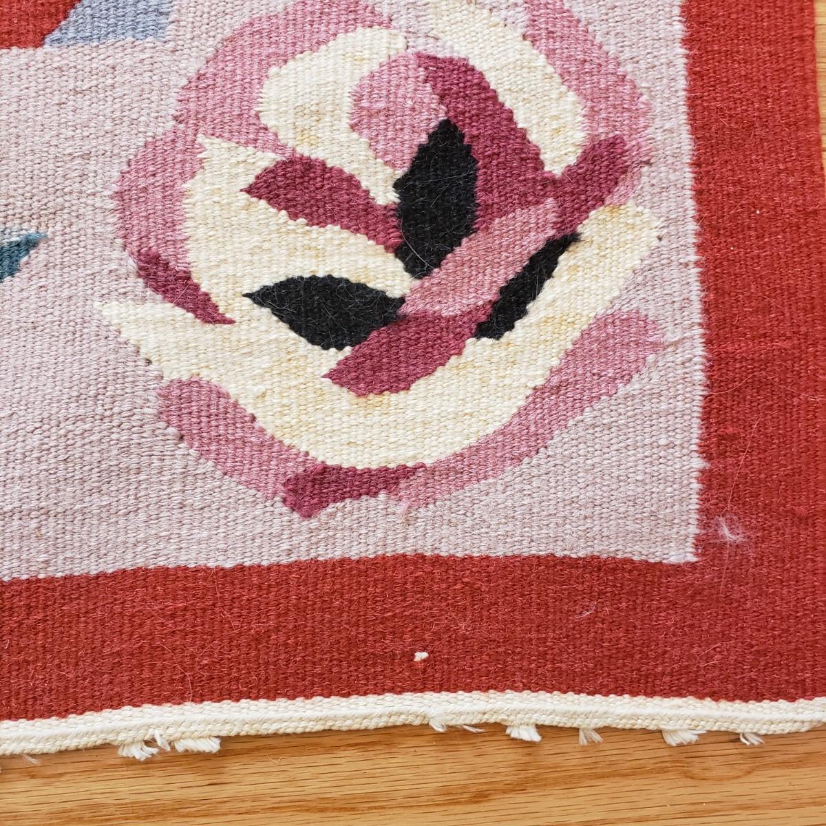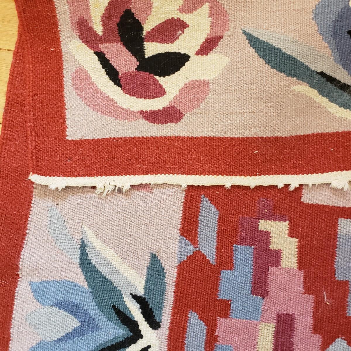 This red, blues, and pinks rug measures 70" x 46" (approx 6' x 4'). This rug is reversible. There is fraying on the ends, yet does not come apart. The one side has some spots on the white parts, see picture. There is no label present to confirm, but the rug looks and feels like wool.