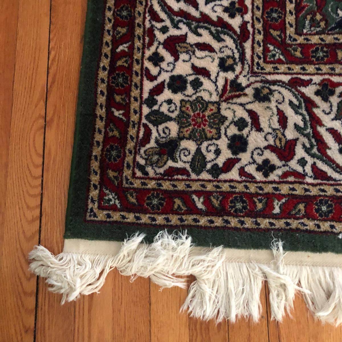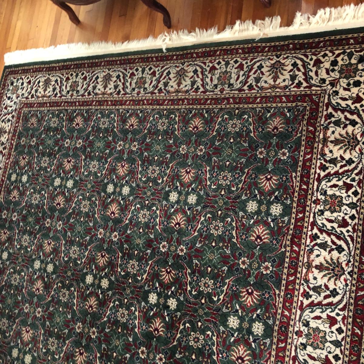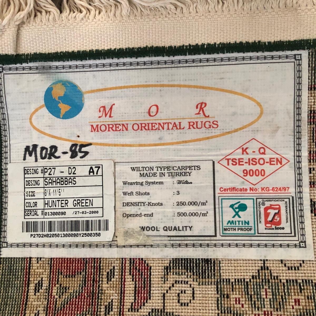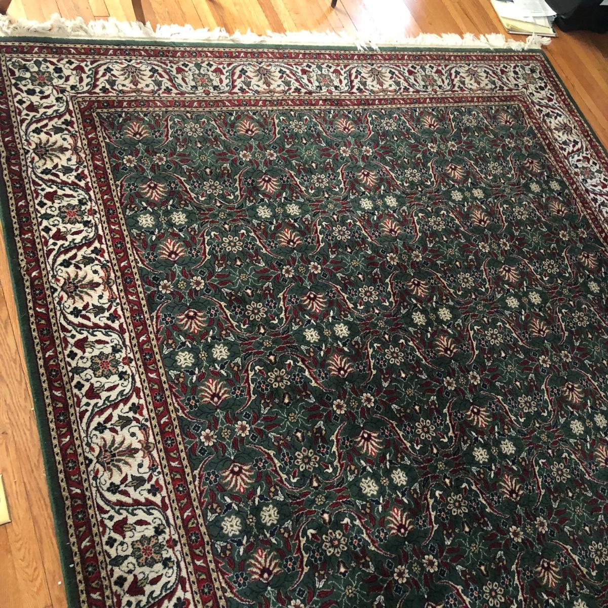 This wool rug was made in Turkey. There are no apparent stains nor odors on the rug although there is a small stain on the fringe. The fringe is all intact and has no frays. It measures 8 feet by 11.5 feet; local pick up only.