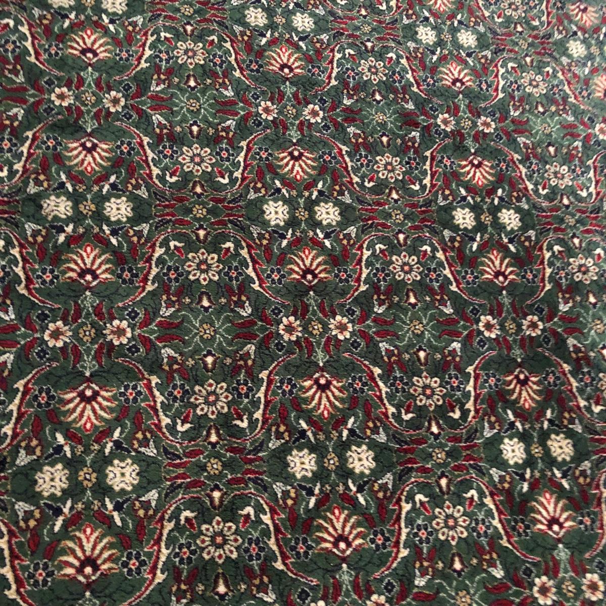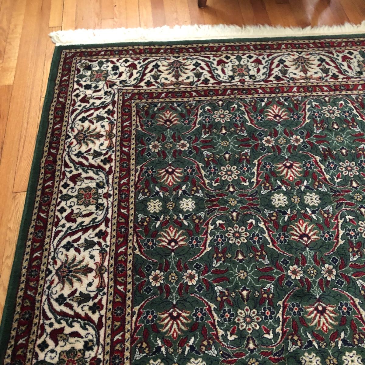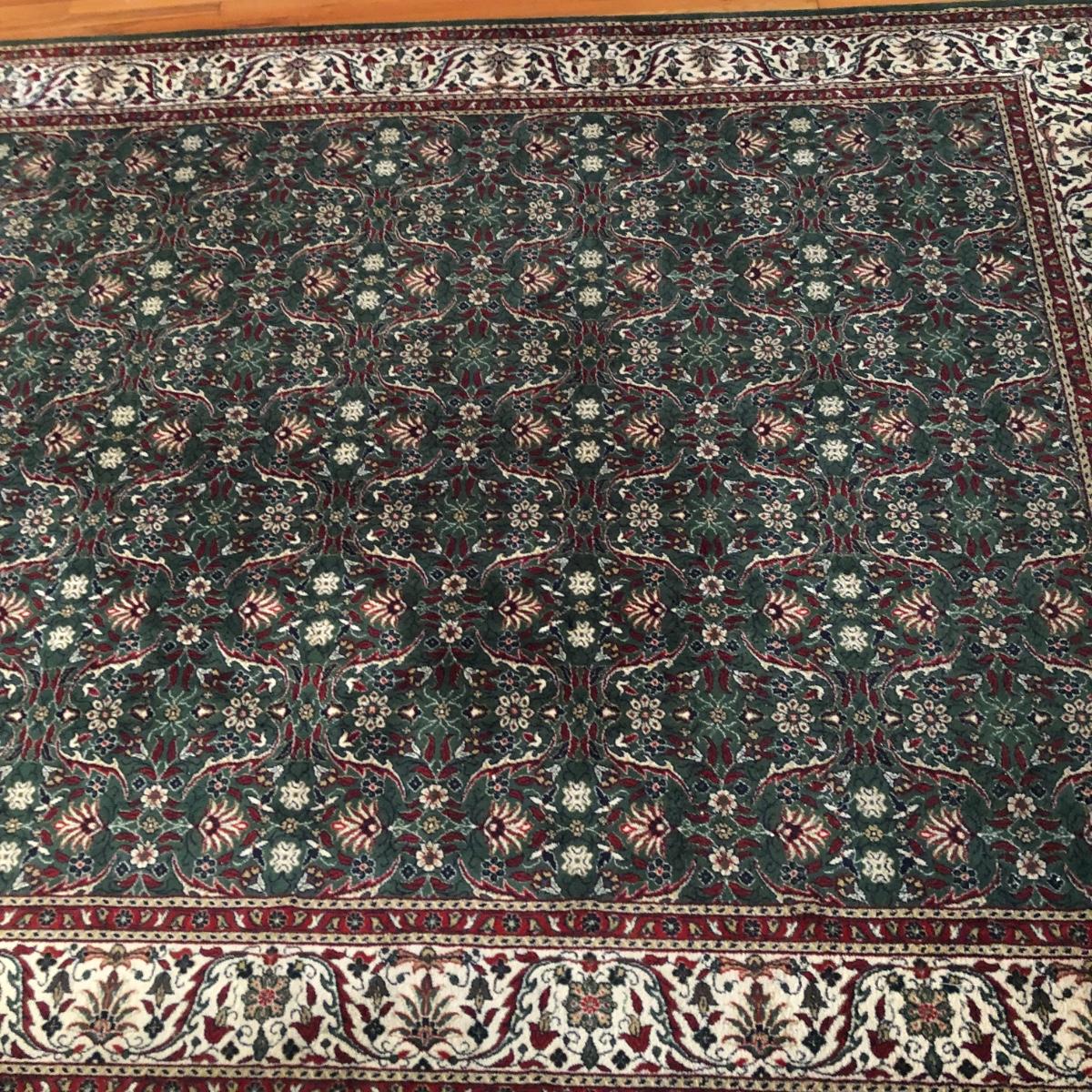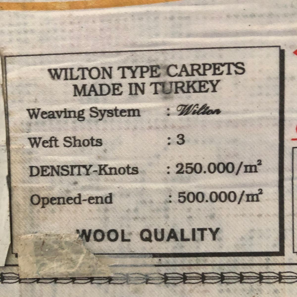This wool rug was made in Turkey. There are no apparent stains nor odors on the rug although there is a small stain on the fringe. The fringe is all intact and has no frays. It measures 8 feet by 11.5 feet; local pick up only.