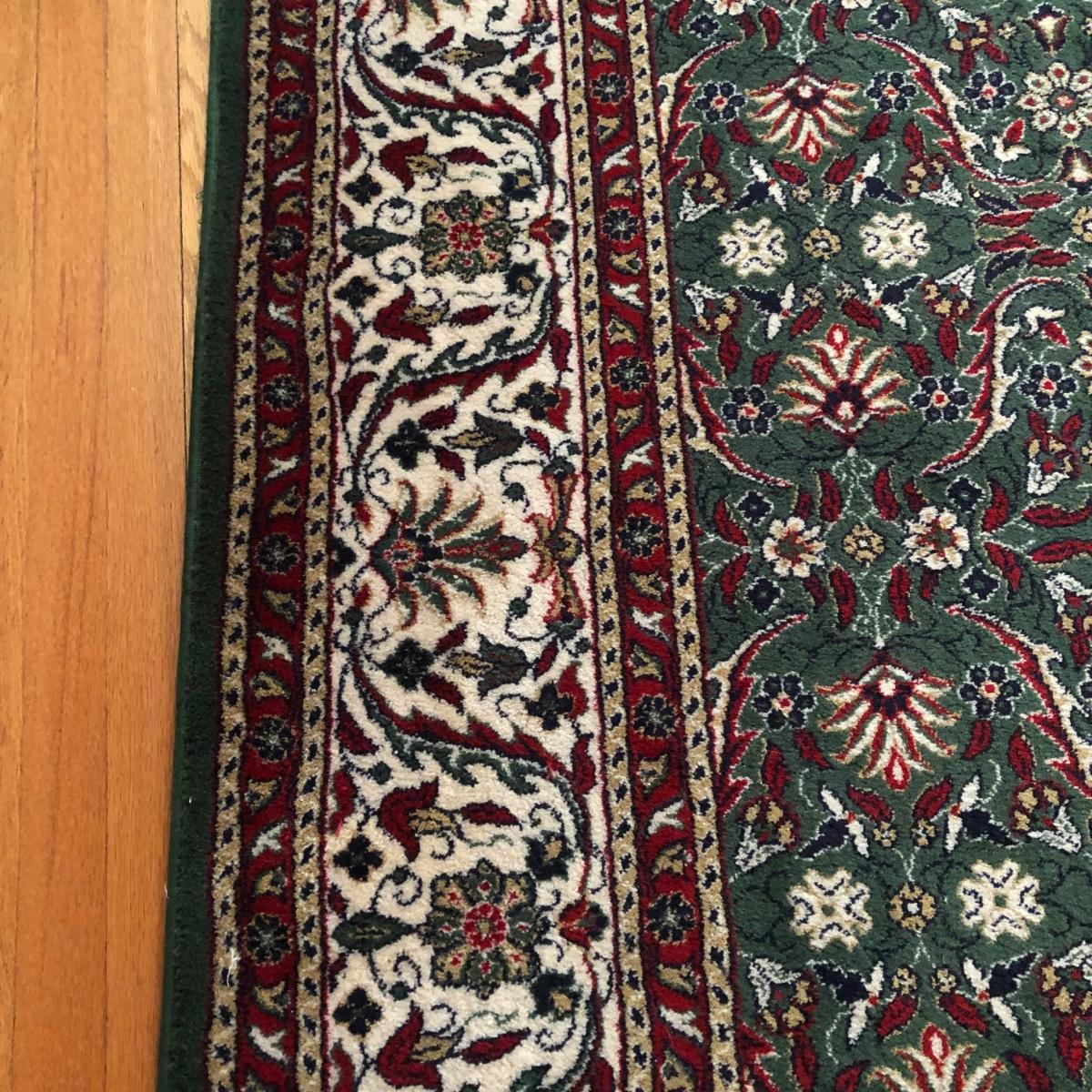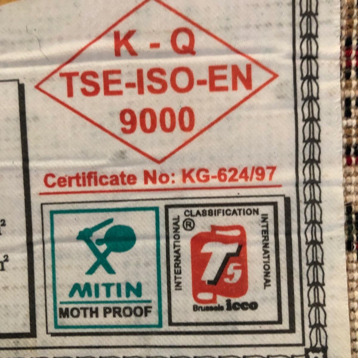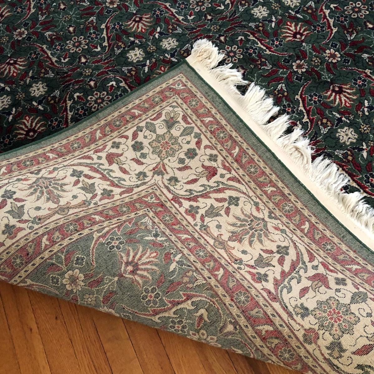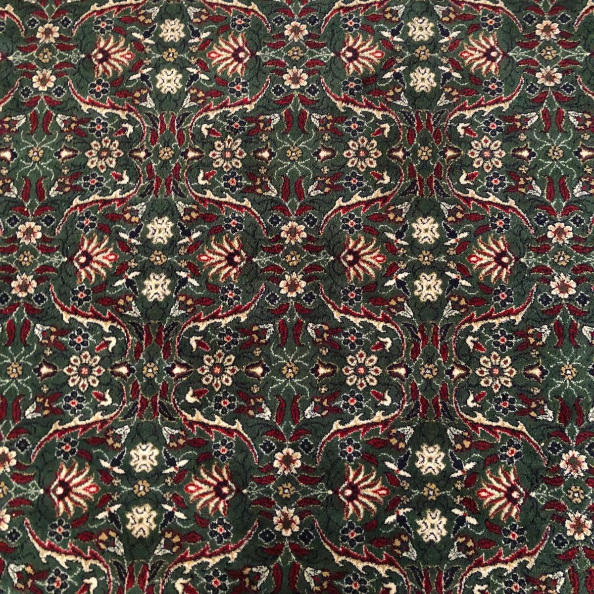 This wool rug was made in Turkey. There are no apparent stains nor odors on the rug although there is a small stain on the fringe. The fringe is all intact and has no frays. It measures 8 feet by 11.5 feet; local pick up only.