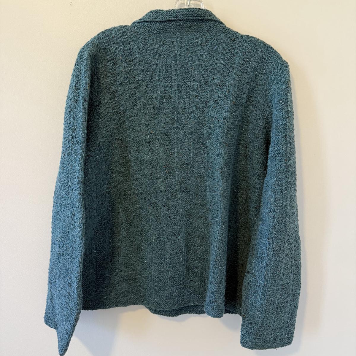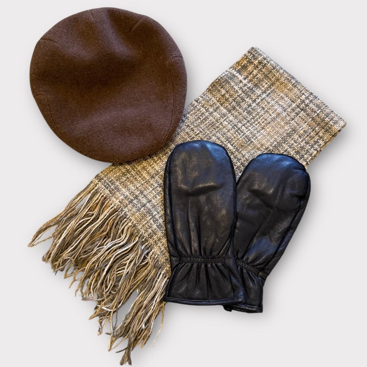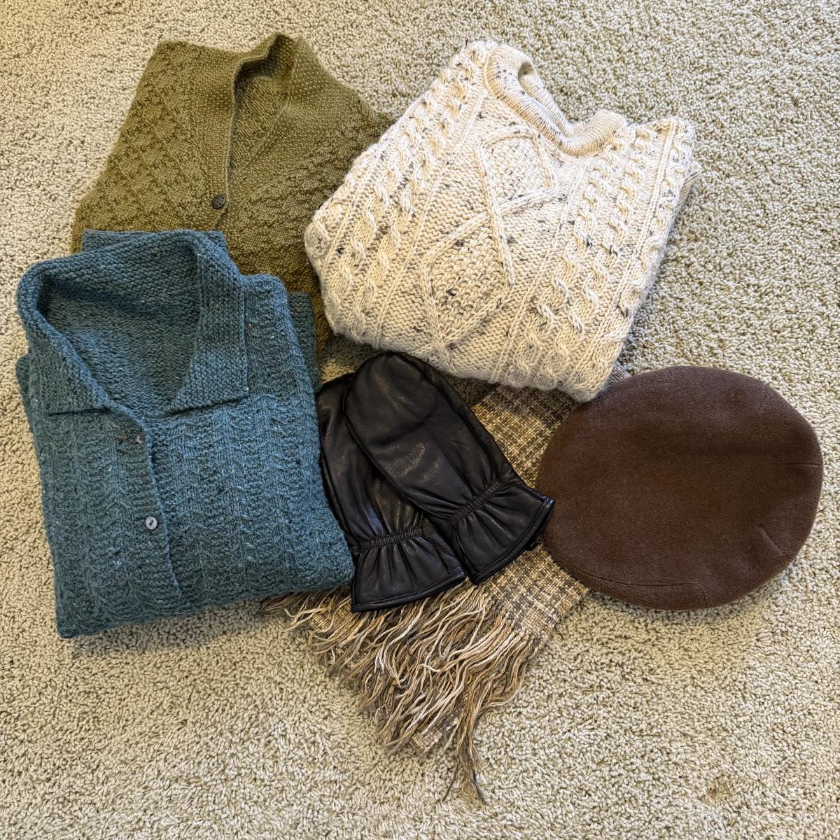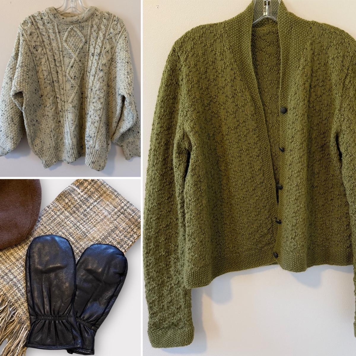Three sweaters, one of which has a “Country Collection” tag and a “100% new wool” tag. The other two are button down cardigans that appear to be handmade. They have no tags, but feel like wool and fit about a size L/XL. A button on the teal cardigan has loose threads. Also included are a pair of Intercontinental Leathern Industries leather mittens (with finger separators inside), a Firenze wool newsboy style hat, and a scarf. Hangers are not included.