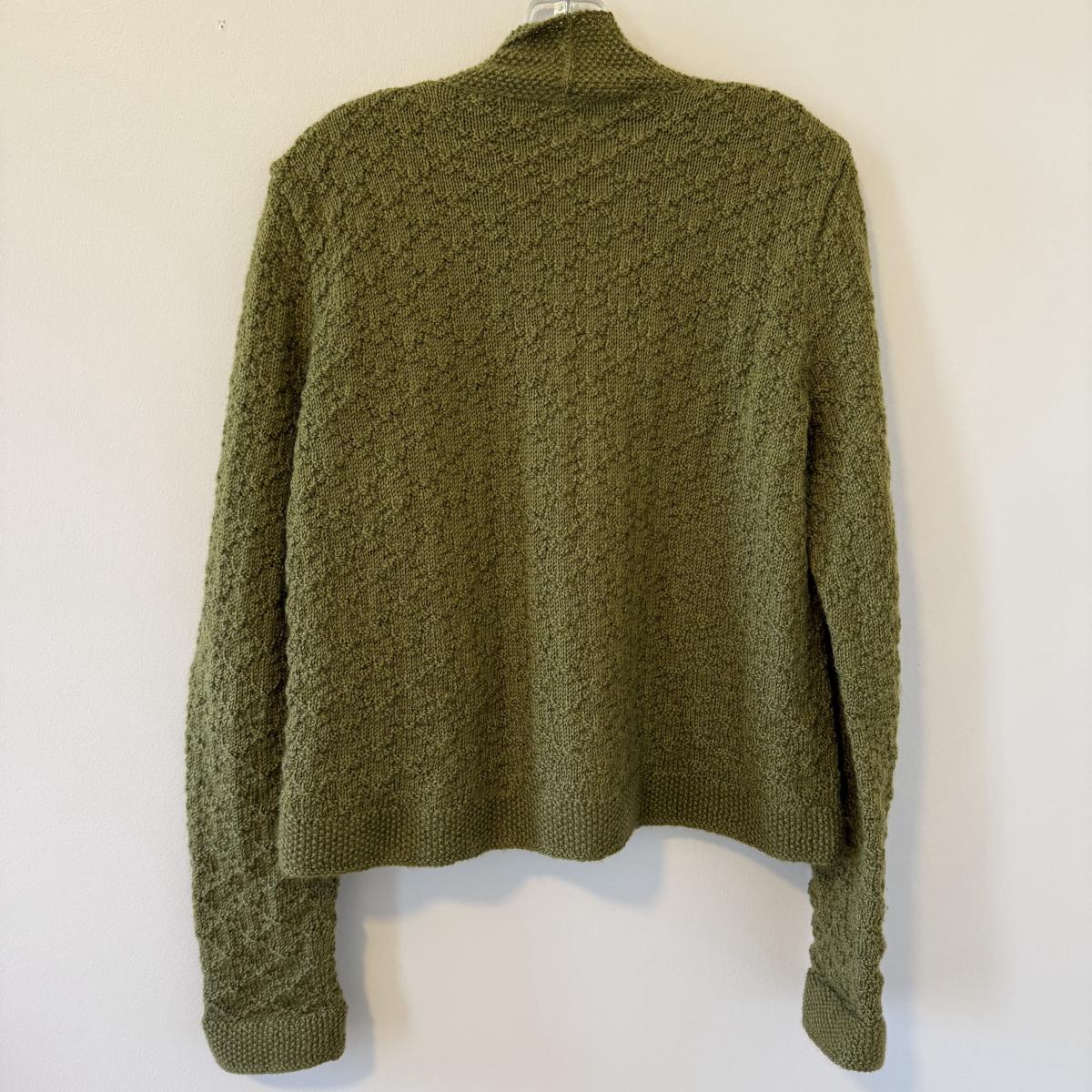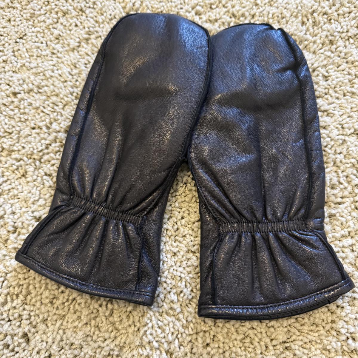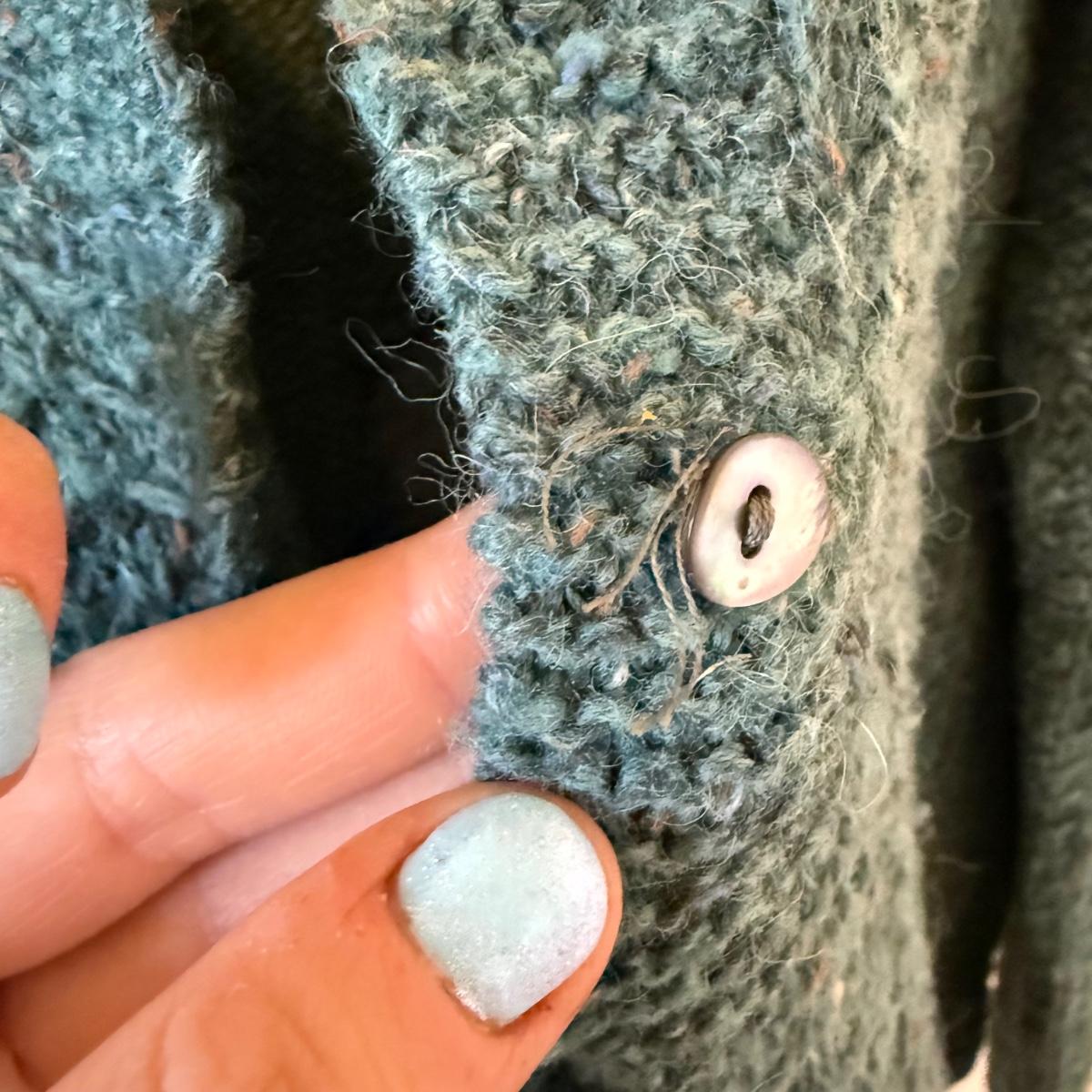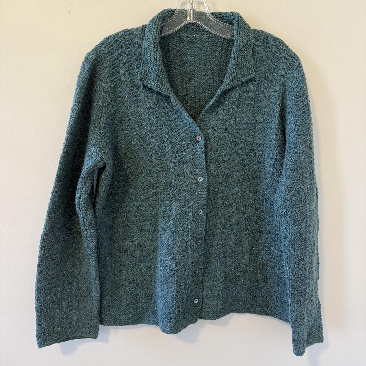 Three sweaters, one of which has a “Country Collection” tag and a “100% new wool” tag. The other two are button down cardigans that appear to be handmade. They have no tags, but feel like wool and fit about a size L/XL. A button on the teal cardigan has loose threads. Also included are a pair of Intercontinental Leathern Industries leather mittens (with finger separators inside), a Firenze wool newsboy style hat, and a scarf. Hangers are not included.