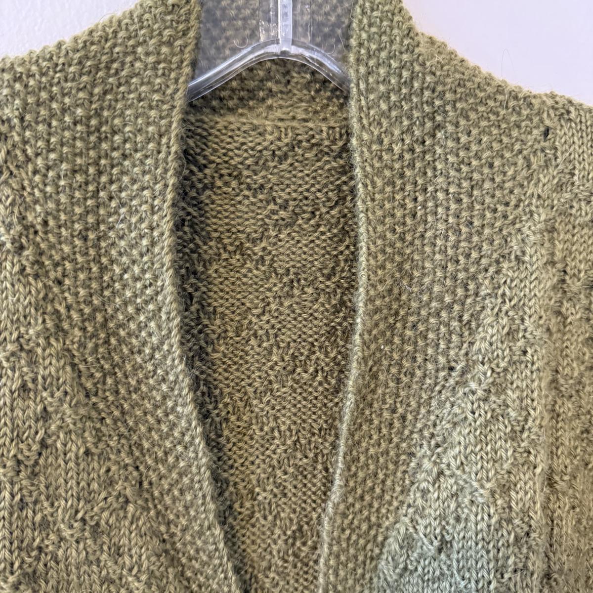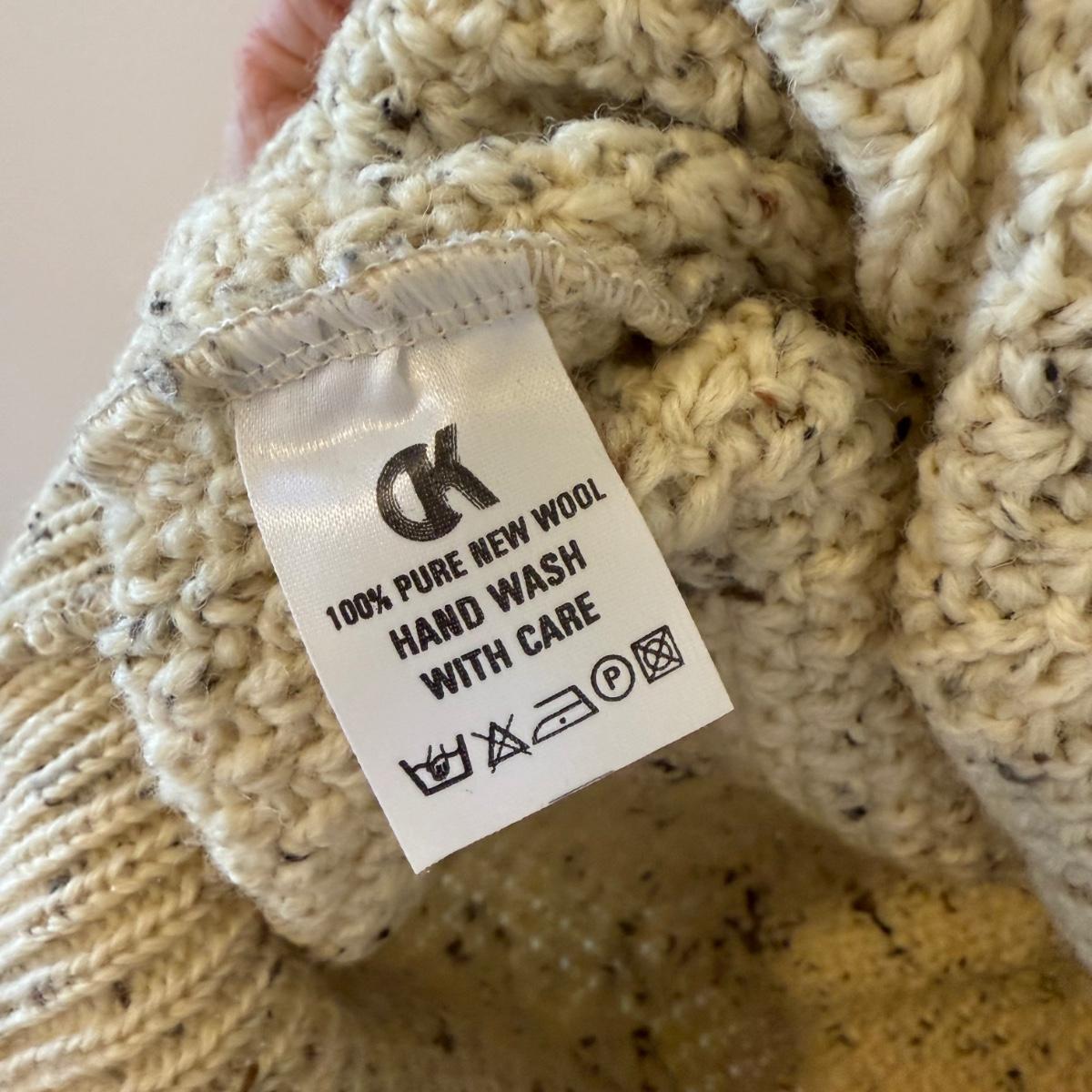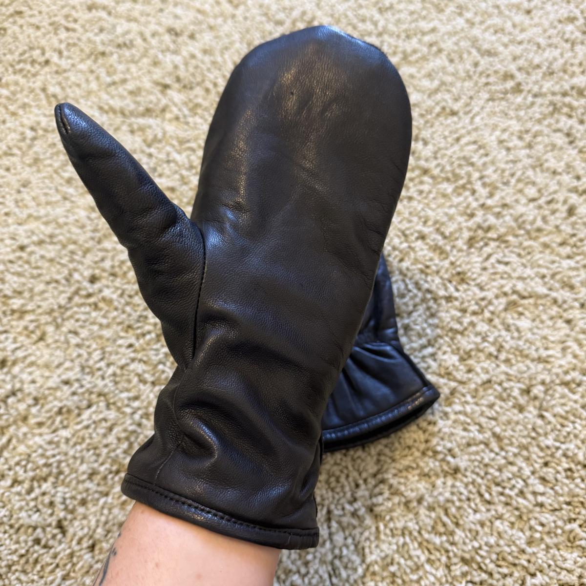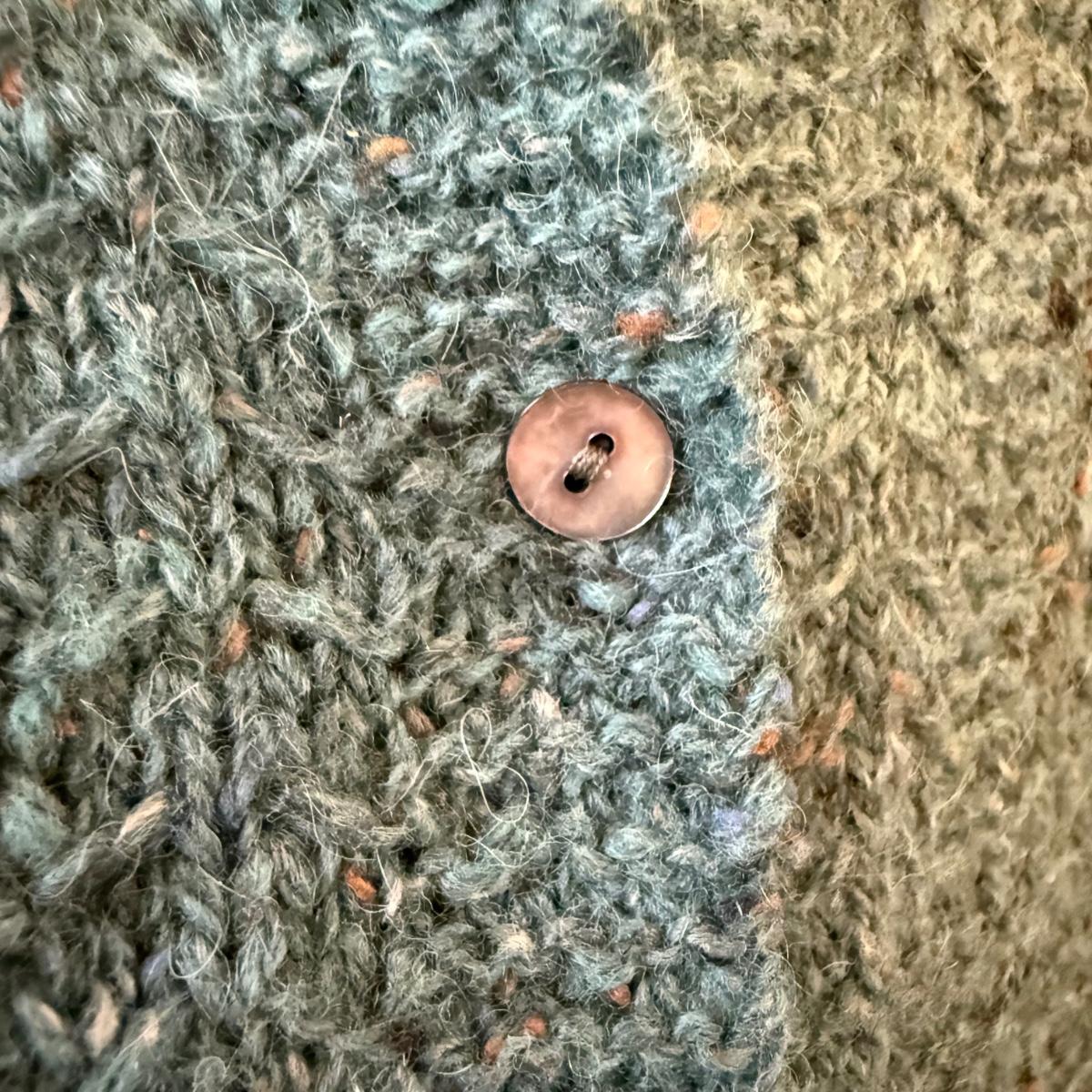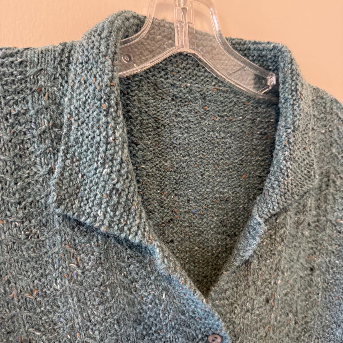 Three sweaters, one of which has a “Country Collection” tag and a “100% new wool” tag. The other two are button down cardigans that appear to be handmade. They have no tags, but feel like wool and fit about a size L/XL. A button on the teal cardigan has loose threads. Also included are a pair of Intercontinental Leathern Industries leather mittens (with finger separators inside), a Firenze wool newsboy style hat, and a scarf. Hangers are not included.