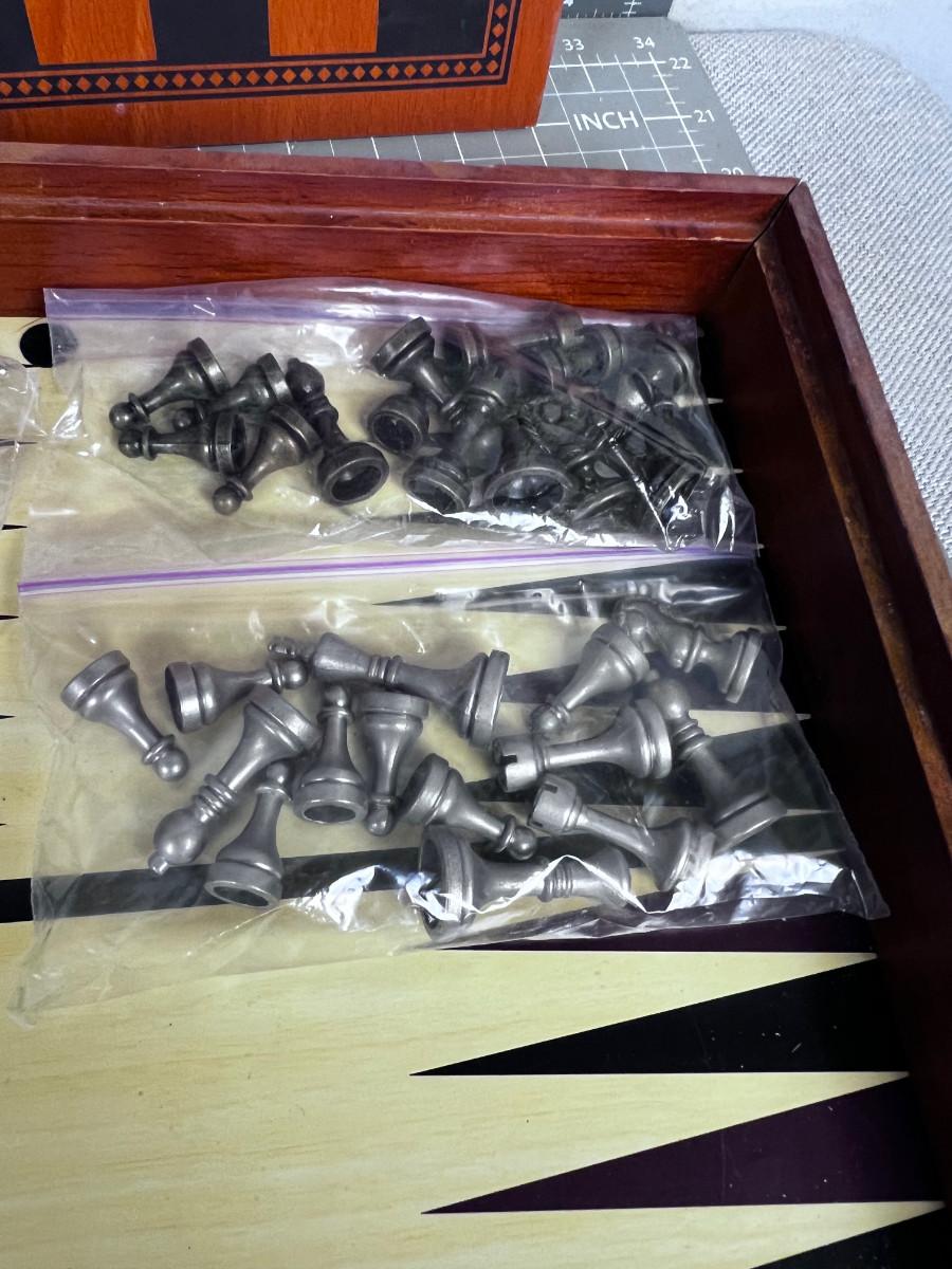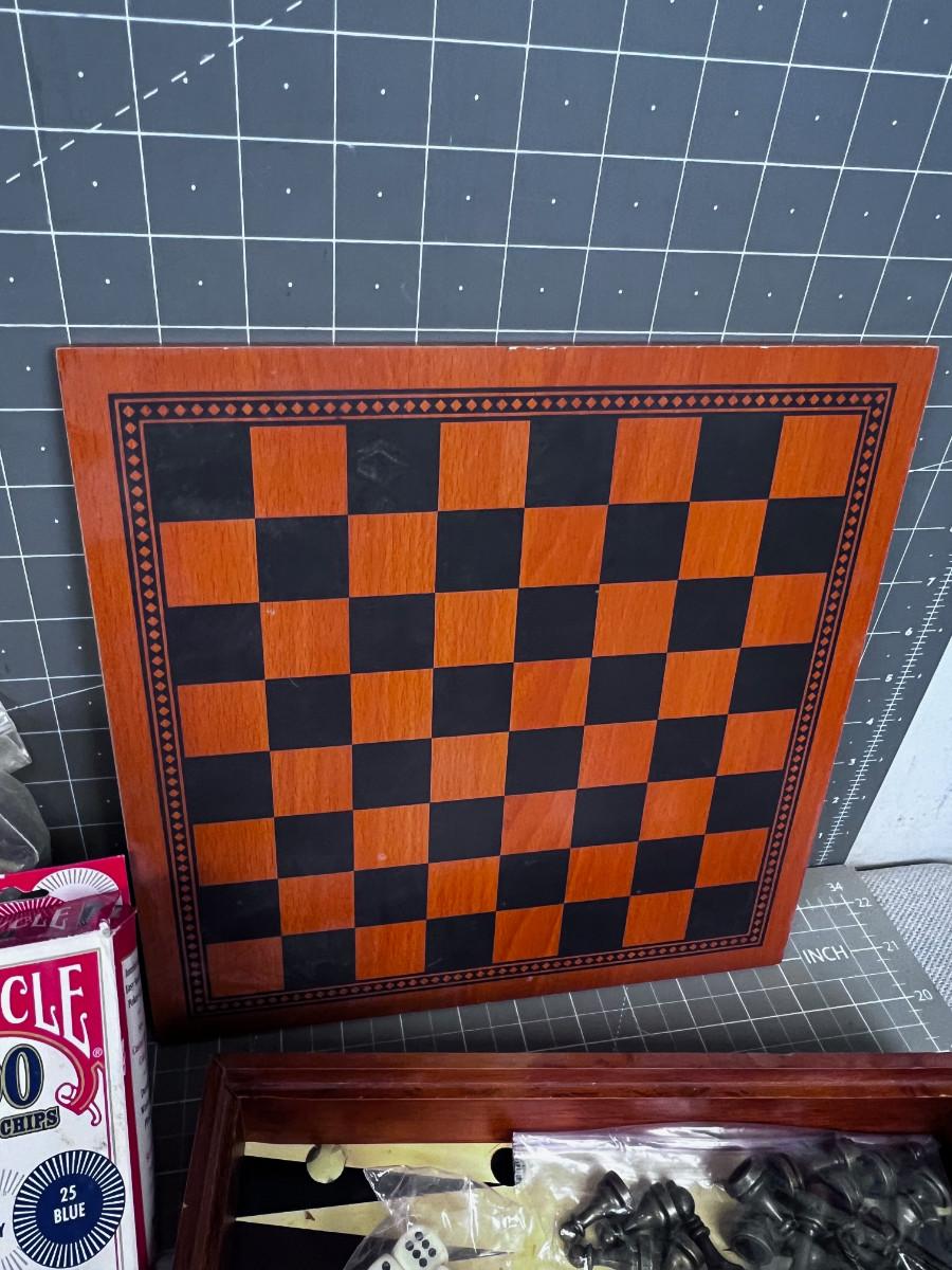 Used and Usable. Wood chess set is not complete, but the wood board/box is nice.