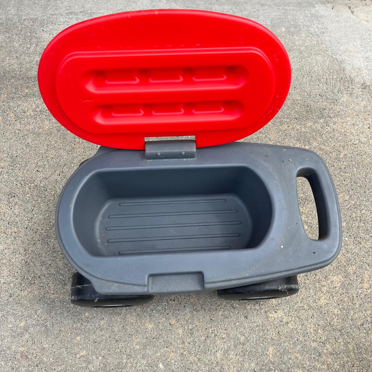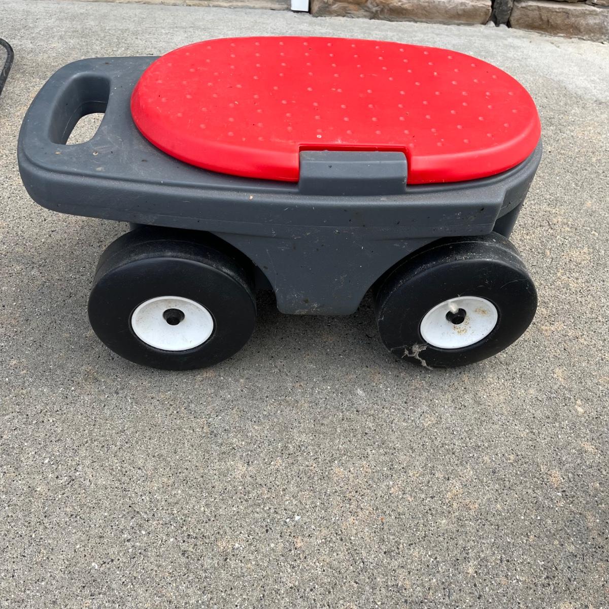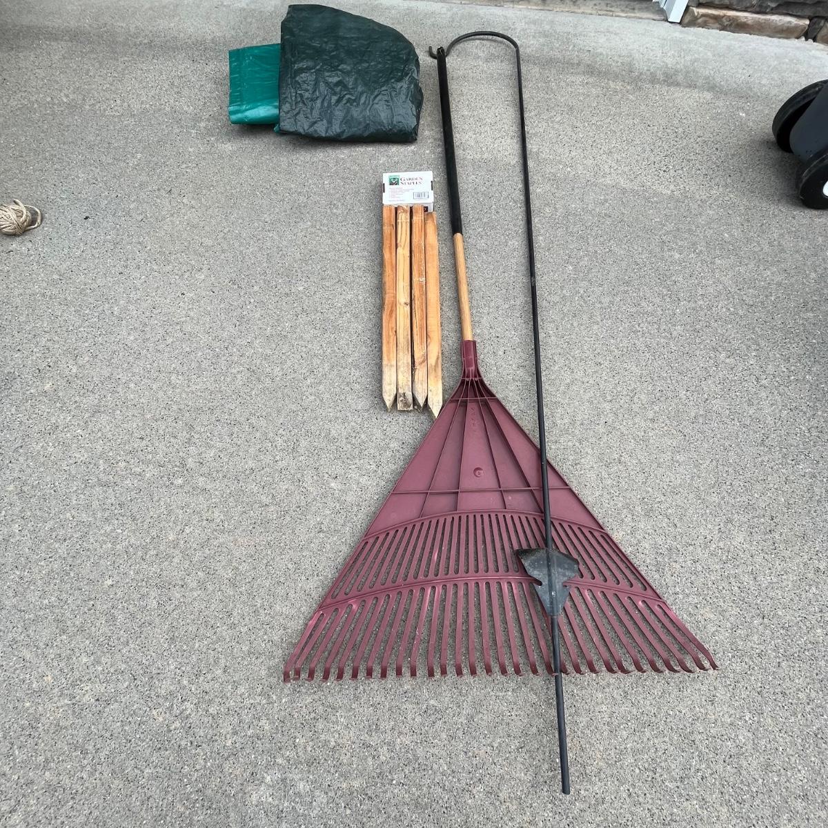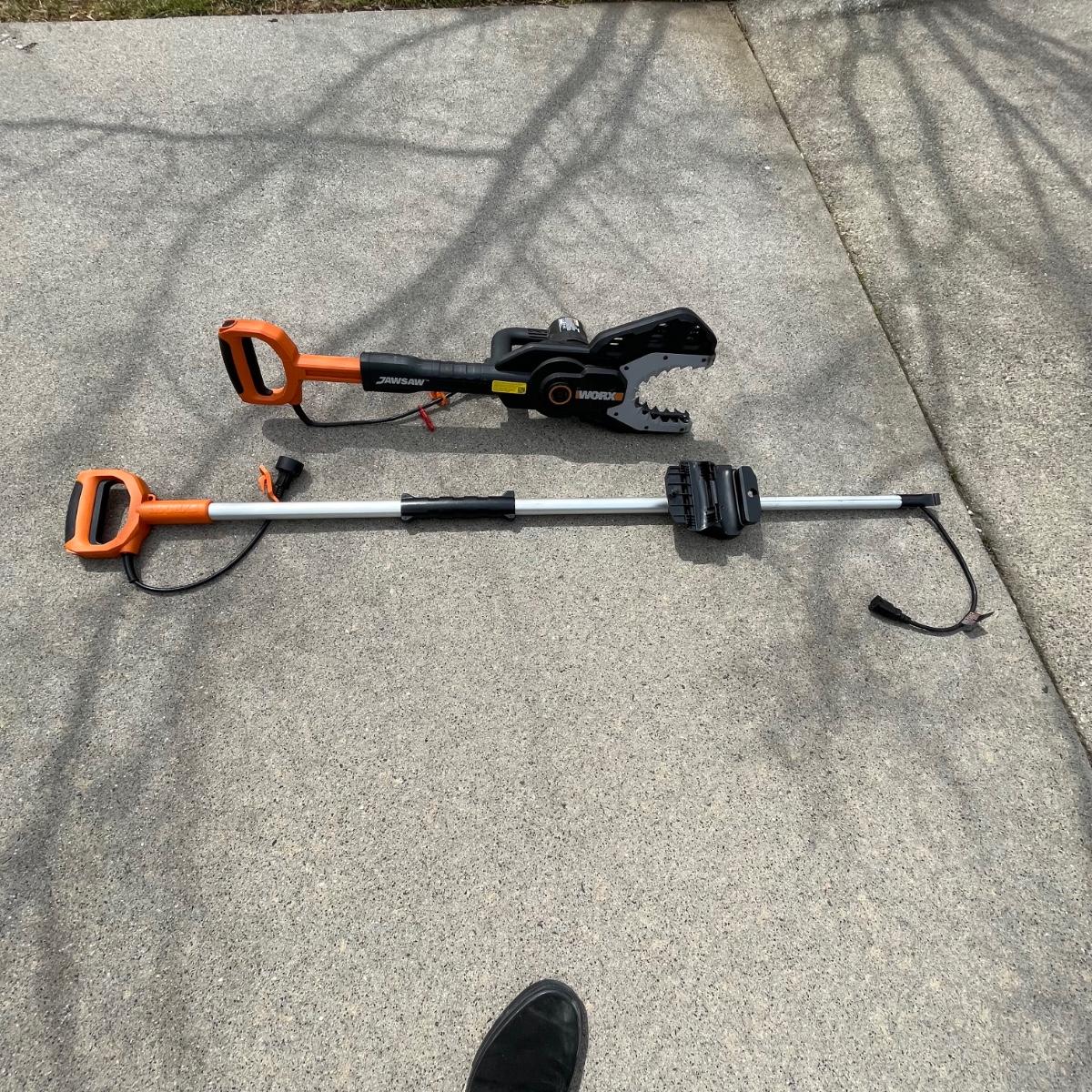 Lot includes a Worx Jawsaw with extension handle , Scotts hand seeder, plastic rake, tarps, shepherds hook, garden staples and a Step 2 rolling garden seat with storage. Jawsaw was not tested as we didn’t have extension cord.