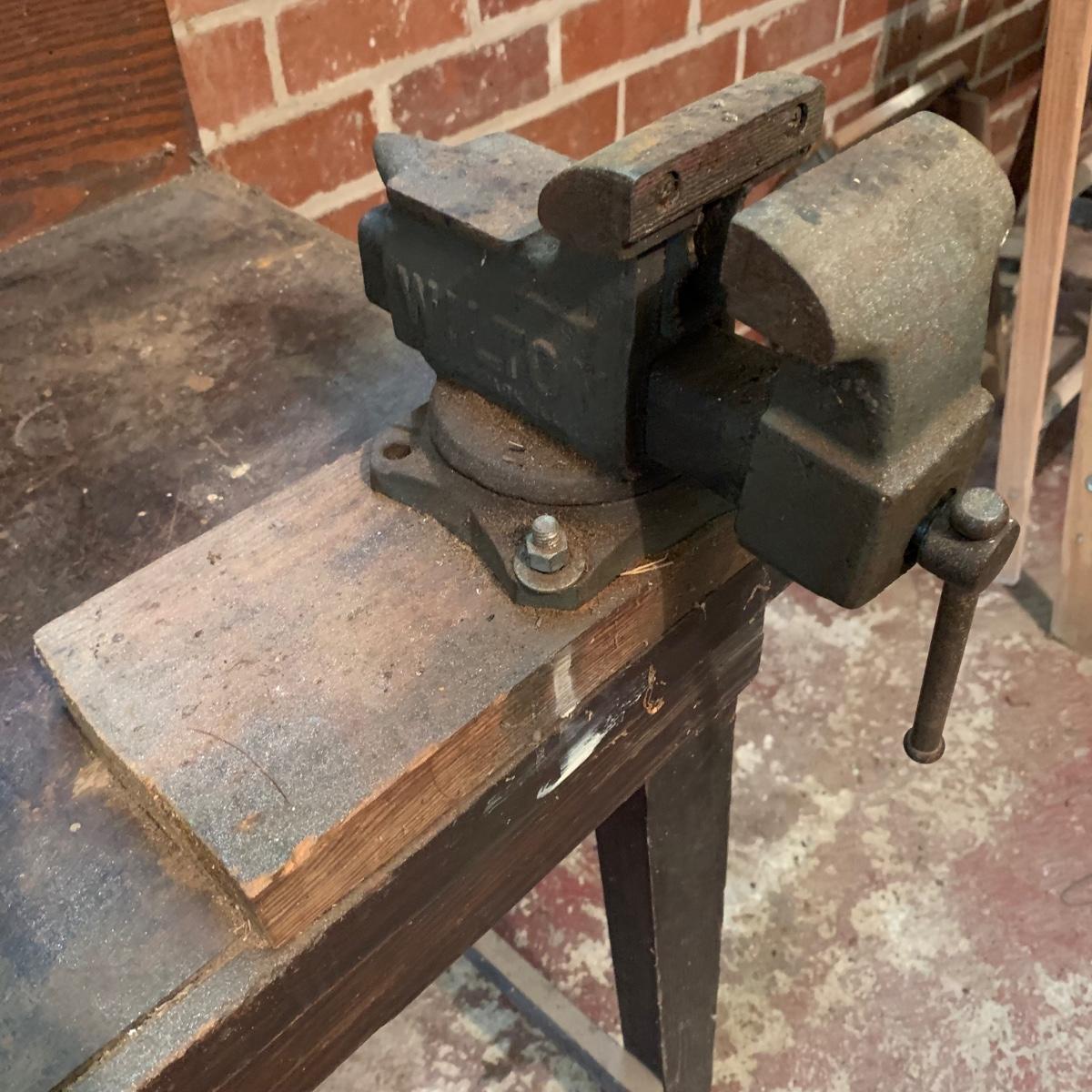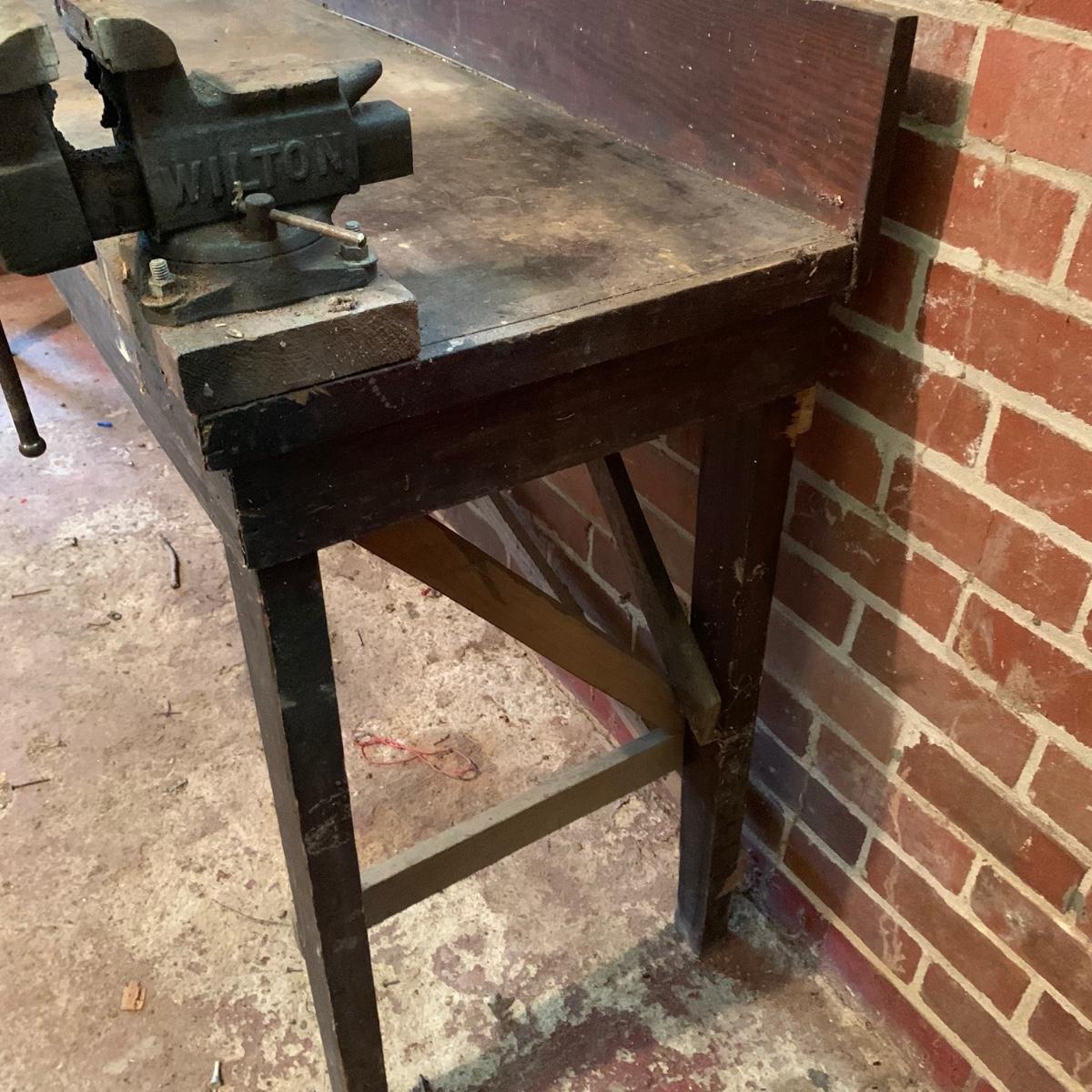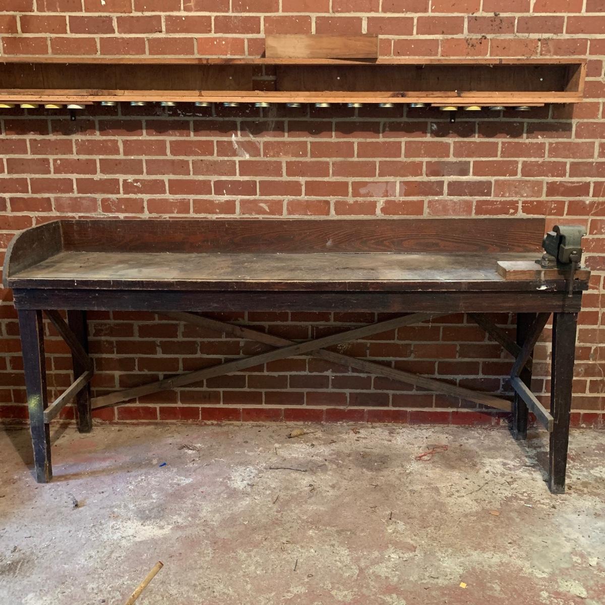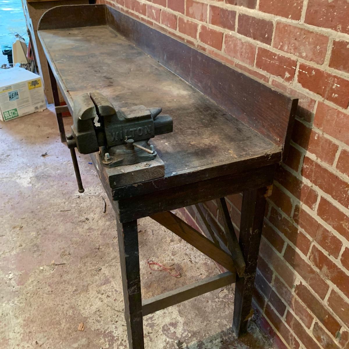 Solid wooden work bench with a layer of manufactured wood on its top surface. It is very sturdy. The table measures 84” x 21” x 40.5”. The table surface height is 34”. A Wilton vise is bolted onto the table. Both items are worn on the surface, but structurally in very good condition. Local pickup only. The winning bidder will need to bring help to move this item, as it is quite large and heavy.